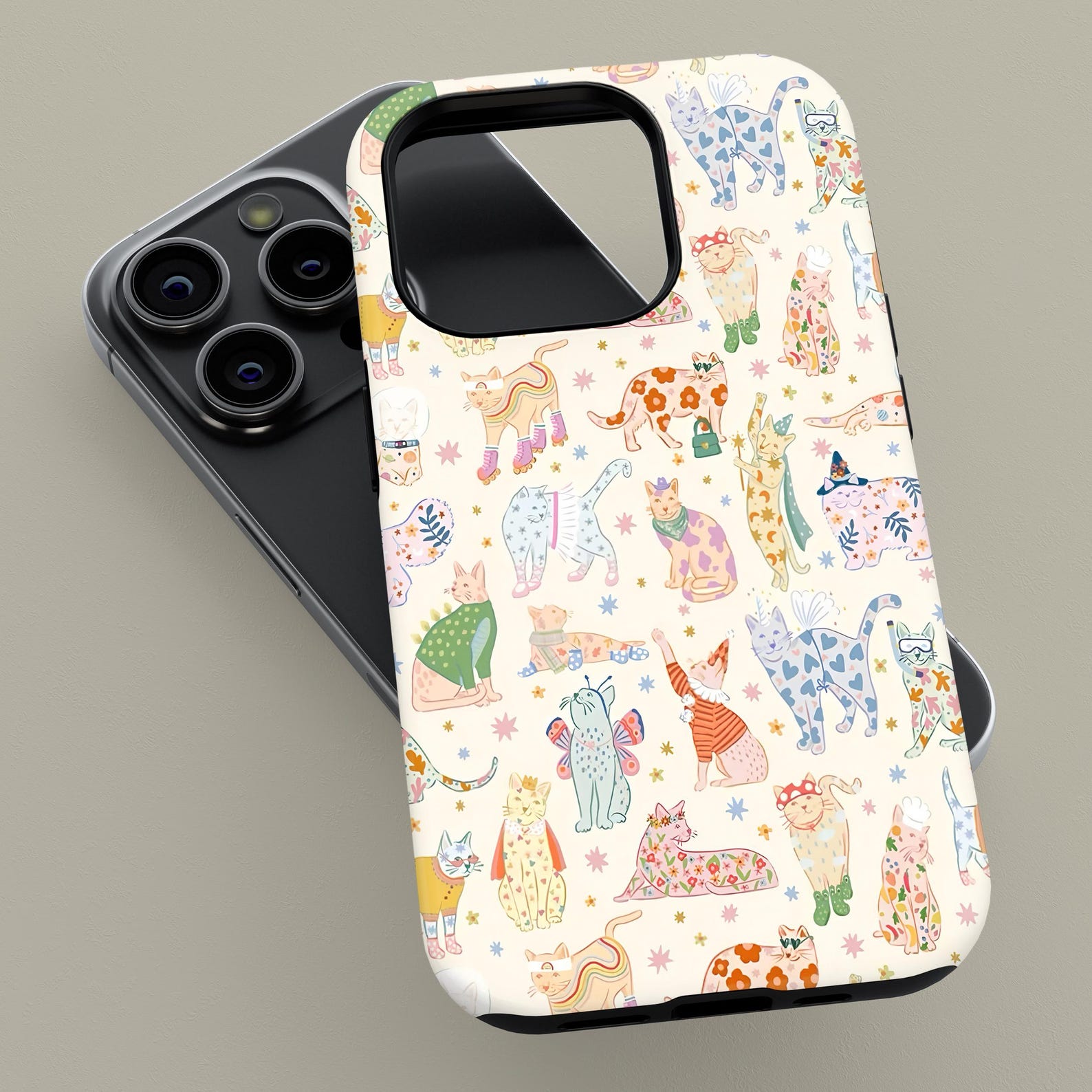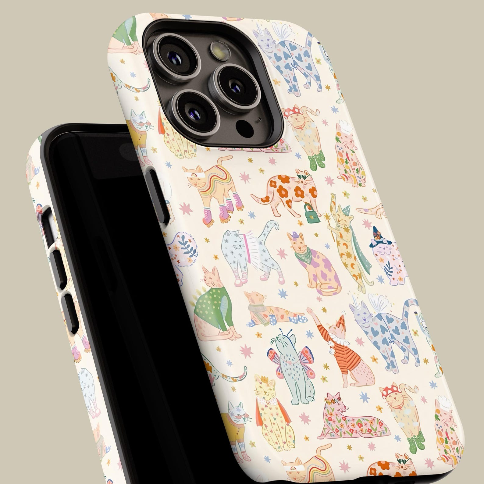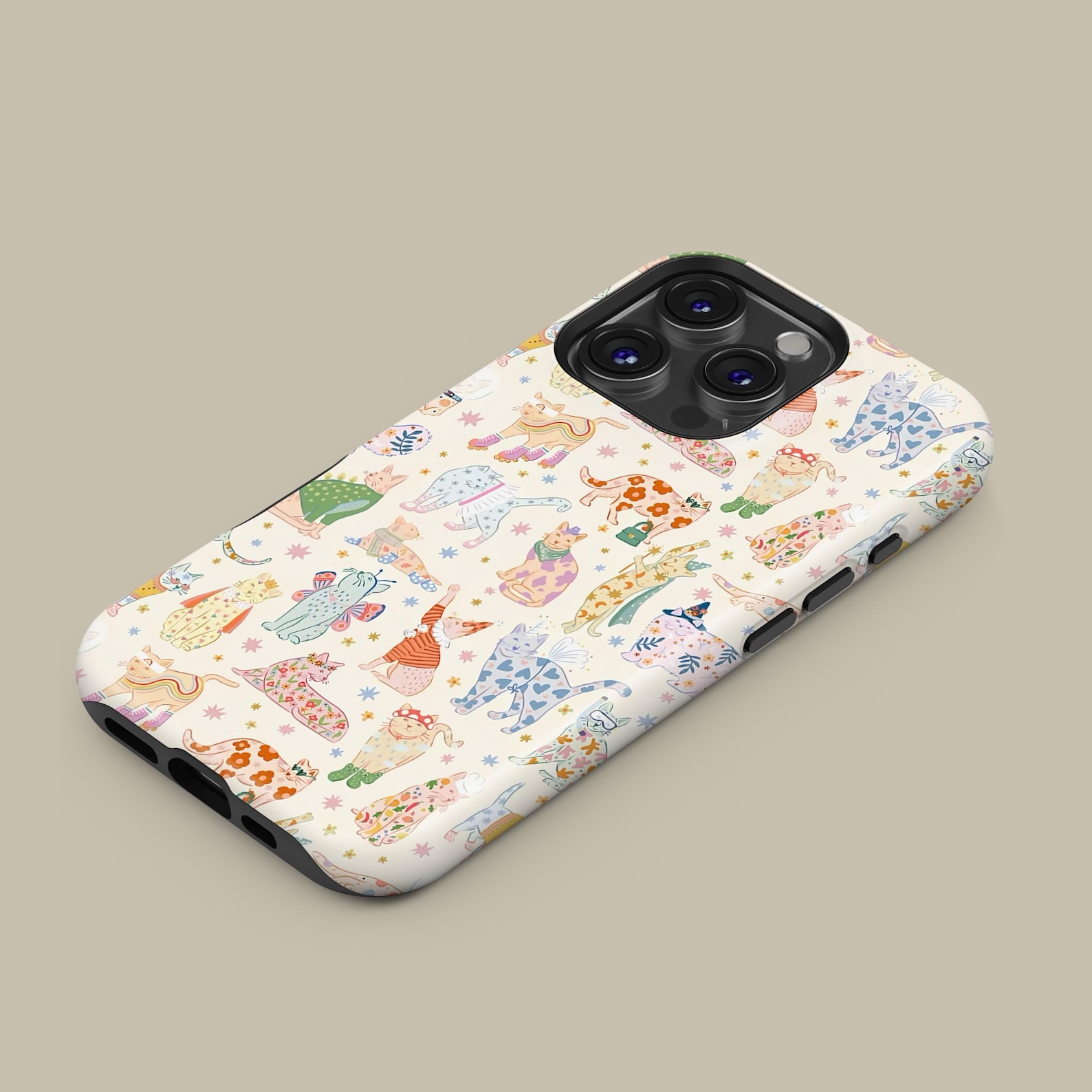 This tough phone case features a whimsical collection of playful cats, each illustrated in vibrant colors. The light cream background perfectly enhances the cheerful, artistic charm of the design. Made from durable materials, this case is both shockproof and stylish, ensuring protection without sacrificing flair. Whether you’re a cat lover or just looking for a fun accessory, this case brings a modern and lighthearted vibe to any look.