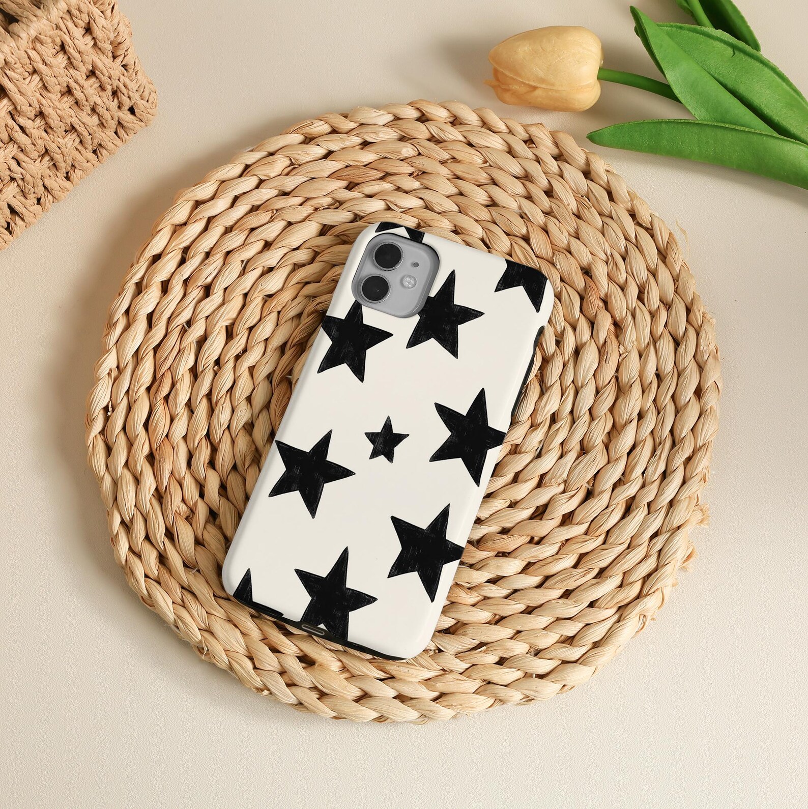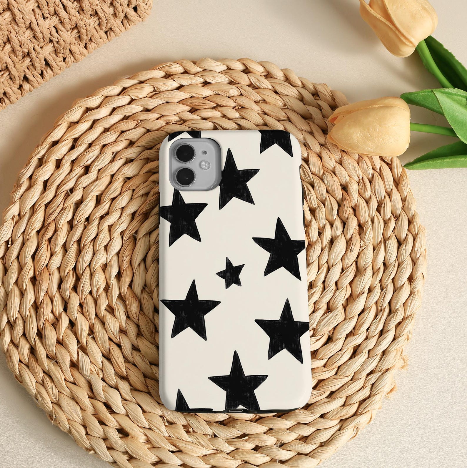 This phone case features a striking black star pattern against a creamy background, offering a stylish and trendy aesthetic. The design captures a playful vibe, perfect for those who want to stand out. Made from durable materials, it provides shockproof protection while maintaining a sleek look. The matte finish adds a sophisticated touch, making it ideal for everyday use.