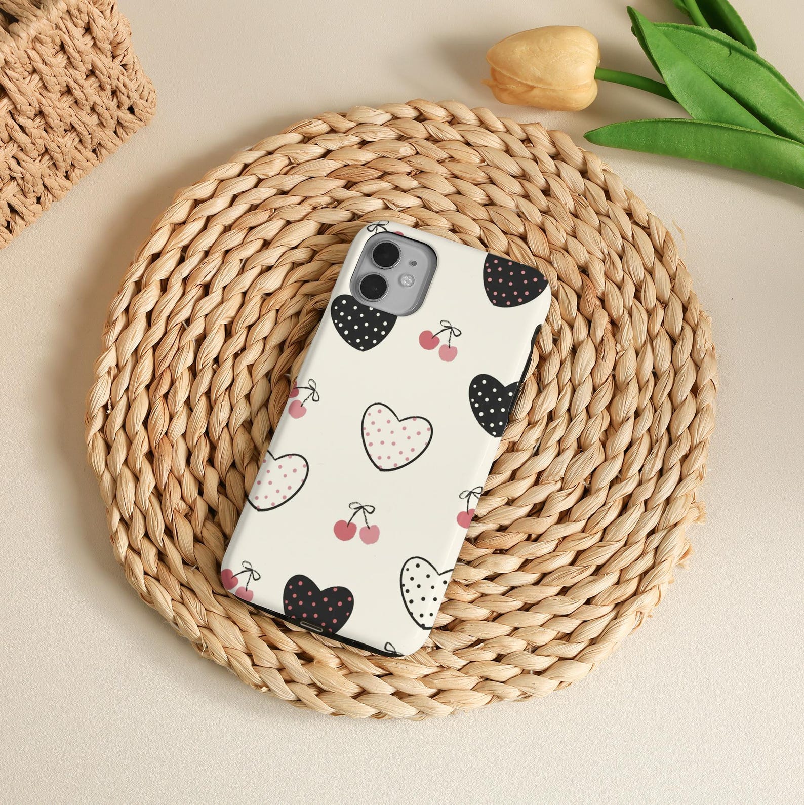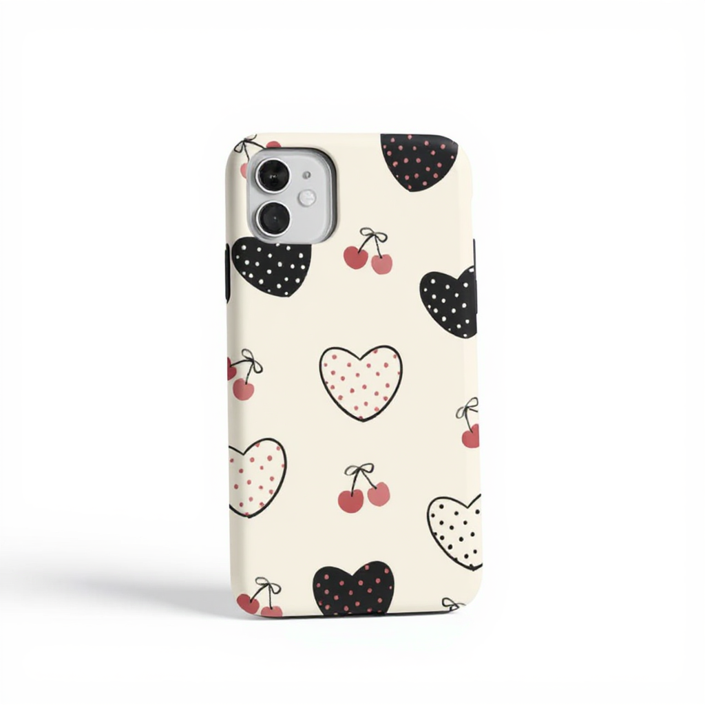 Embrace a playful vibe with this charming phone case featuring a delightful pattern of cherries and hearts. The soft pastel color palette combines creamy whites with hints of pink and black, creating a warm and inviting aesthetic. Crafted from durable materials, this case offers a matte finish that feels great in hand while providing robust shockproof protection. Perfect for bringing a touch of whimsy to your everyday essentials, this case is both stylish and functional.