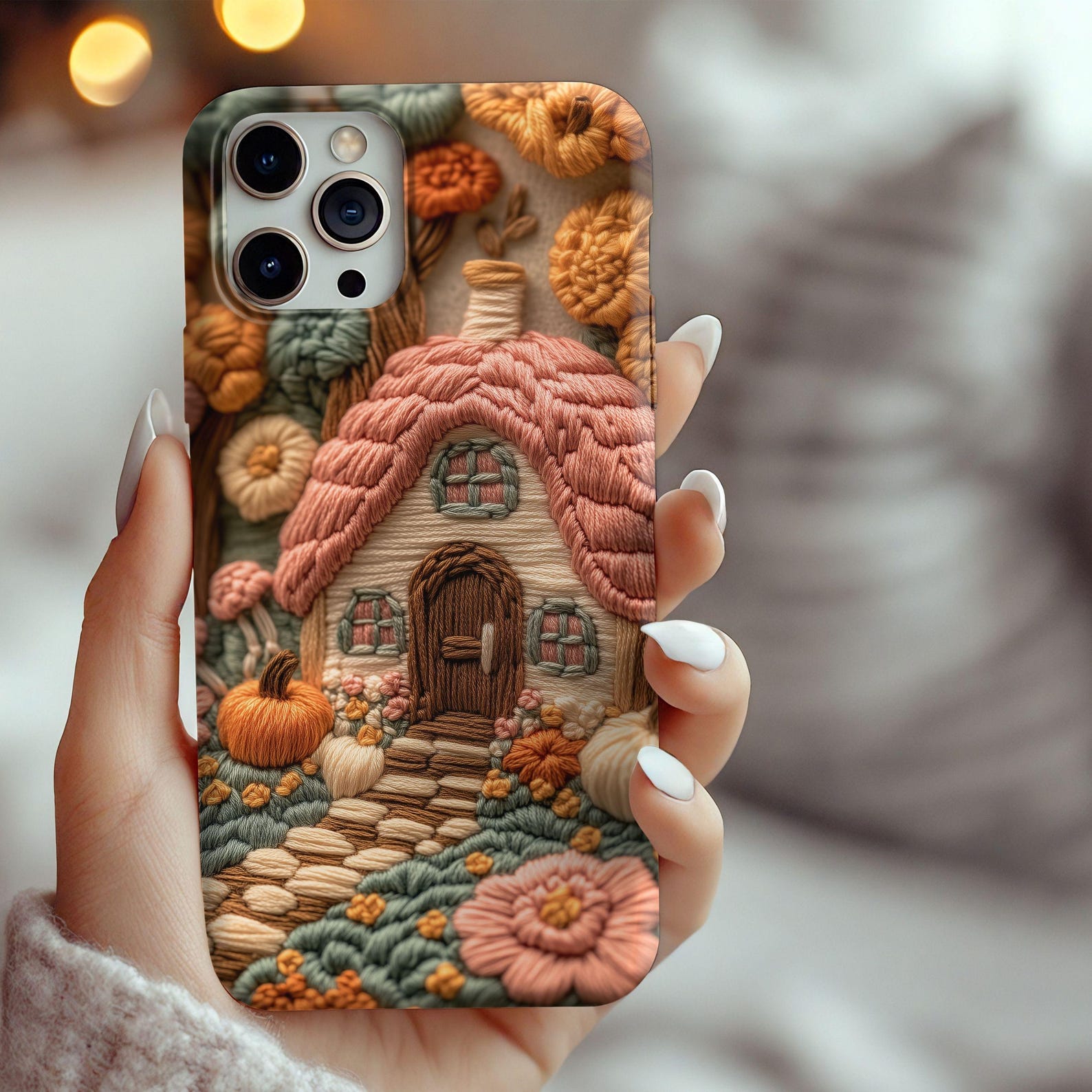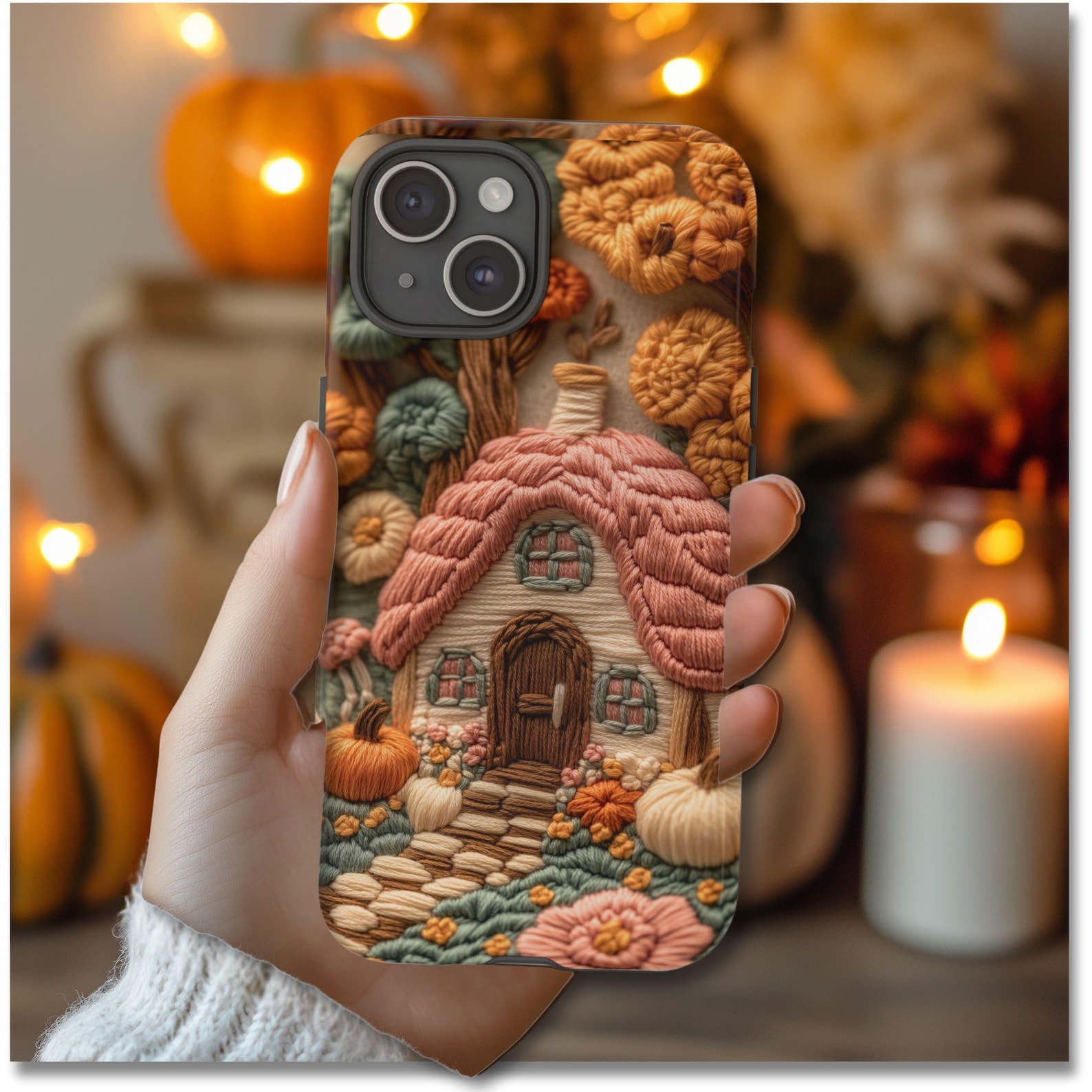 Embrace a whimsical aesthetic with this charming phone case featuring an intricately embroidered cottage design. The warm color palette of earthy tones, oranges, and greens creates a cozy vibe, reminiscent of autumn landscapes. Made from durable materials, this case offers excellent protection while maintaining a soft, matte texture. With its playful and nostalgic look, it’s the perfect accessory for those who love a touch of nature in their everyday life.