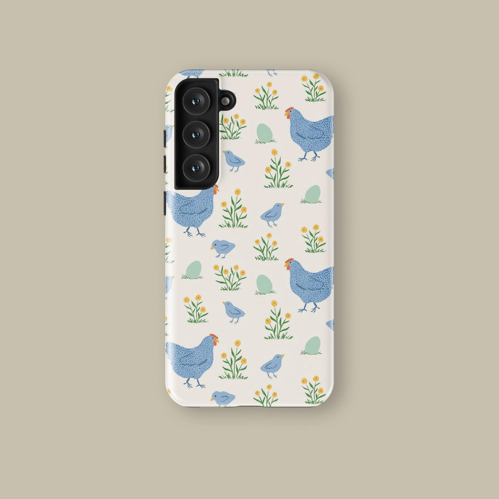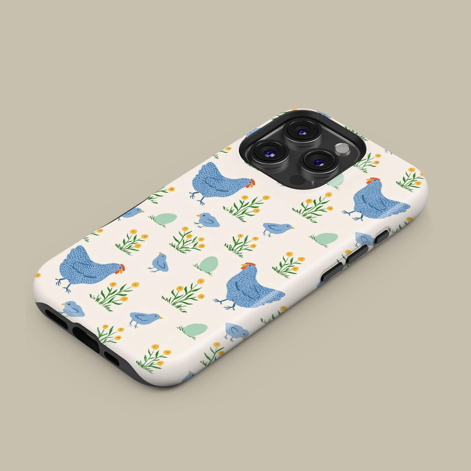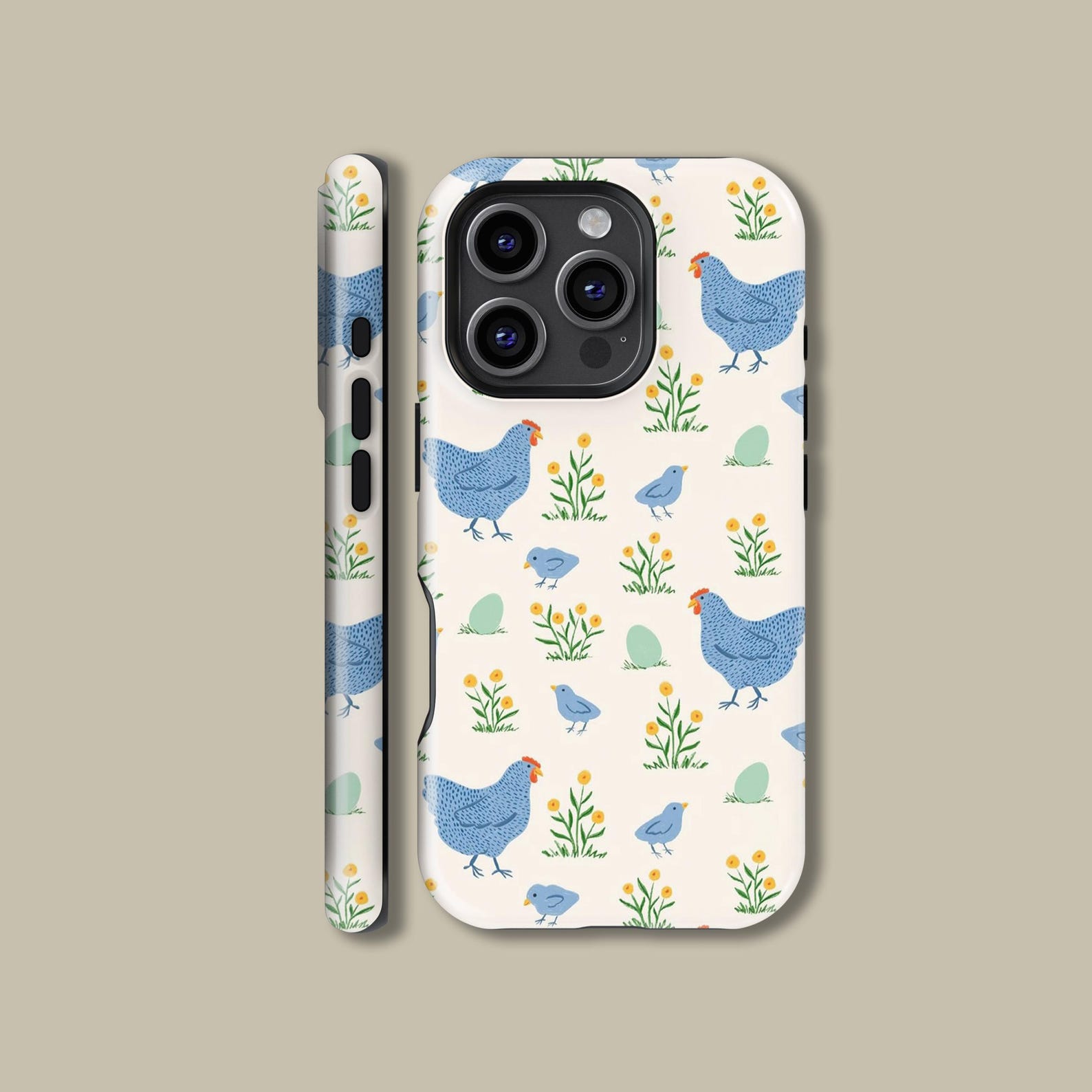 This cute phone case features an adorable farmyard design with vibrant blue chickens, soft green foliage, and delicate yellow flowers. The light, neutral background adds a warm touch, creating a playful aesthetic perfect for nature lovers. Made from durable, shockproof material, it offers excellent protection while maintaining a stylish look. Its glossy finish enhances the visual appeal, making it a delightful accessory for everyday use.