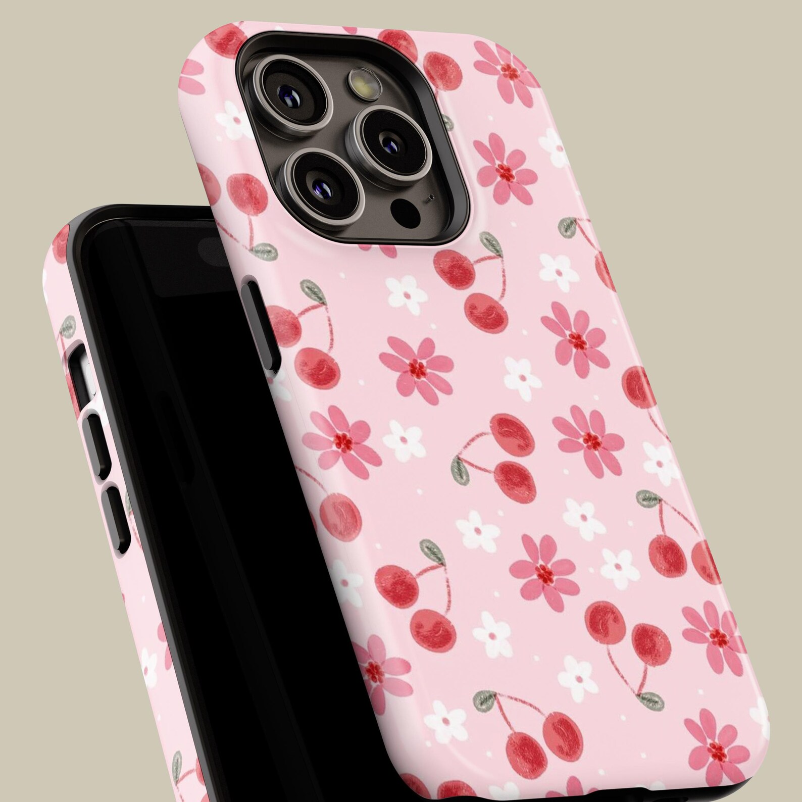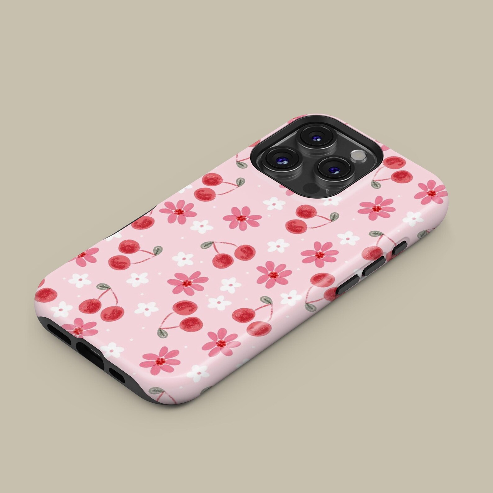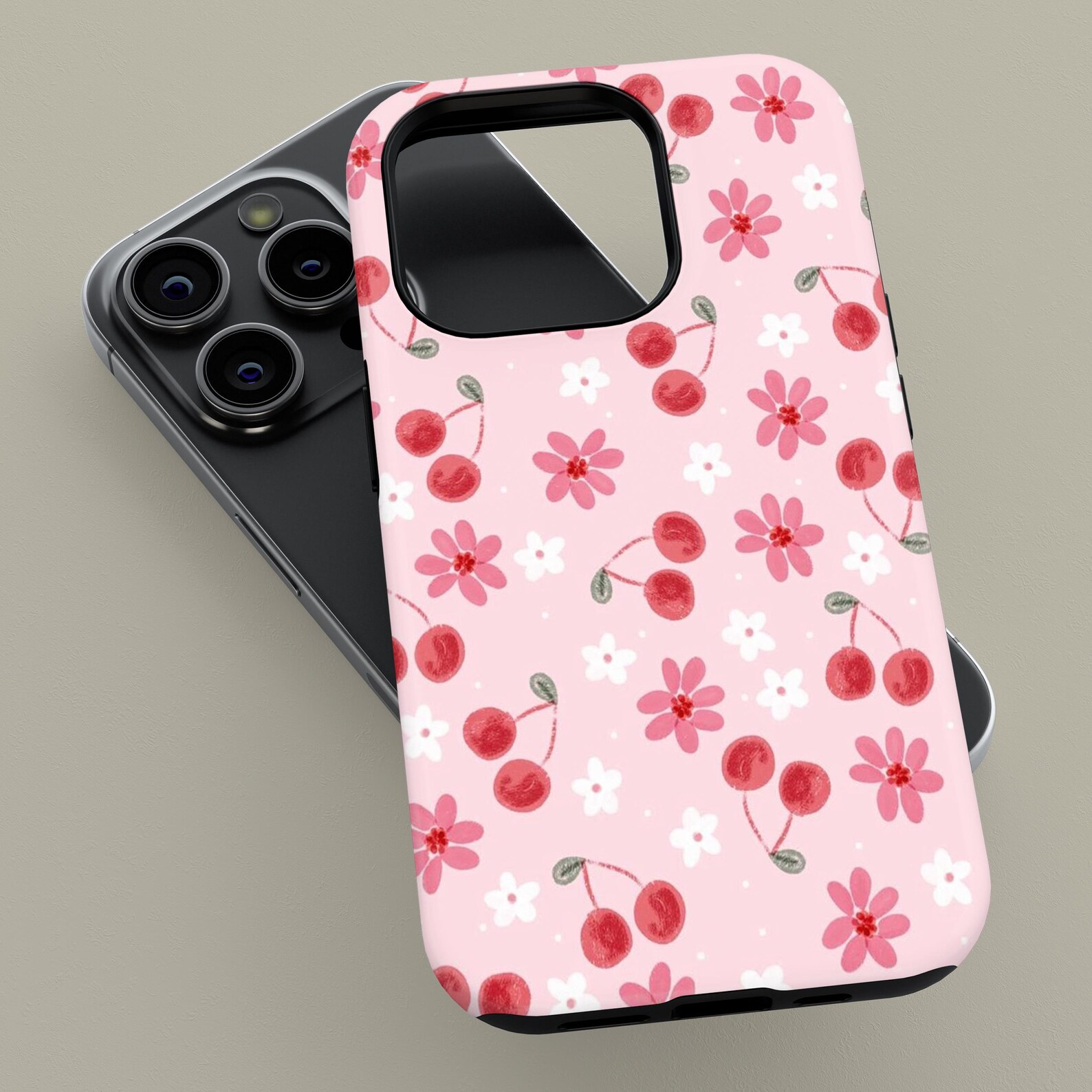 Bright and playful, this phone case features a delightful pattern of cherries and flowers on a soft pink background. The design embodies a cute and whimsical vibe perfect for anyone looking to add a pop of color to their daily essentials. Made from durable materials, the case is both shockproof and glossy, ensuring your device stays protected in style. Its modern aesthetic makes it an ideal accessory for those who love vibrant, cheerful designs.