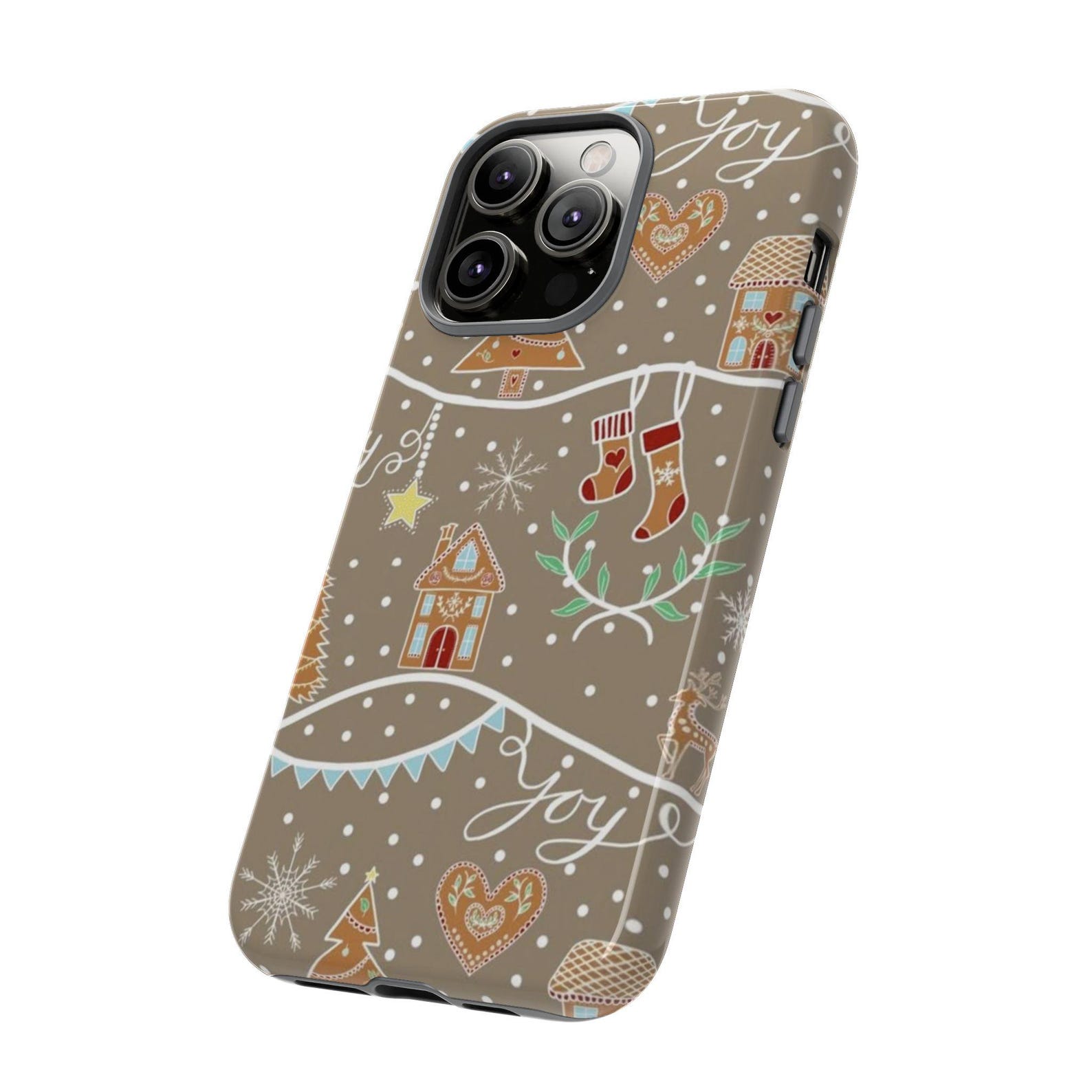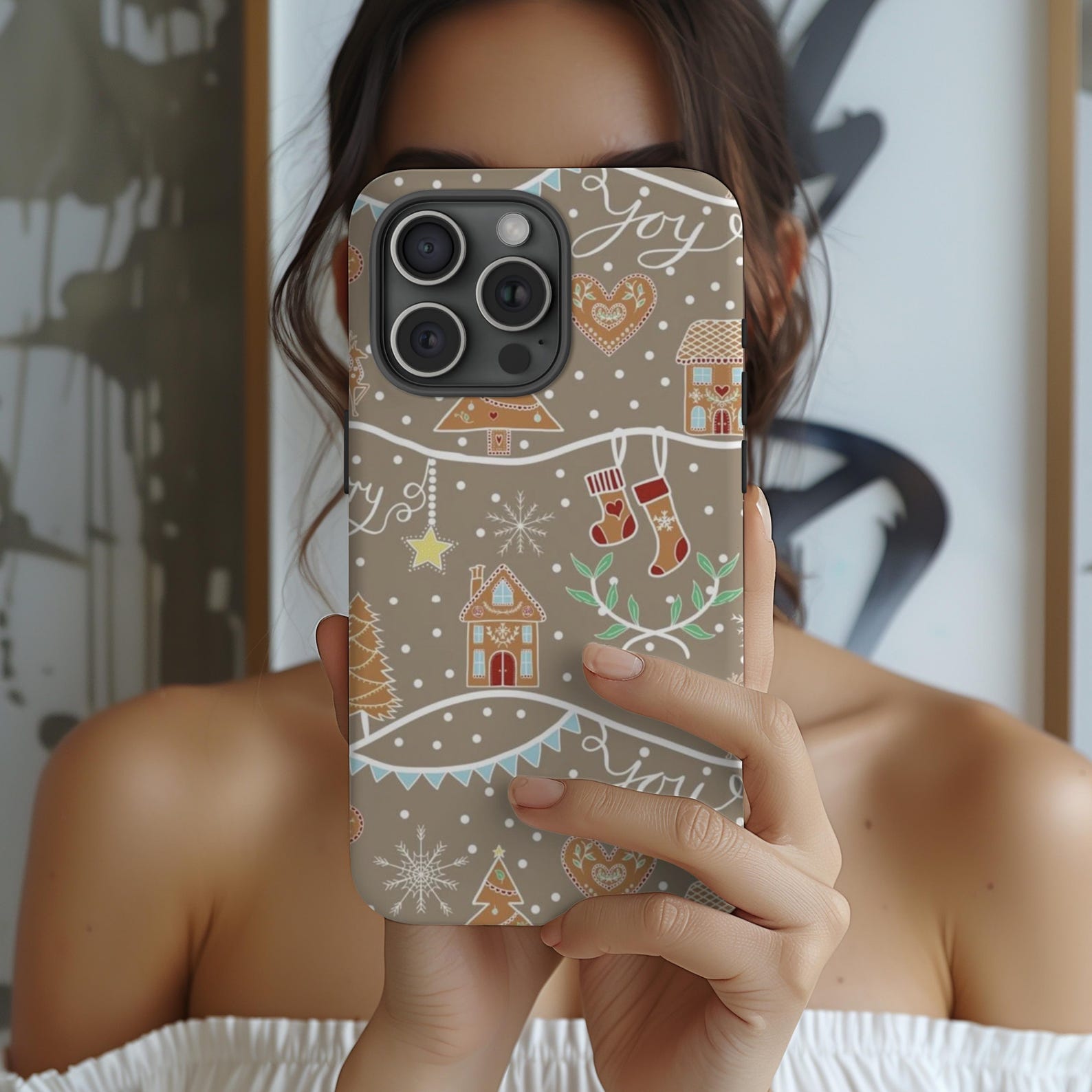 Embrace the festive spirit with this charming holiday-themed phone case. Featuring delightful winter icons like gingerbread houses, stockings, and snowflakes against a warm taupe background, this design radiates joyous vibes. Made from durable materials, it provides excellent shock protection while maintaining a stylish look. The glossy finish adds a touch of elegance, making it the perfect accessory for the holiday season.