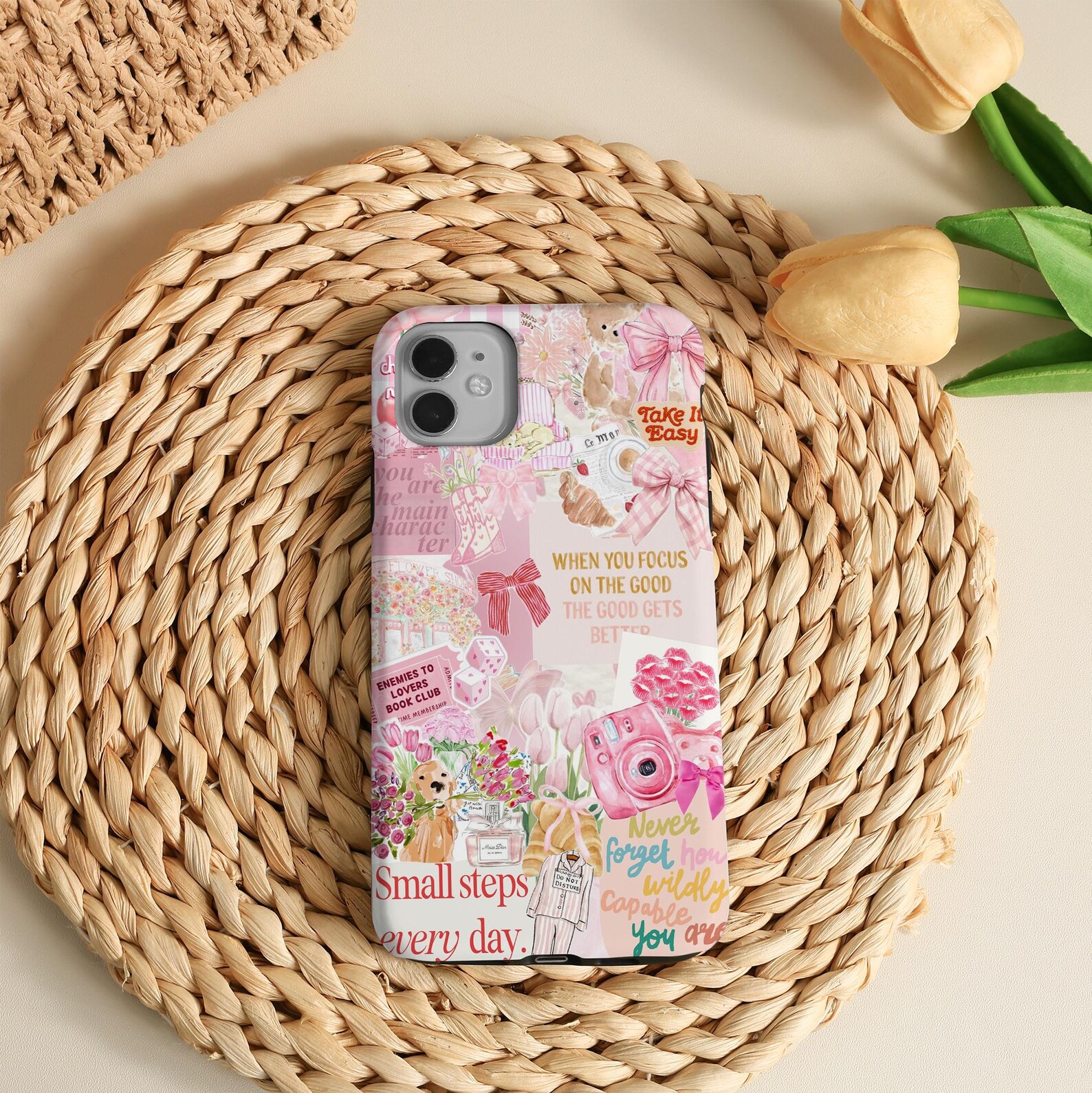 Embrace a playful and uplifting vibe with this charming pastel collage phone case. Featuring an array of cute graphics, including bows, flowers, and motivational quotes, this design combines soft pink hues to create a joyful aesthetic. Made from durable material, it offers a matte finish that enhances grip while protecting your phone. Perfect for those who appreciate unique styles and vibrant expressions.