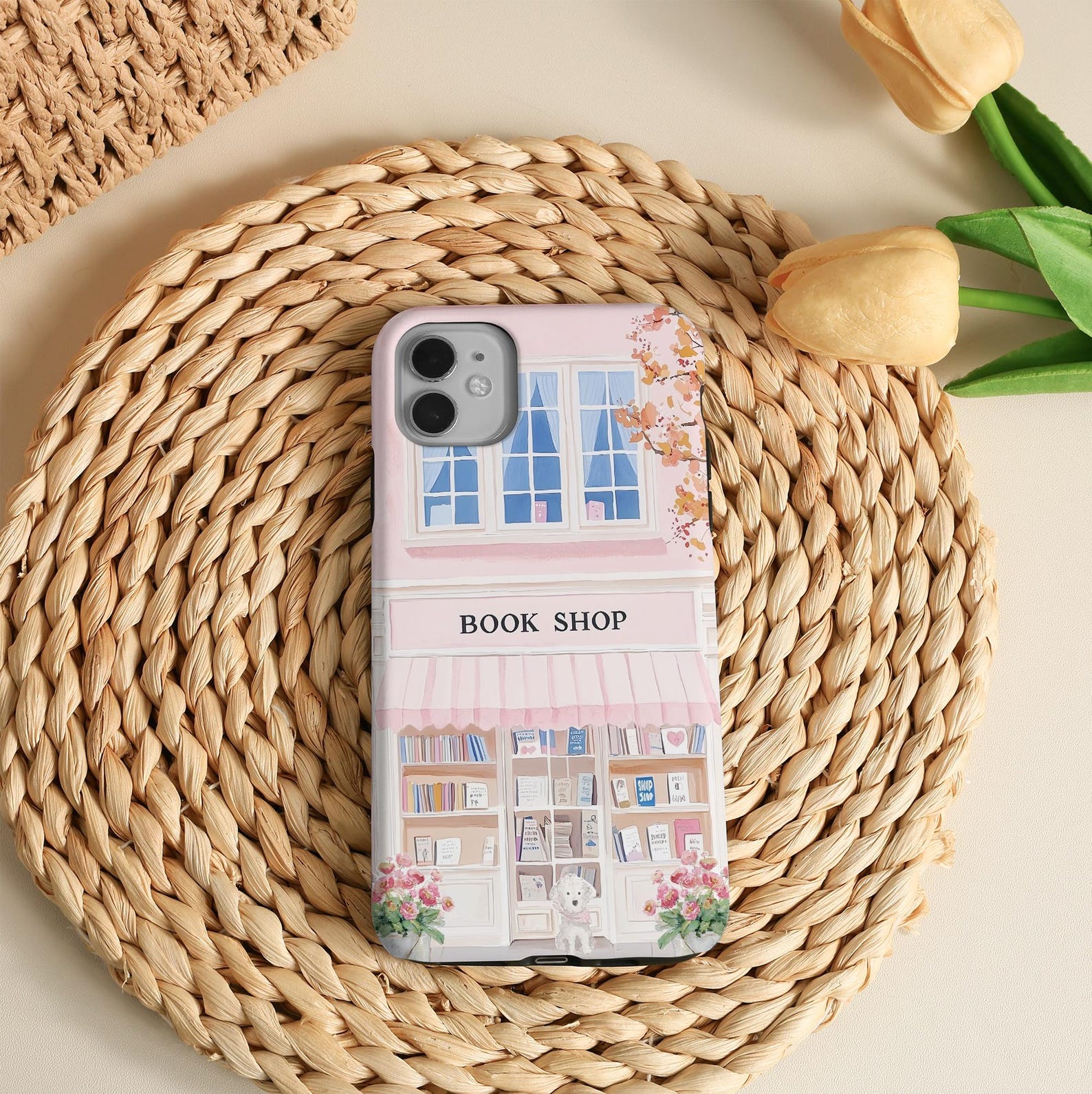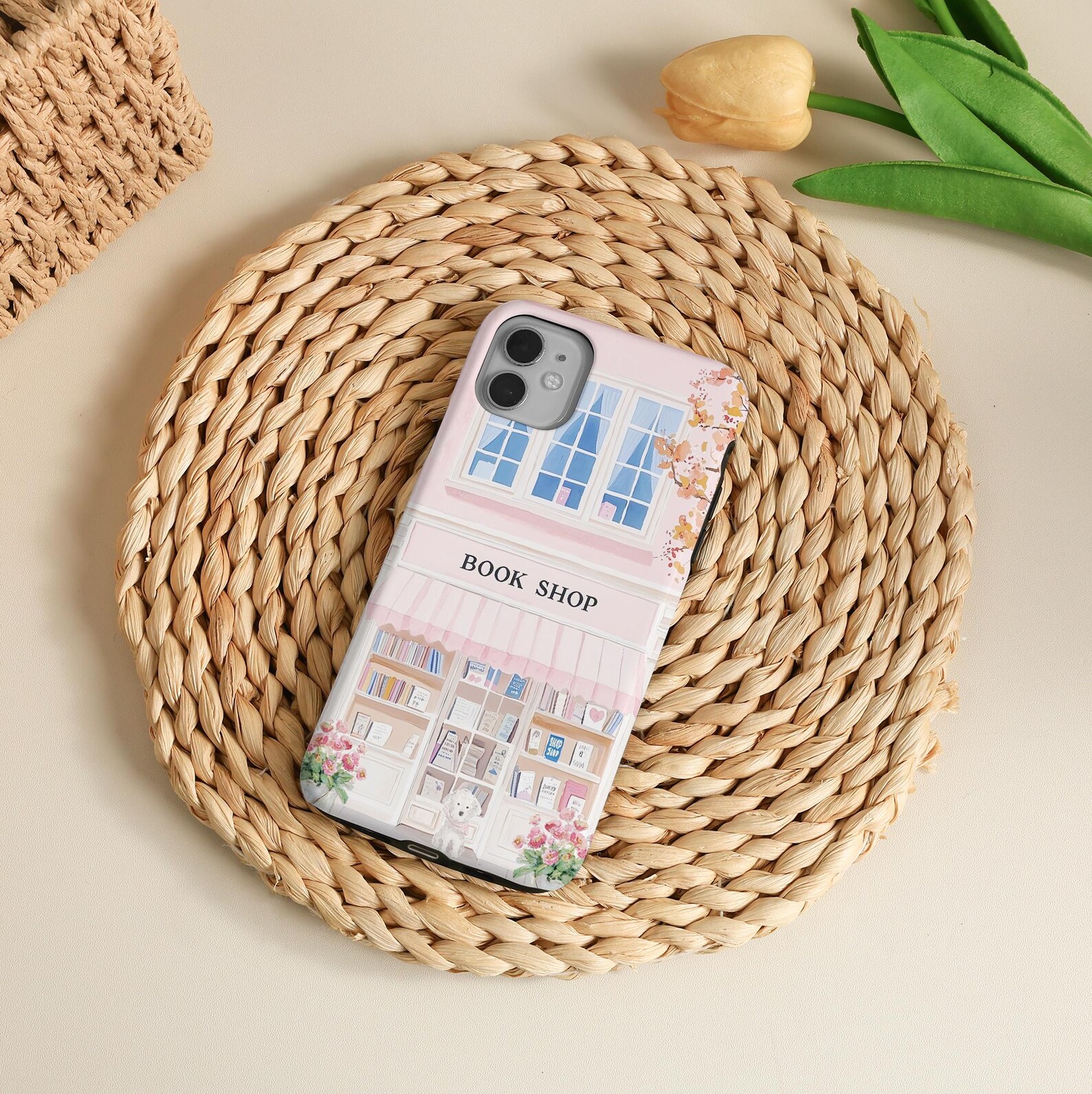 This delightful phone case features a whimsical illustration of a charming bookstore, encapsulating a cute and inviting vibe. The soft pink hues and floral accents create a warm, aesthetically pleasing atmosphere perfect for book lovers. Crafted from durable materials, this case provides superior protection while showcasing a glossy finish that enhances its vibrant design. Ideal for those who appreciate a modern yet playful style, this case is not just a protective cover but a statement piece.