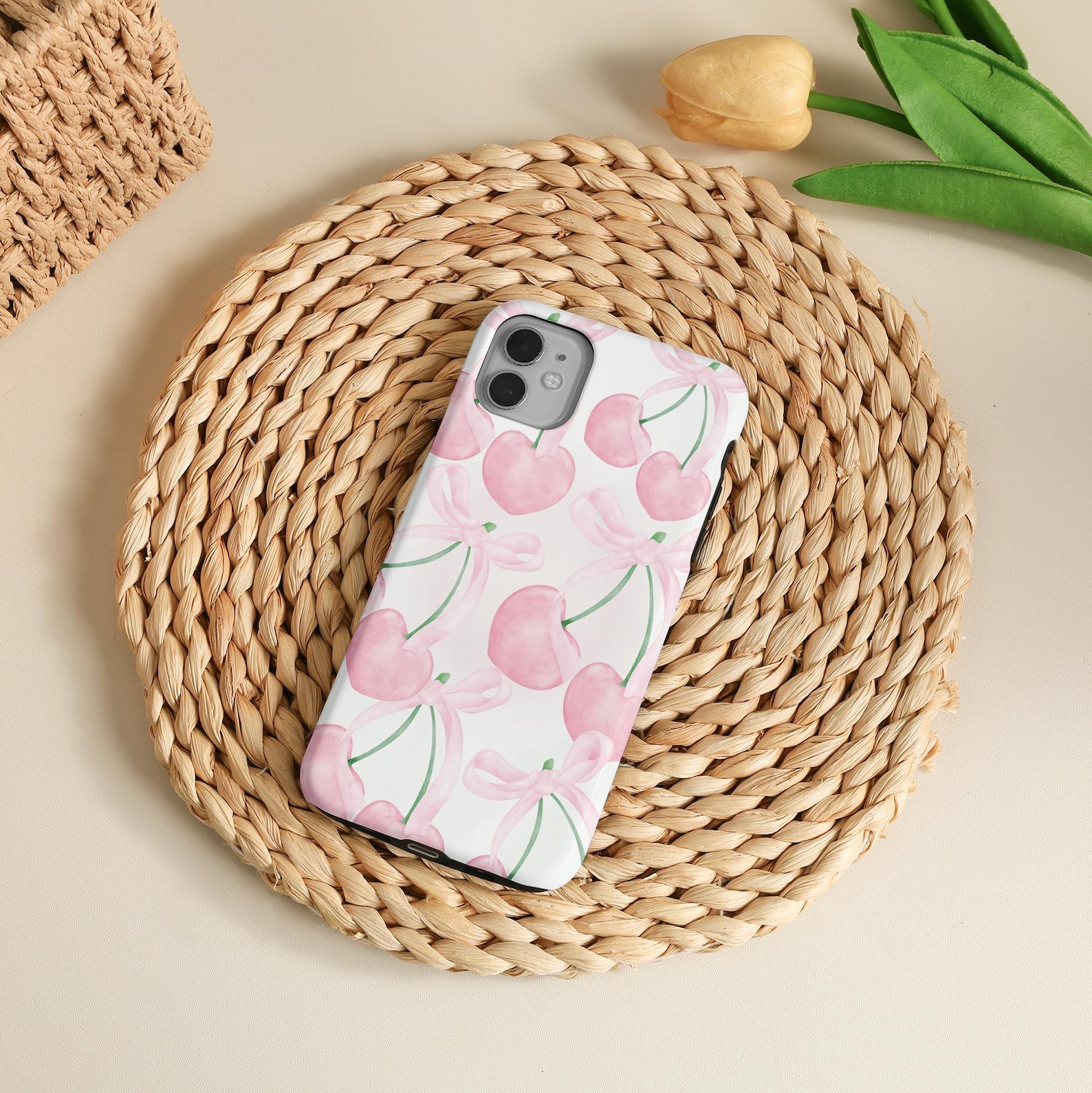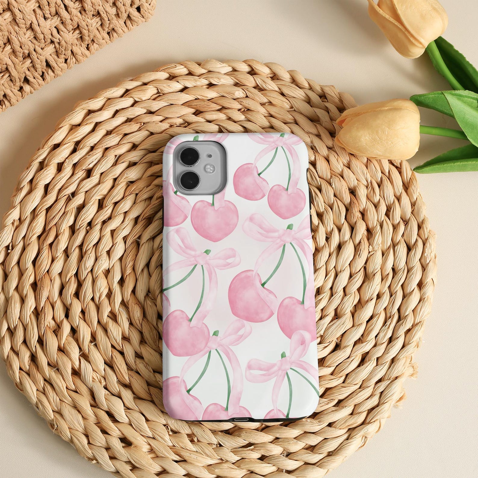 This delightful phone case features a playful design of pink cherries adorned with soft bows, perfect for adding a touch of whimsy to your everyday style. The background is a clean white that enhances the vibrant colors, creating a cheerful and refreshing aesthetic. Crafted from durable materials, it provides excellent protection while maintaining a sleek and lightweight feel. The case is both stylish and functional, perfect for those seeking a modern yet cute accessory that showcases individuality.