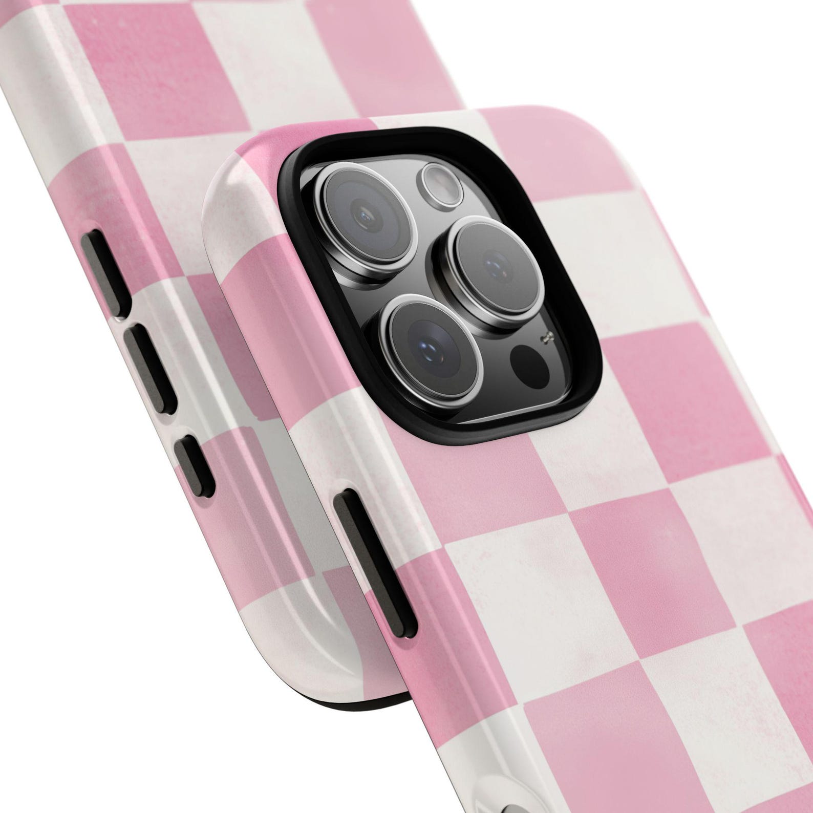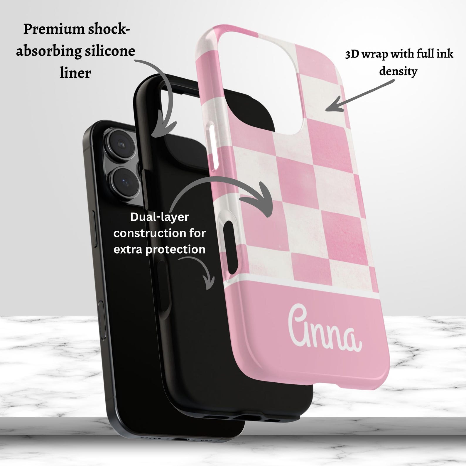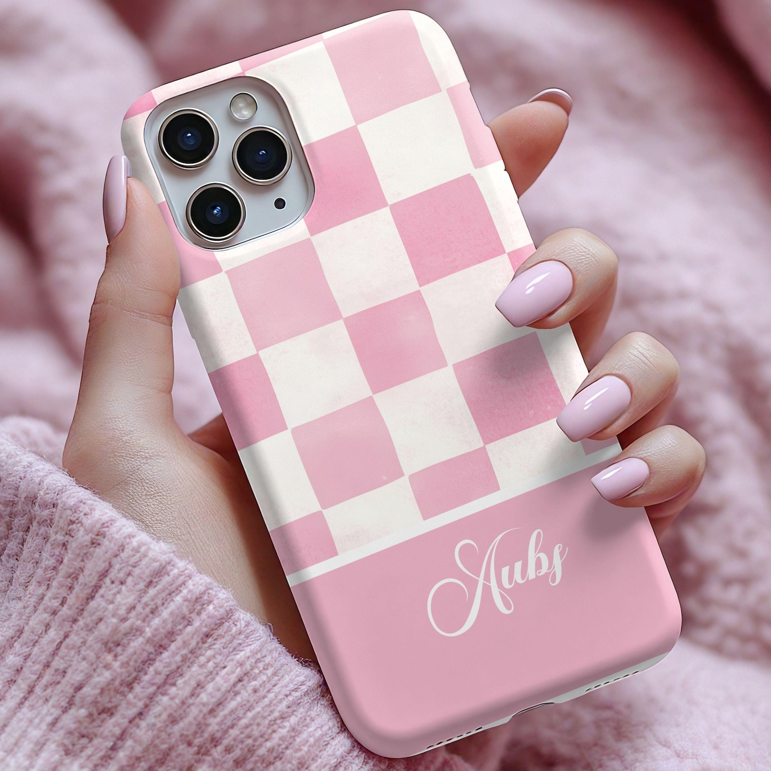 This stylish phone case features a chic pink checkerboard pattern that exudes a playful yet sophisticated vibe. The soft pastel colors create a fresh and modern aesthetic, perfect for anyone looking to express their unique style. Made from durable materials, this case provides both shockproof protection and a sleek, matte finish. The elegant touch of personalized script adds a special flair, making it not just a case, but a statement piece.