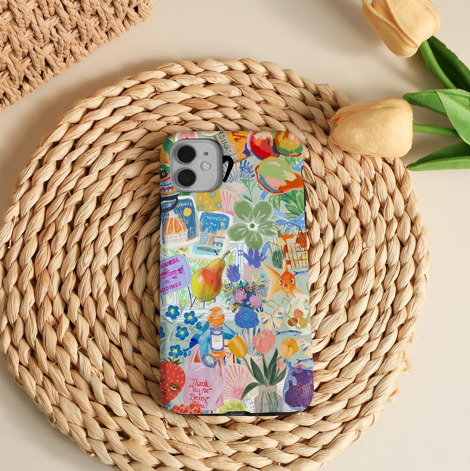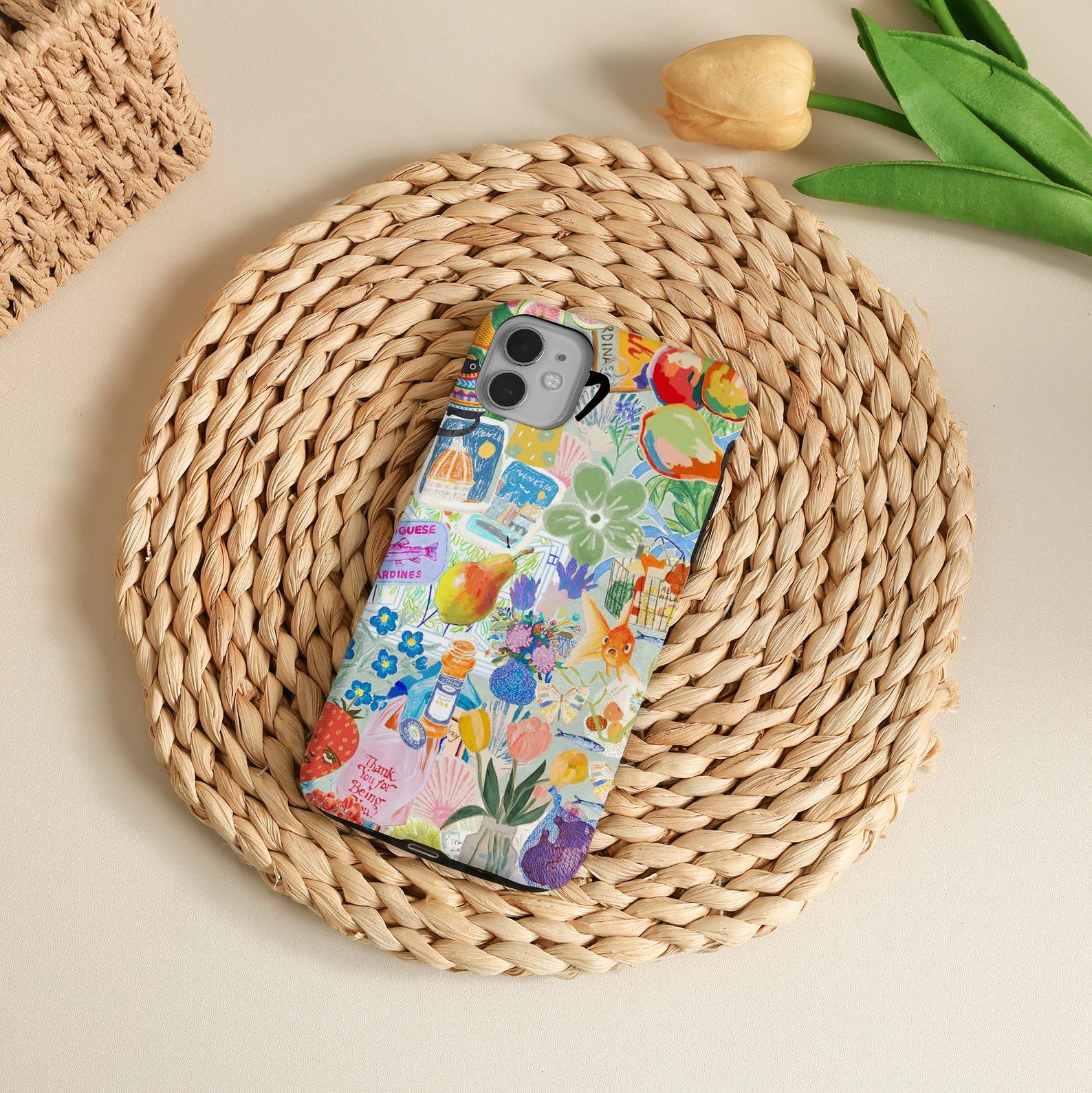 This vibrant phone case features a whimsical arrangement of floral and fruit illustrations, creating a playful and cheerful design. The rich blend of colors, including soft pastels and bright hues, brings an artistic flair to your device. Made from durable materials, this case offers excellent shock protection while maintaining a sleek appearance. Its glossy finish adds a touch of modernity, making it ideal for anyone looking to express their unique style.