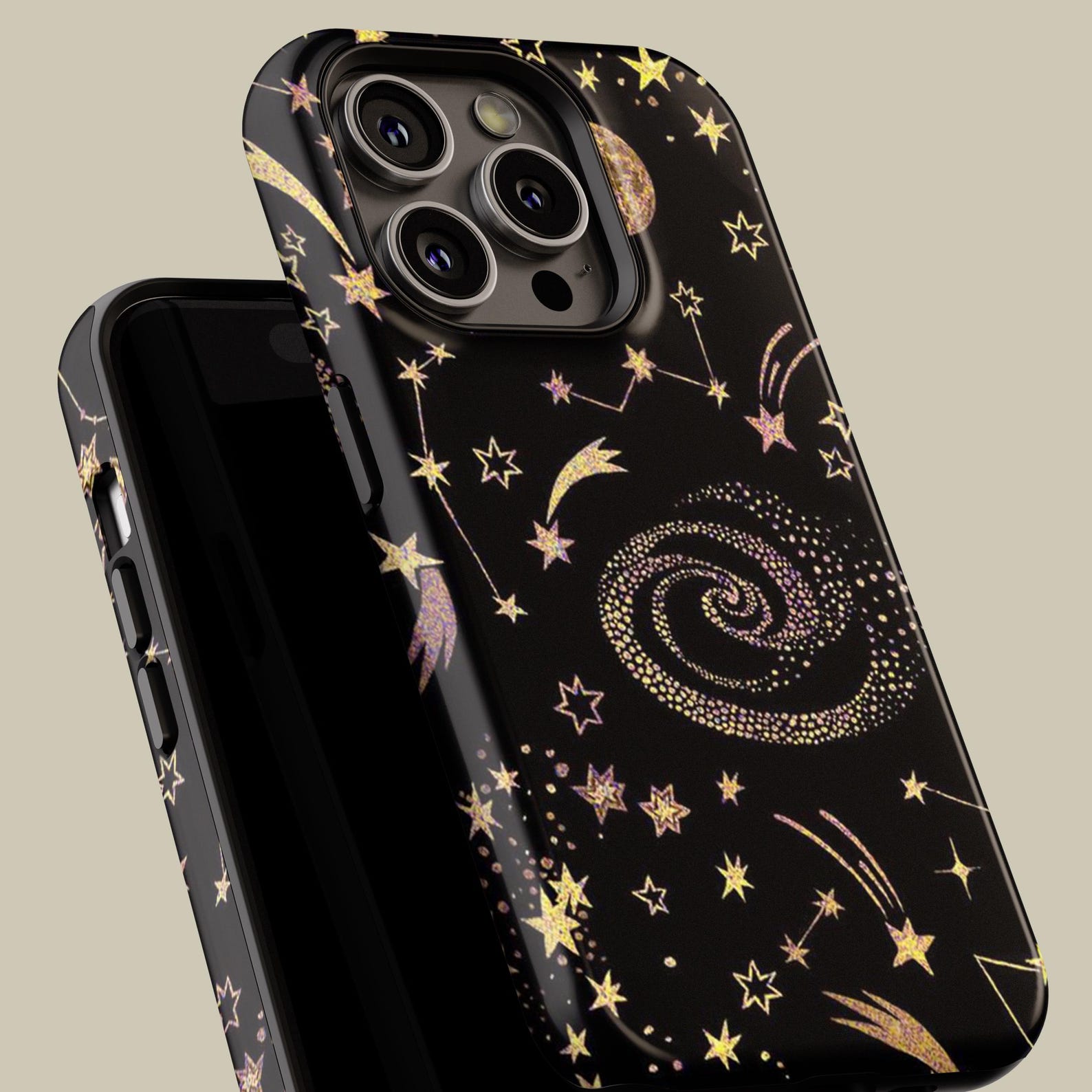 Embrace the beauty of the cosmos with this stunning phone case, featuring a captivating galaxy design. The combination of shimmering gold elements against a sleek black background creates a striking contrast that is both modern and whimsical. Made from durable materials, this case offers excellent shockproof protection while maintaining a glossy finish. Perfect for those who appreciate a stylish and adventurous aesthetic, it’s sure to make your device stand out.