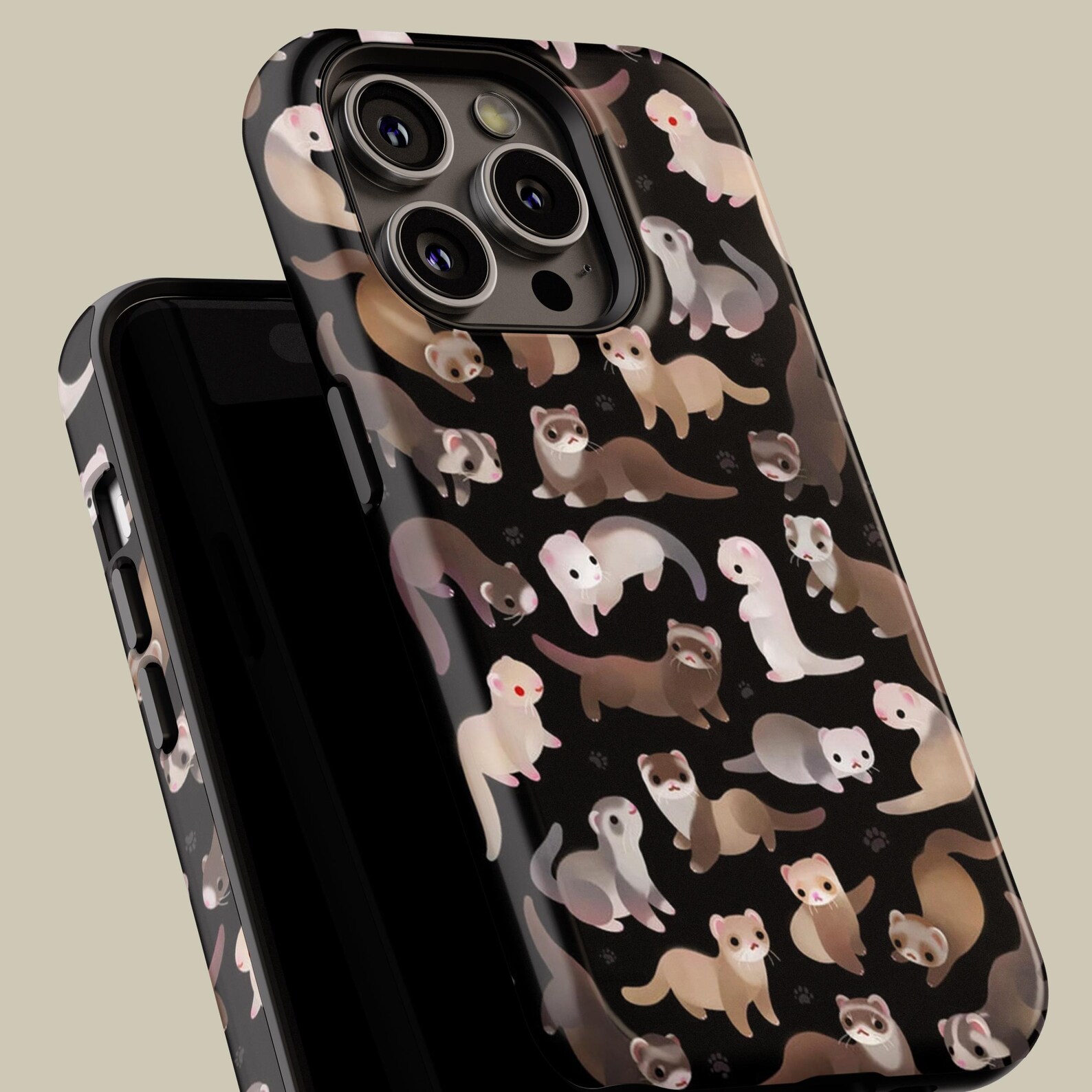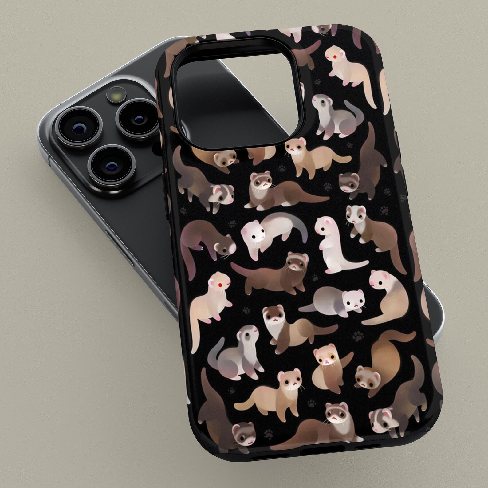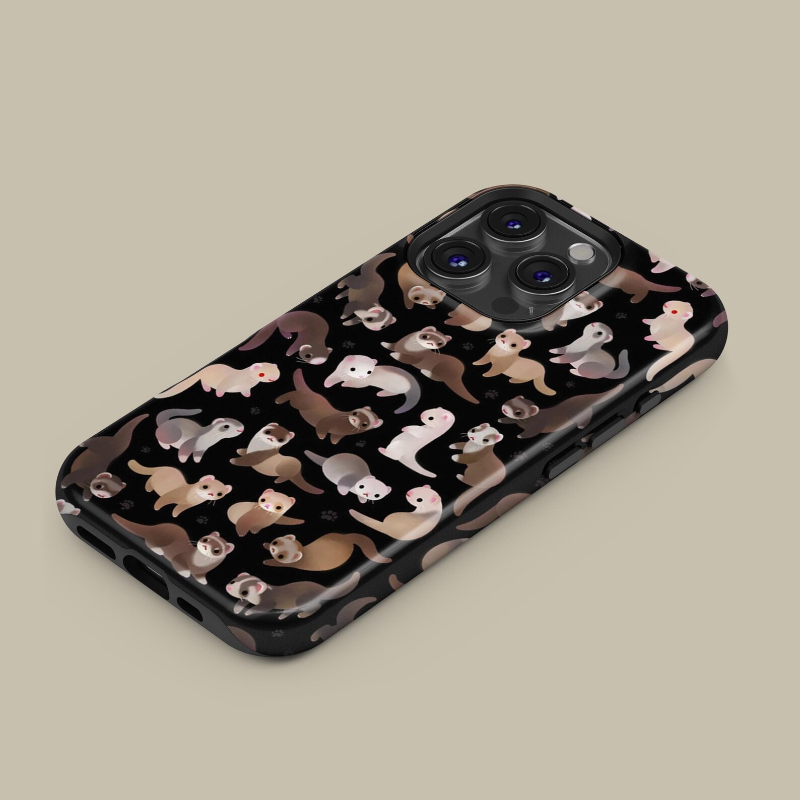 Embrace your playful side with this adorable ferret-patterned phone case. Featuring a delightful array of soft, whimsical ferret illustrations against a sleek black background, this case is designed to bring a smile to your face. Made from durable material, it offers robust protection while maintaining a glossy finish that enhances the vibrant colors. The overall vibe is both fun and stylish, perfect for animal lovers looking to showcase their personality.