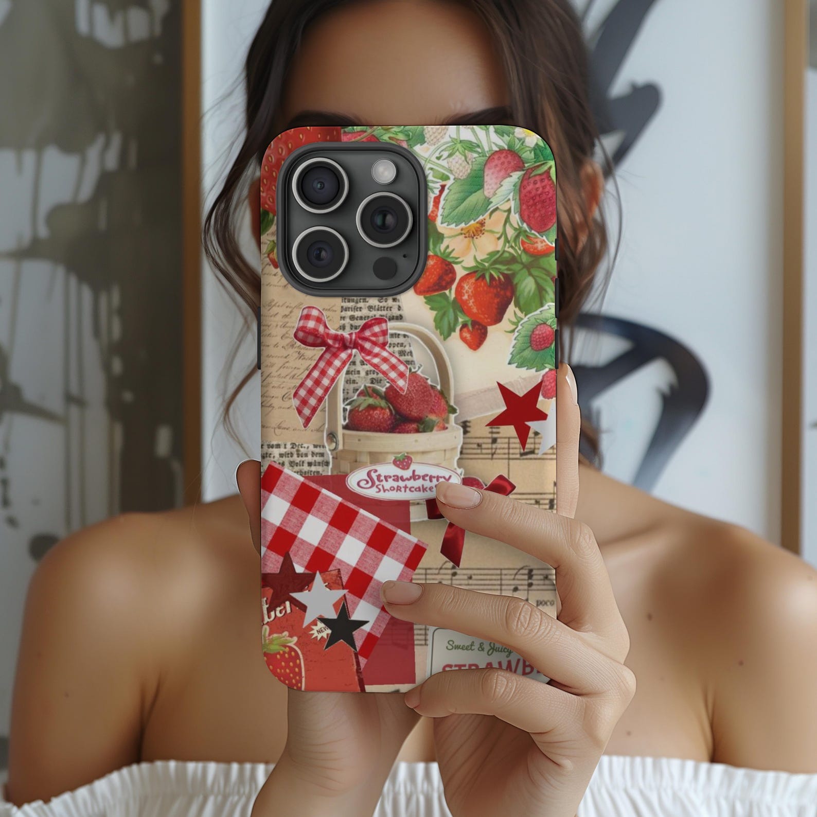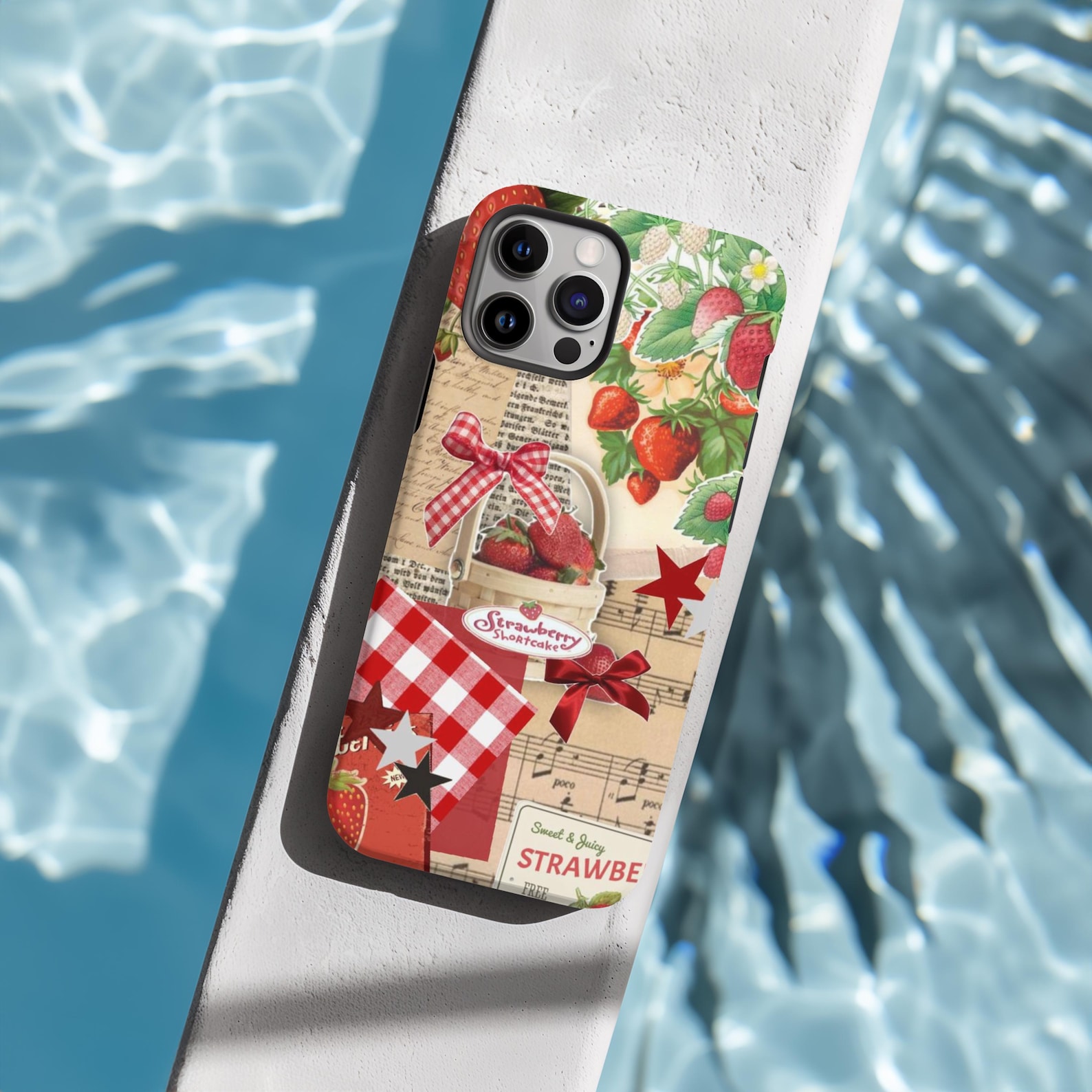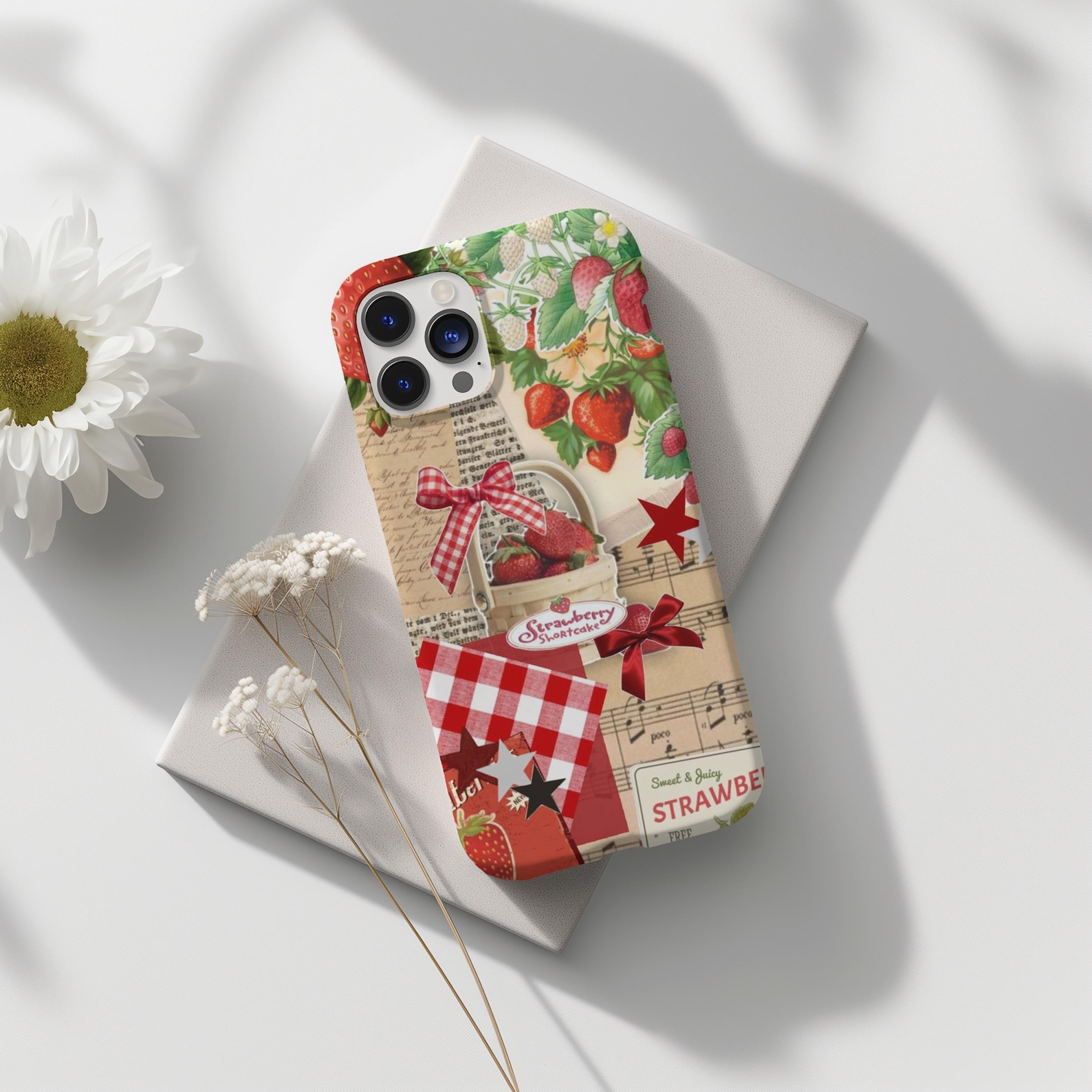 Embrace a playful and nostalgic vibe with this cute phone case featuring a delightful strawberry theme. The design boasts vibrant colors with shades of red, green, and soft beige, adorned with charming checkered patterns and whimsical illustrations. Crafted from durable materials, this shockproof case ensures your phone stays protected while showcasing a stylish, vintage-inspired aesthetic. Perfect for anyone looking to add a touch of sweetness to their everyday carry.