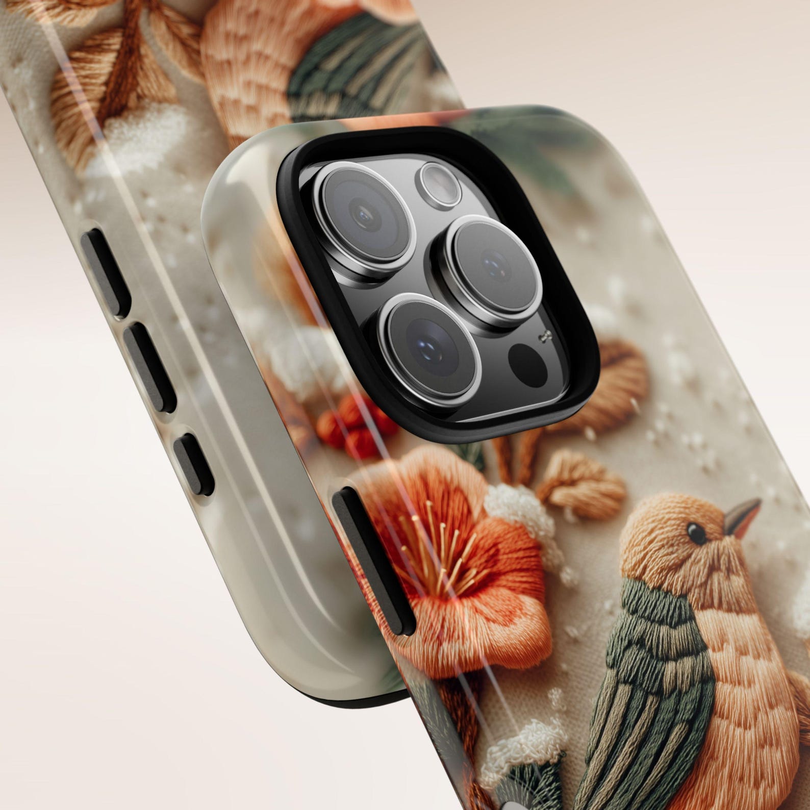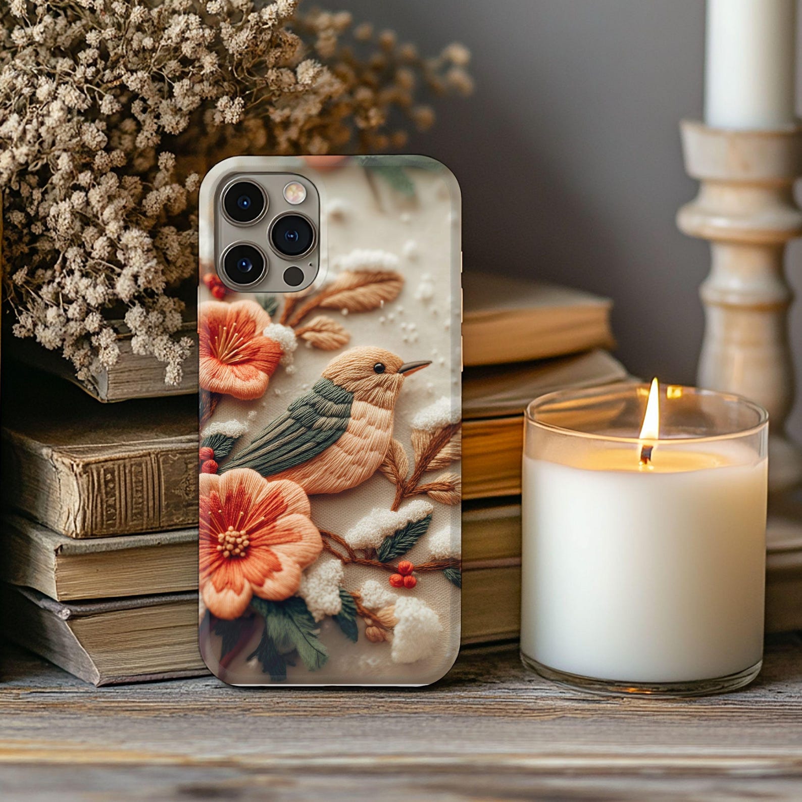 This stunning phone case features an intricate design of a charming bird surrounded by beautiful flowers. The warm, earthy tones combined with delicate floral accents create a natural and inviting vibe. Made from durable materials, this case offers excellent shock protection while maintaining a glossy finish. Perfect for those who appreciate elegance and nature-inspired art, it exudes a stylish and refined aesthetic.