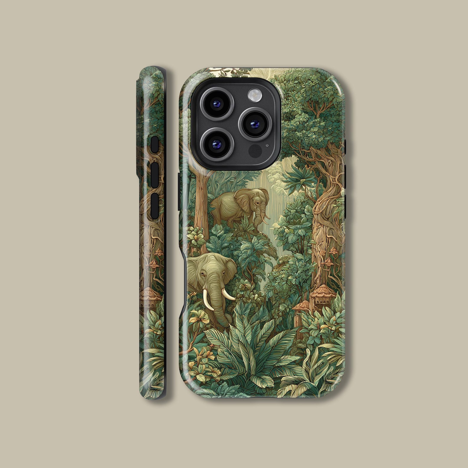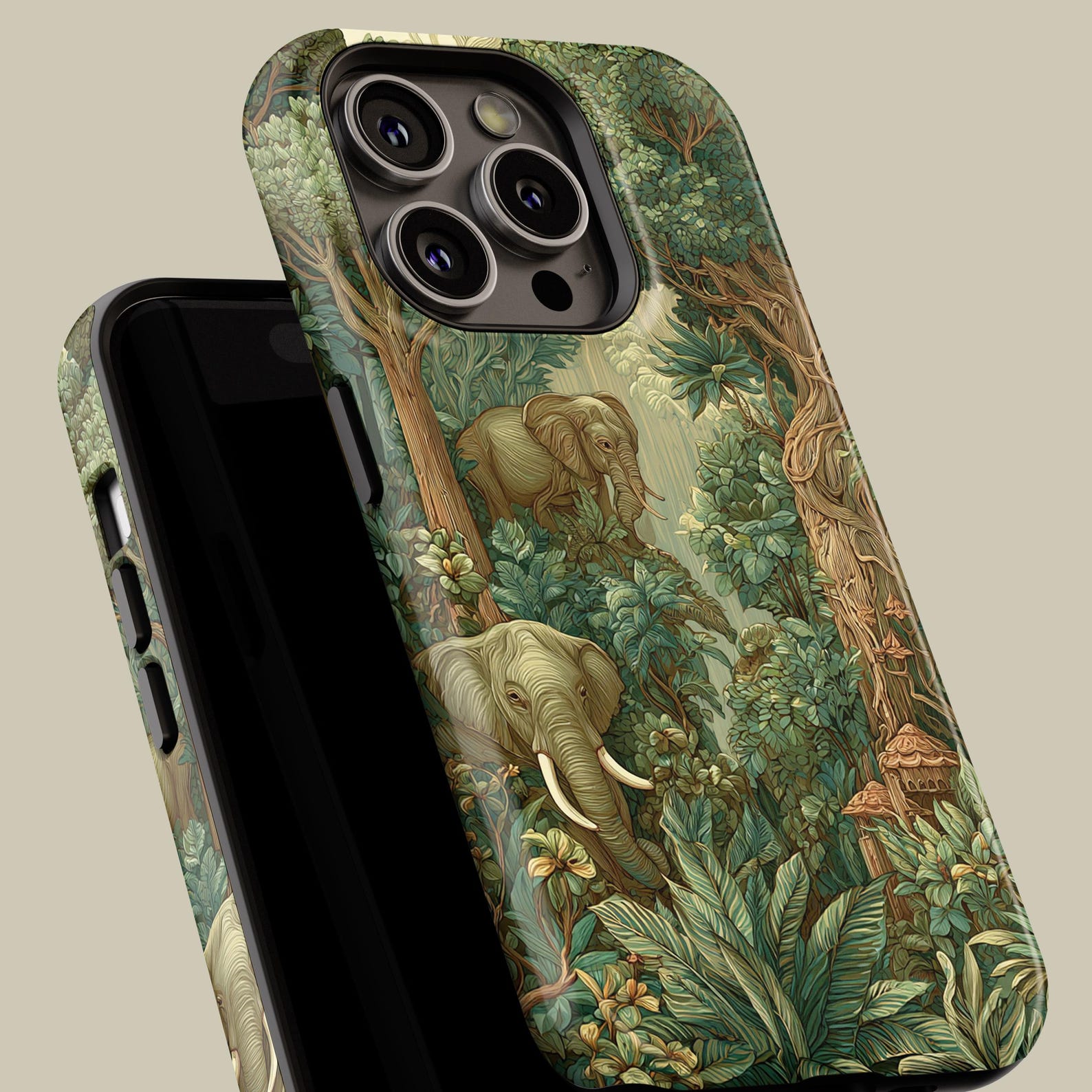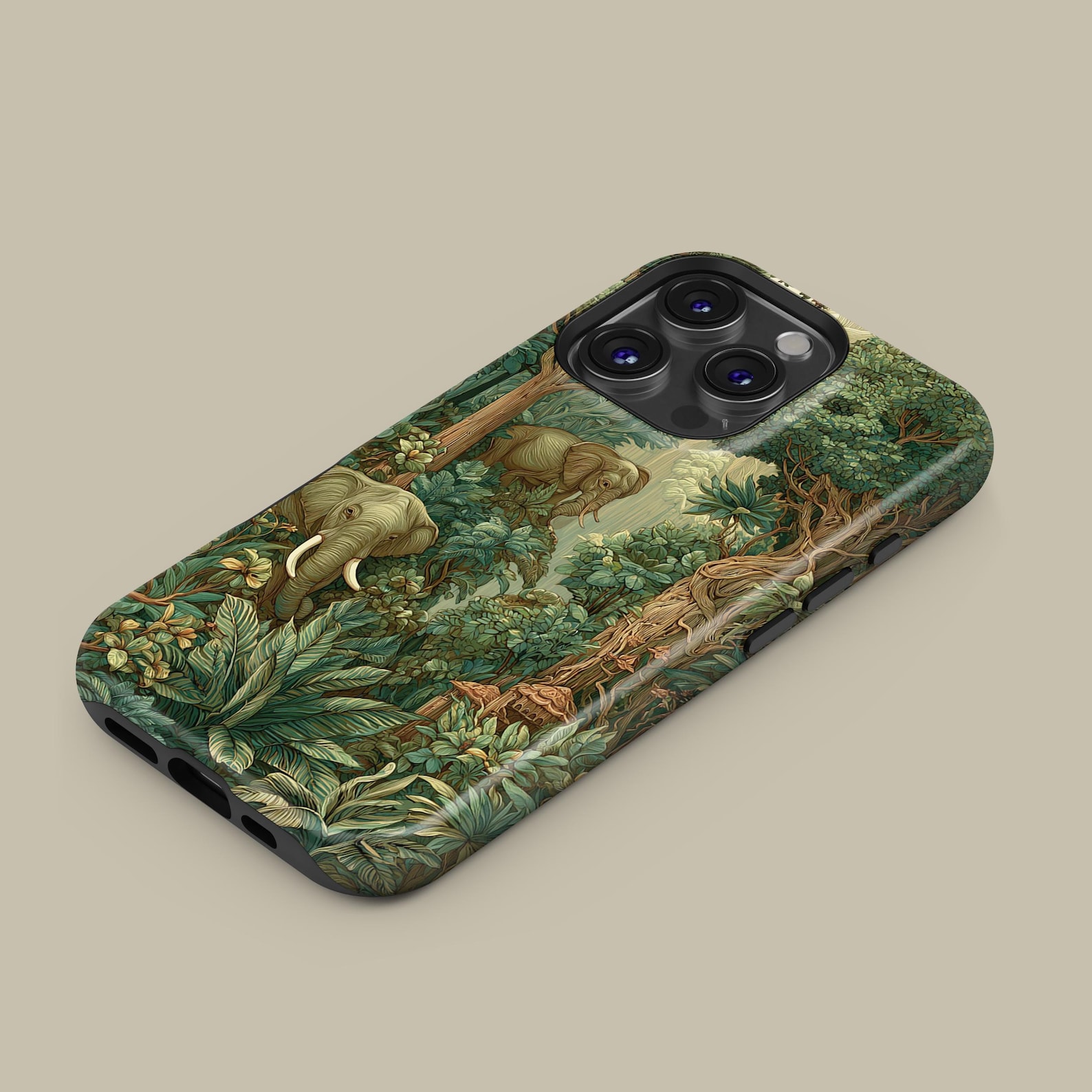 Embrace the wild with this stunning phone case featuring intricately designed elephants hidden among lush greenery. The soft earthy tones and intricate detailing create a serene, nature-inspired aesthetic. Made from durable material, this case provides reliable protection while maintaining a sleek look. Its matte finish adds a touch of elegance, making it a perfect accessory for nature lovers. Revel in the charm of the jungle every time you use your phone.