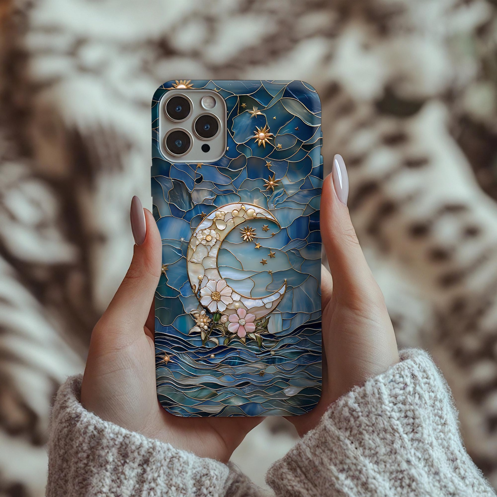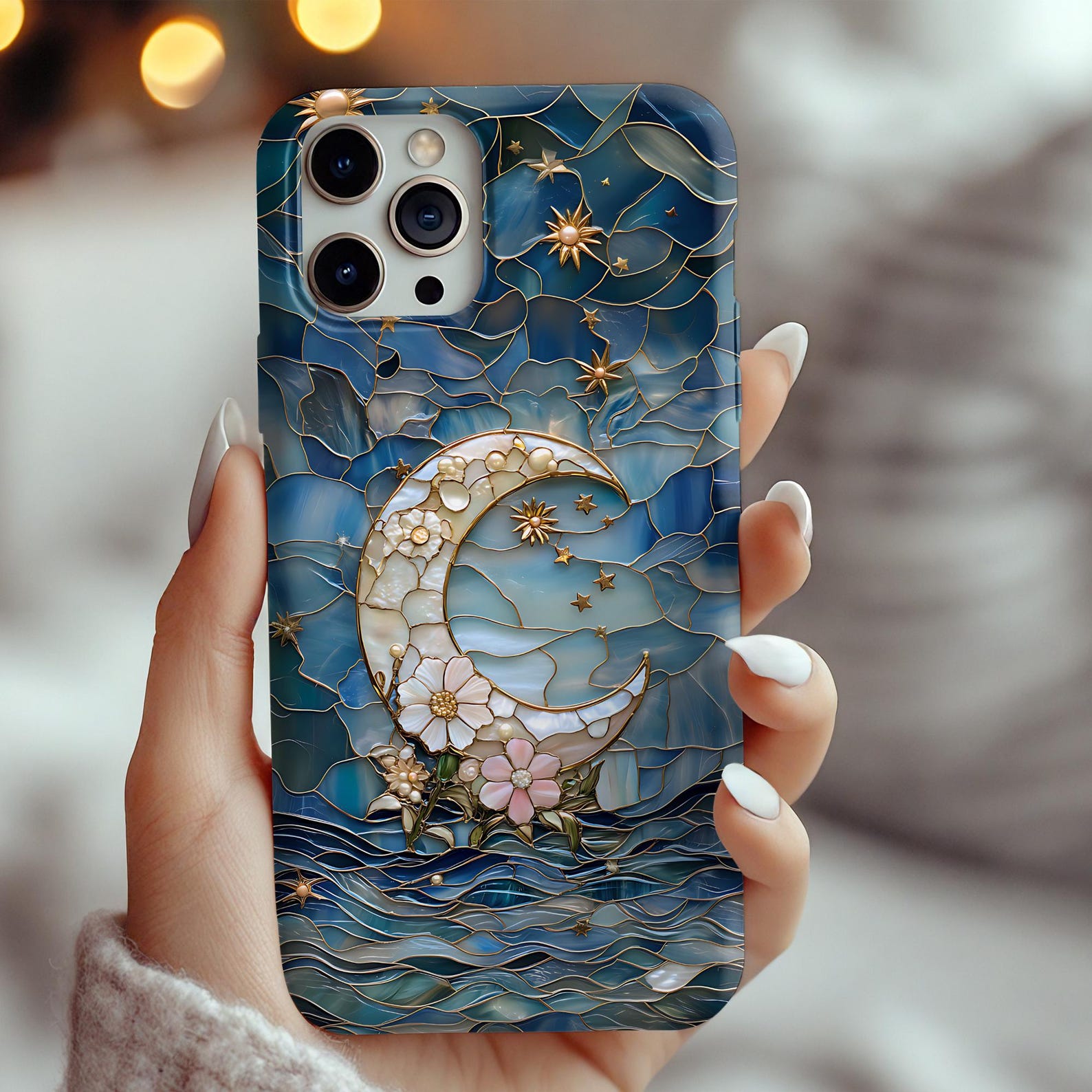 This stunning phone case features an elegant stained glass design inspired by the moon and delicate floral elements. The rich blues, soft whites, and pastel pinks create a captivating aesthetic that is both serene and artistic. Made from durable materials with a glossy finish, this case offers shockproof protection while showcasing its beautiful visual elements. Ideal for those who appreciate modern elegance with a touch of whimsy.