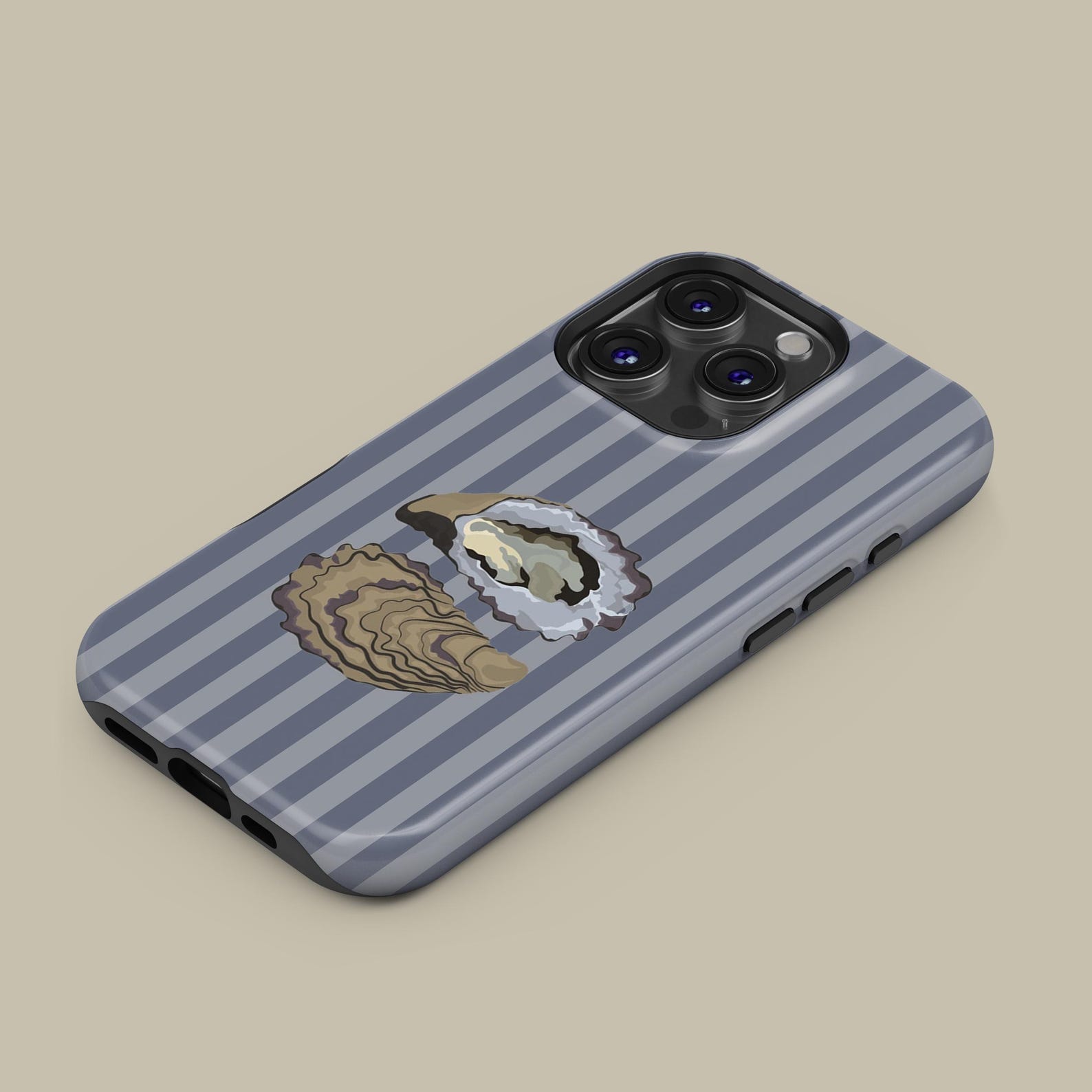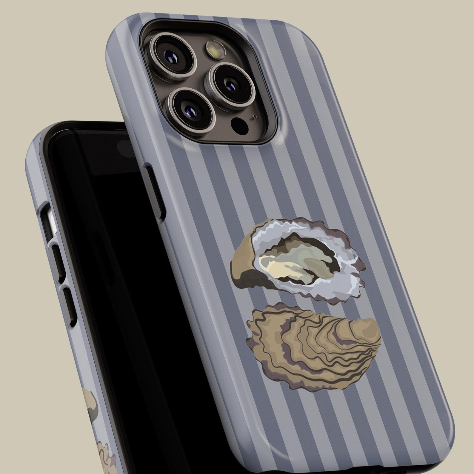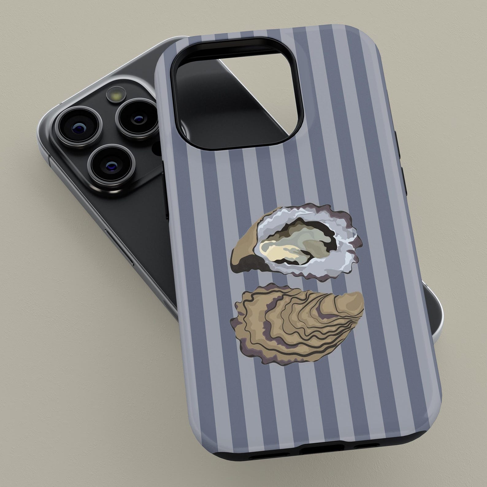This stylish phone case showcases a unique oyster design against a soft striped background. The muted color palette of gray and beige creates an elegant look that is both refined and playful. Crafted from durable materials, it offers shockproof protection while maintaining a sleek appearance. Perfect for those who appreciate marine aesthetics, this case combines functionality with a chic vibe that complements any outfit.