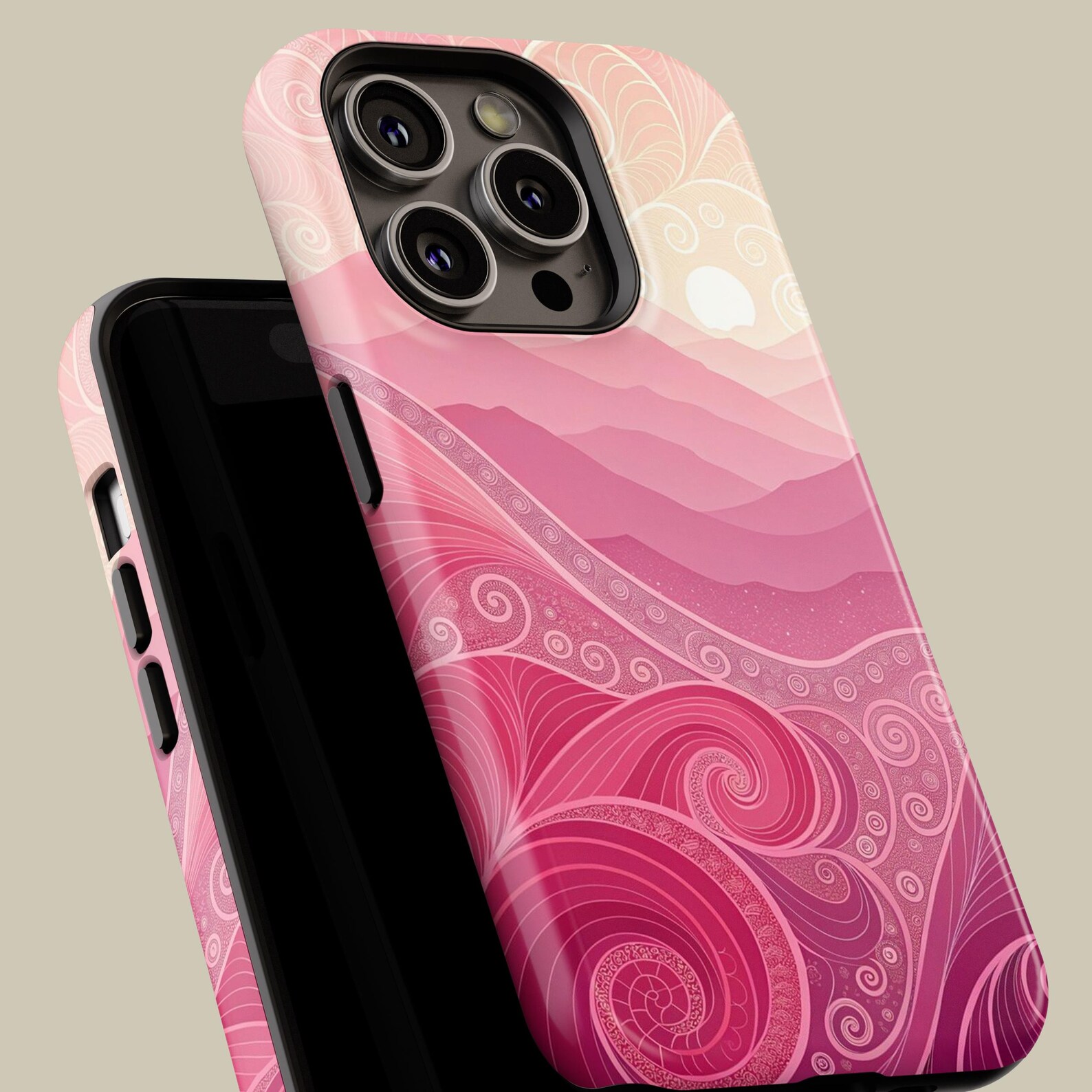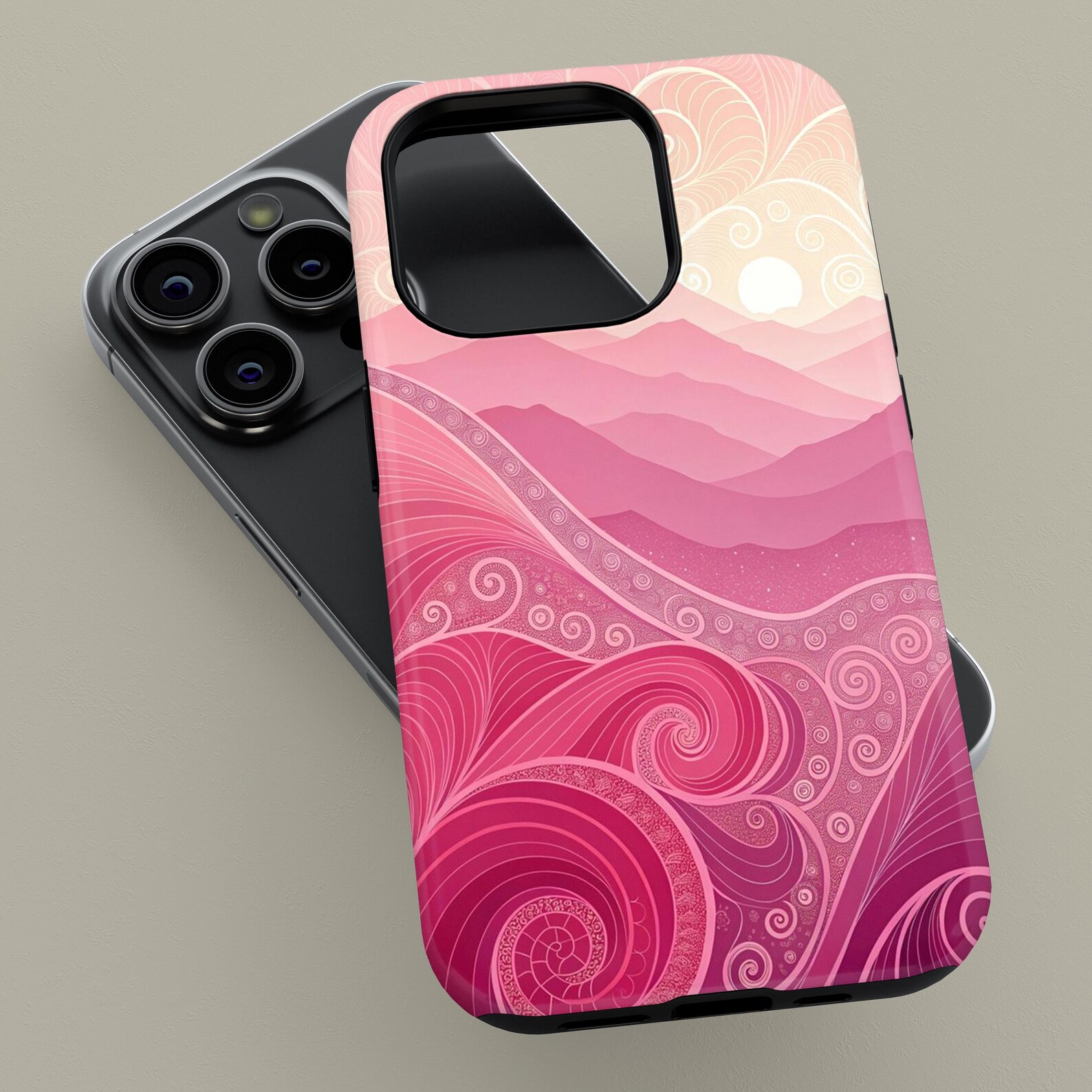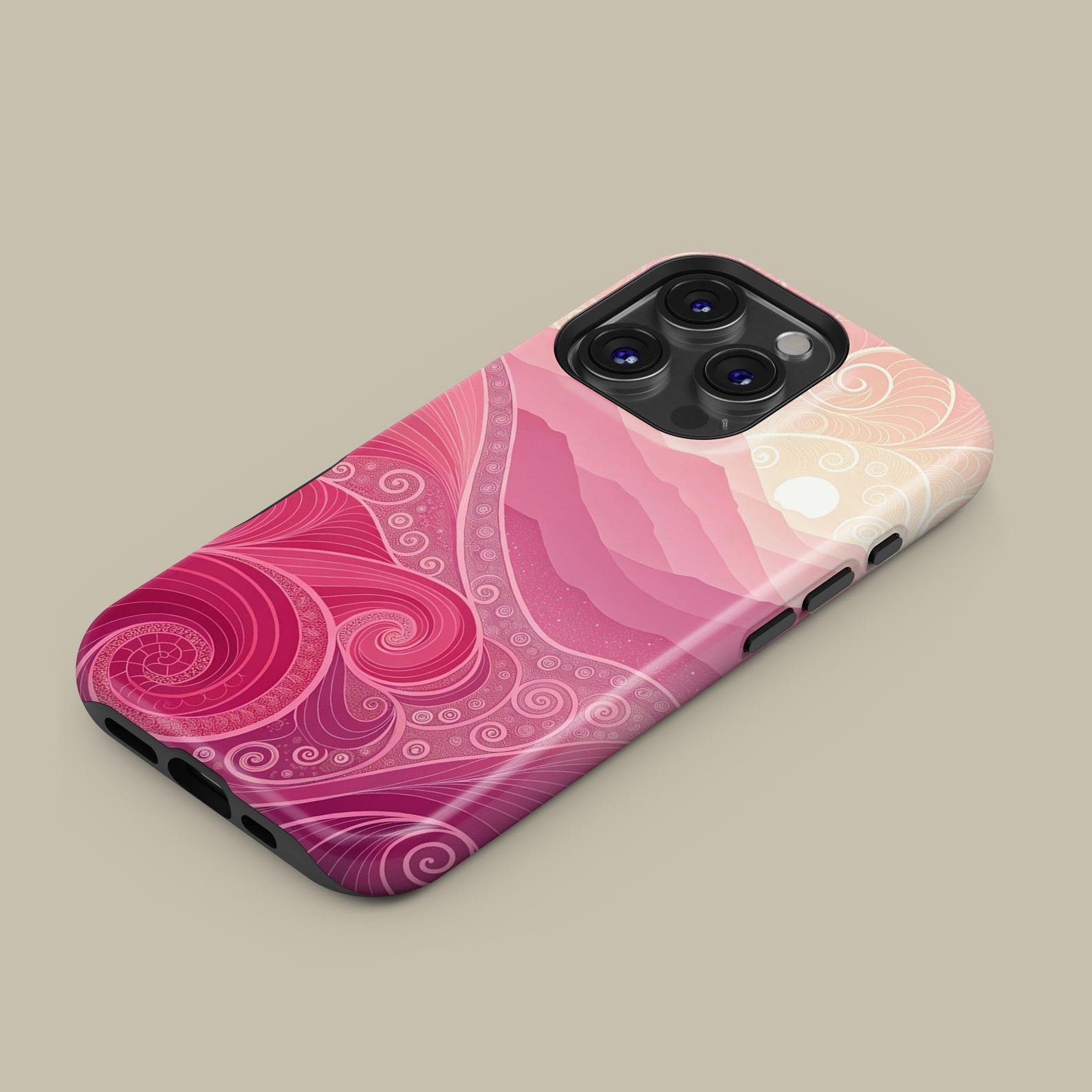 This stunning phone case features a beautiful blend of soft pinks and subtle gradients, creating a serene wave pattern that evokes a sense of calm and elegance. The intricate swirls and details give it a sophisticated touch, making it perfect for those who appreciate artistry in everyday items. Made from durable materials, this case offers excellent protection while maintaining a glossy finish that enhances its visual appeal. Elevate your device with this stylish and artistic accessory that exudes modern charm.