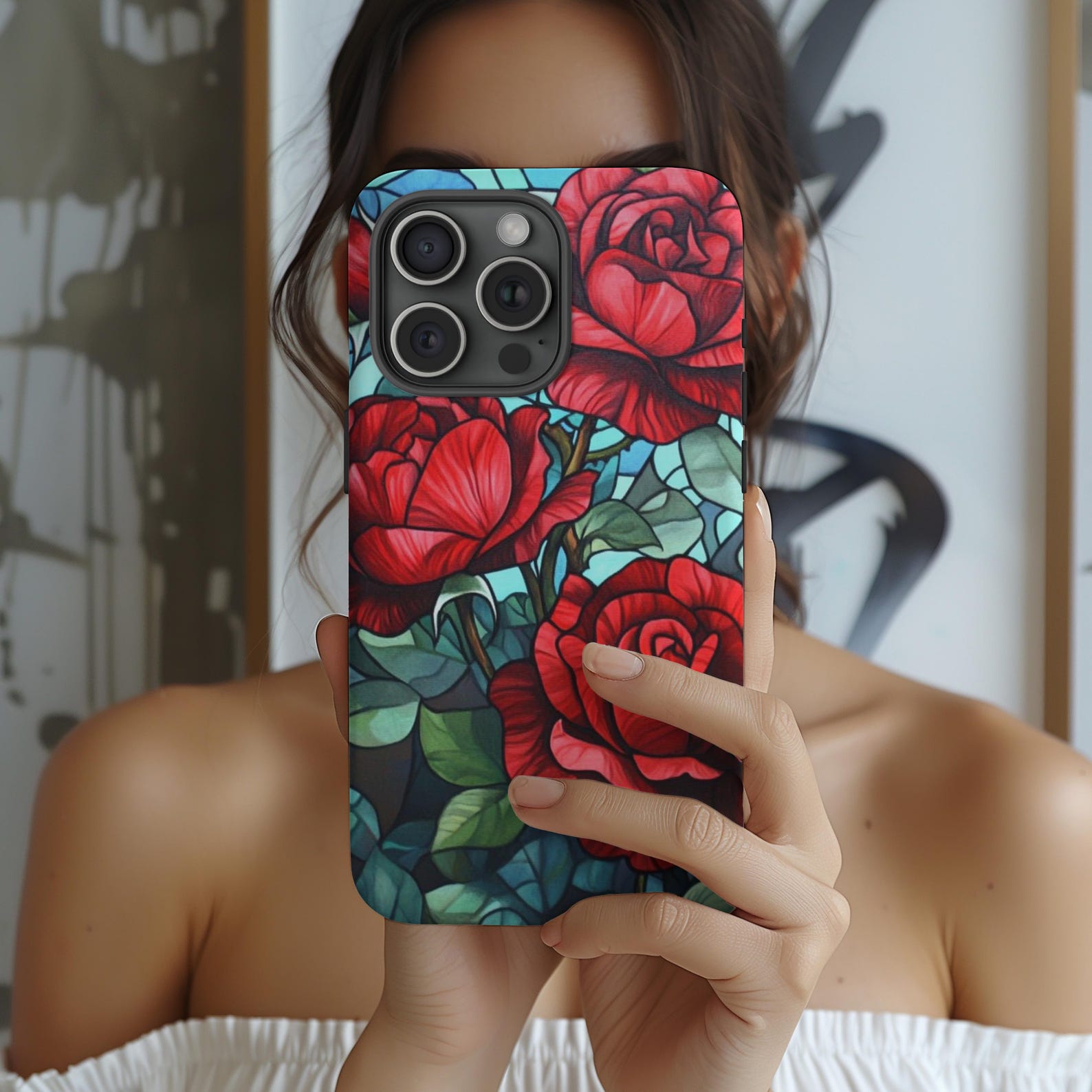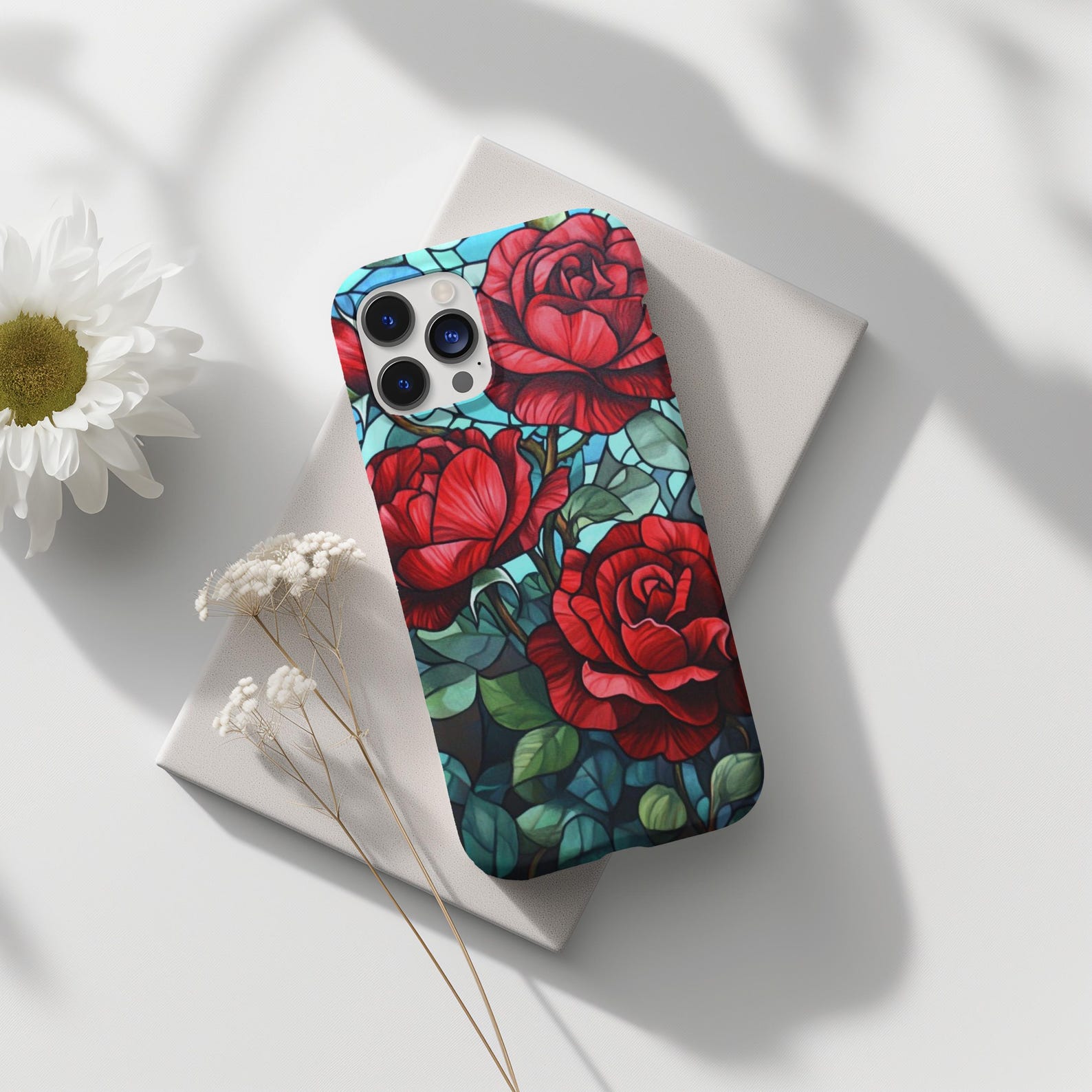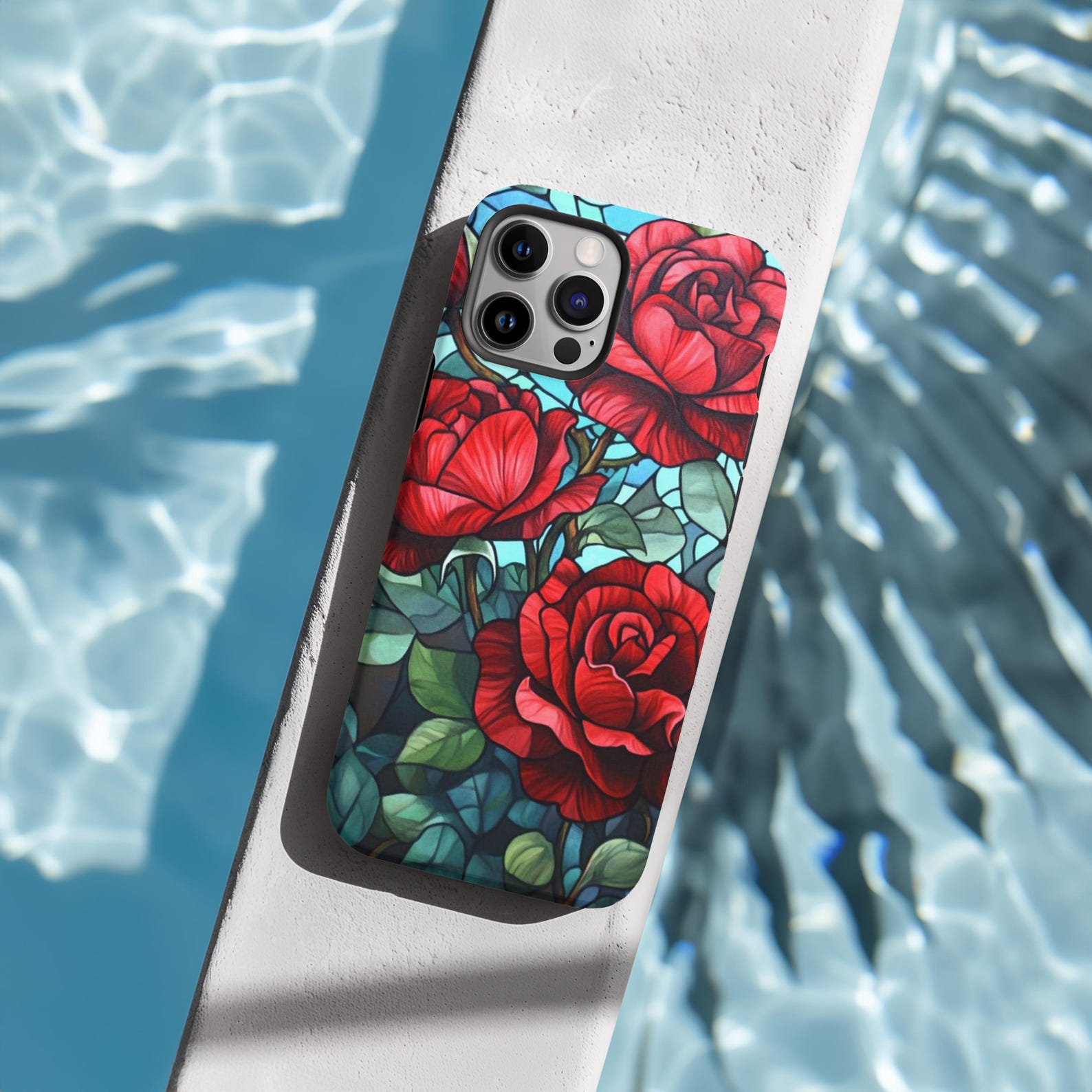 This stunning phone case features a vibrant stained glass design showcasing beautiful red roses intertwined with lush green leaves. The intricate floral pattern is set against a soft blue backdrop, creating a modern yet classic aesthetic. Made from durable materials, this case is both shockproof and stylish, offering reliable protection against everyday bumps and drops. Elevate your phone’s look while keeping it safe with this eye-catching and elegant accessory.