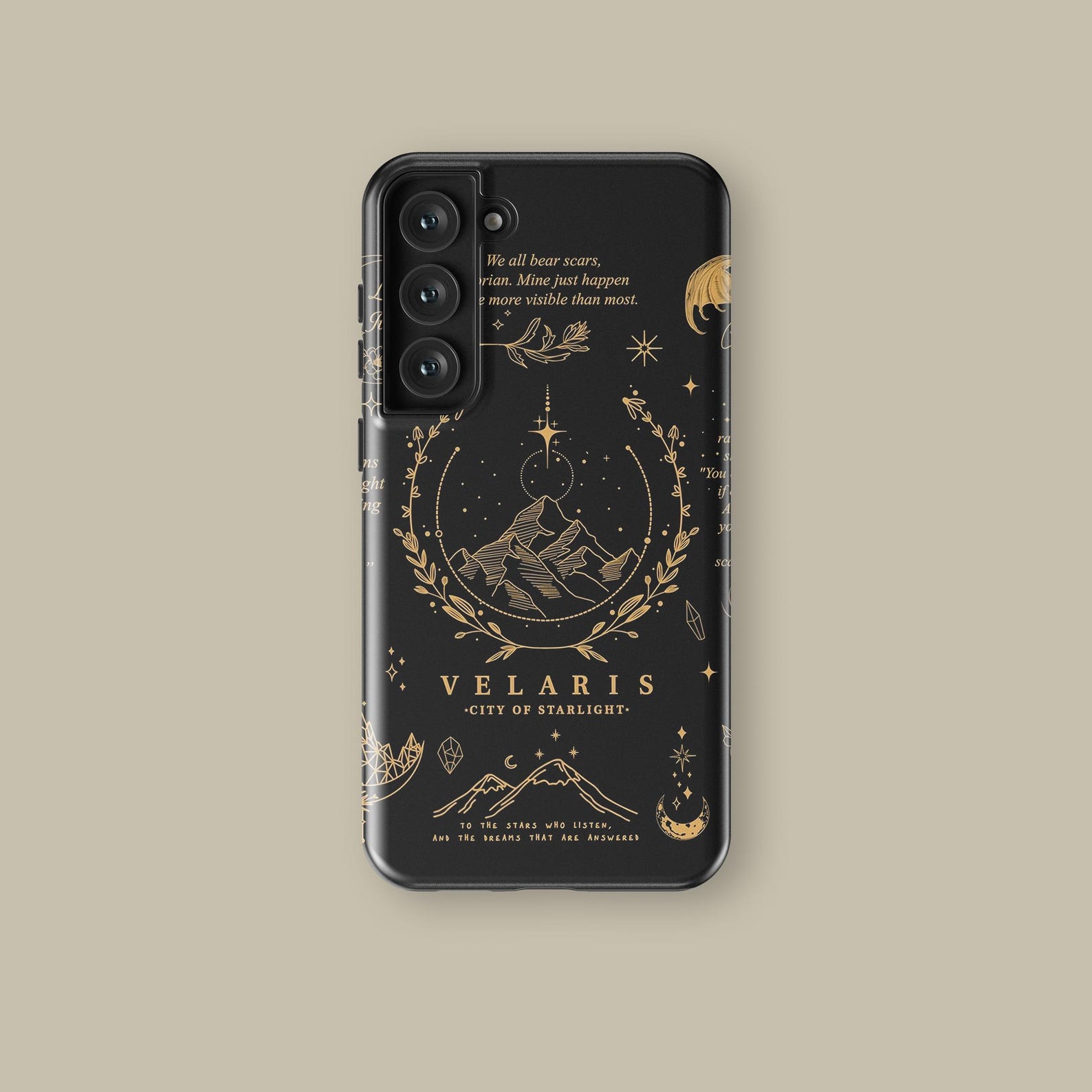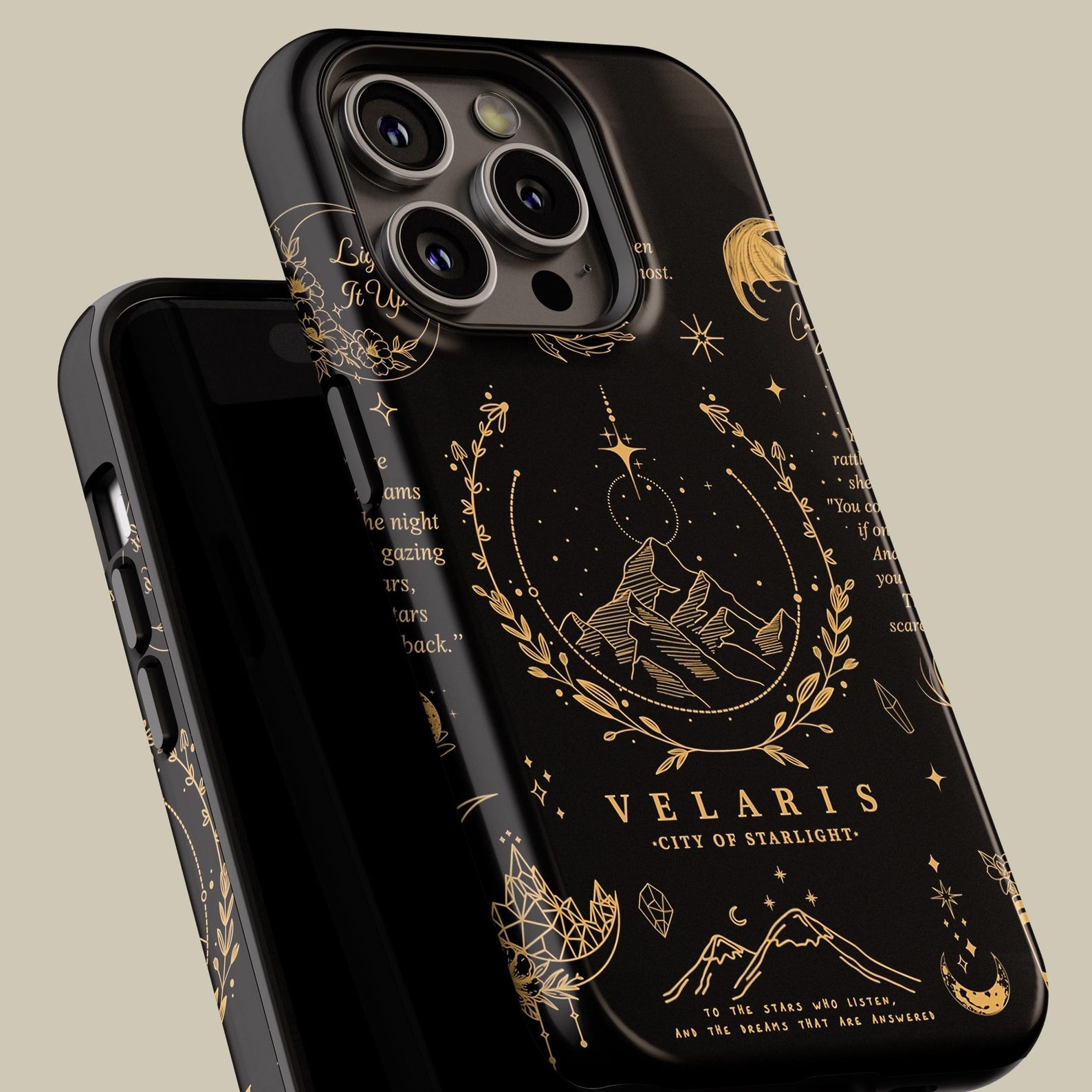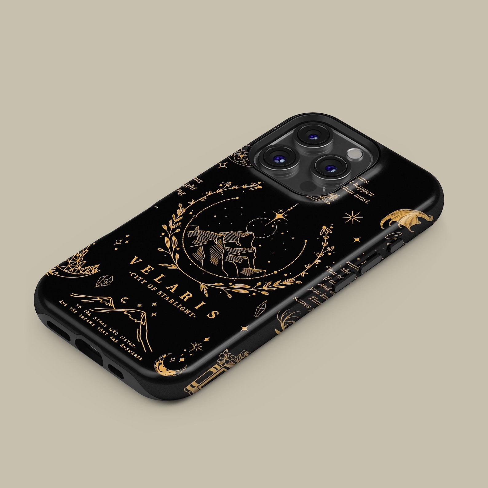 This stunning phone case features a mystical celestial design, combining elements of mountains and stars with elegant gold accents on a sleek black background. The intricate illustrations create a dreamy vibe, perfect for those who appreciate a touch of magic in their everyday accessories. Made from durable materials, this tough phone case offers shockproof protection while maintaining a stylish look. Embrace your love for the night sky and adventure with this enchanting phone case.