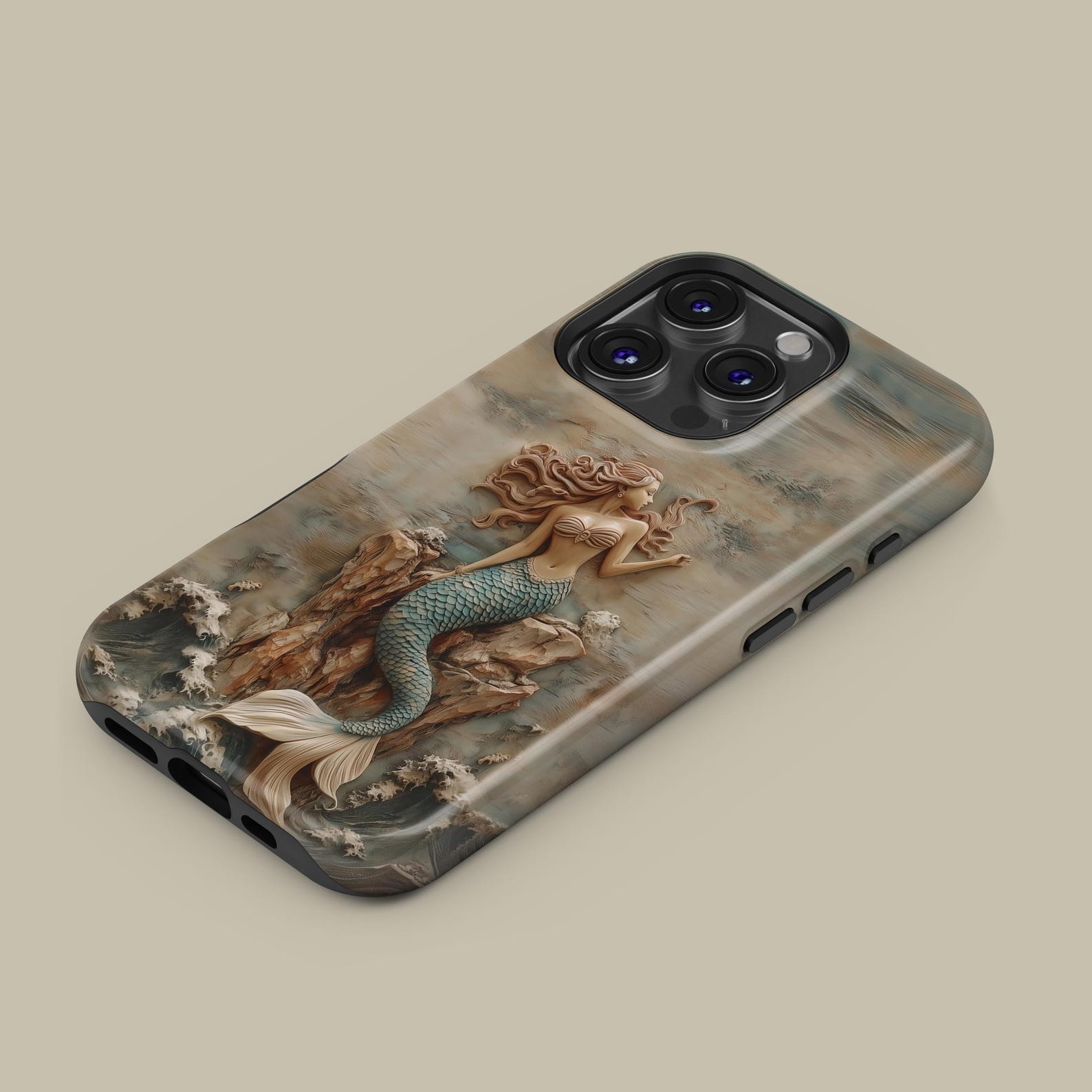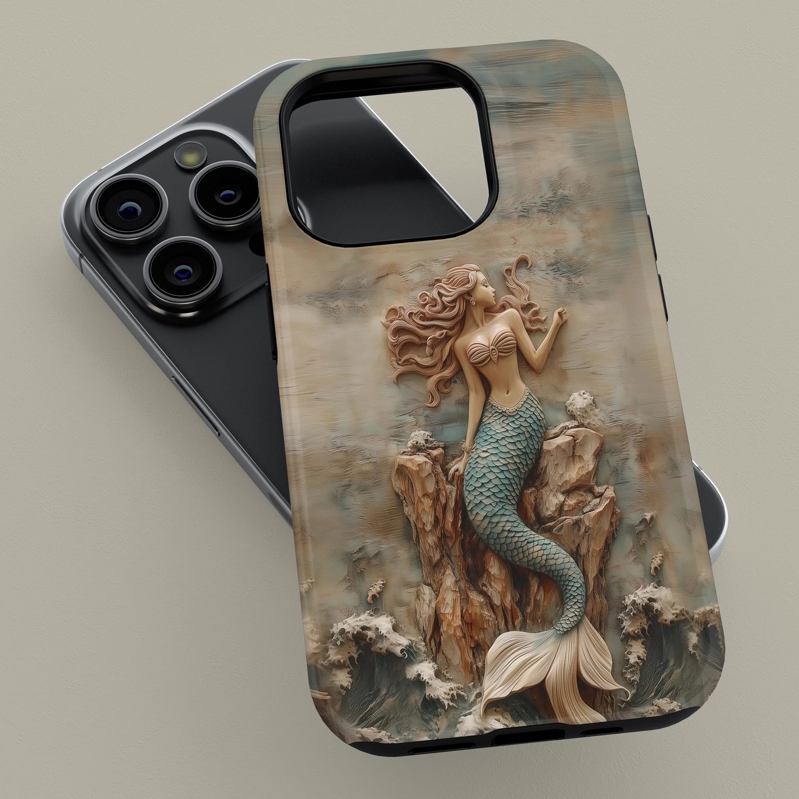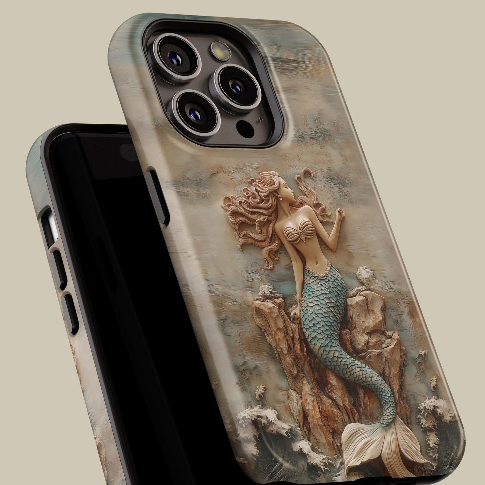 This tough phone case features a stunning mermaid design that captures the magic of the sea. The color palette combines soft, earthy tones with vibrant blues, creating a captivating underwater scene. Made from durable materials, this case offers excellent shock protection while maintaining a sleek and glossy finish. Its unique artistic style adds a touch of elegance and whimsy, perfect for ocean lovers and those who appreciate intricate designs.