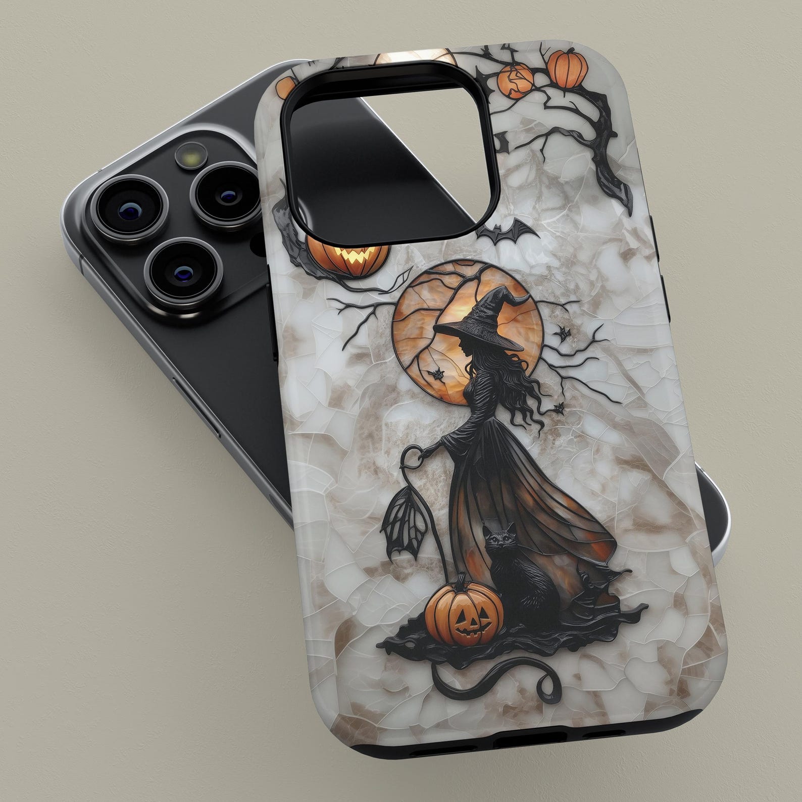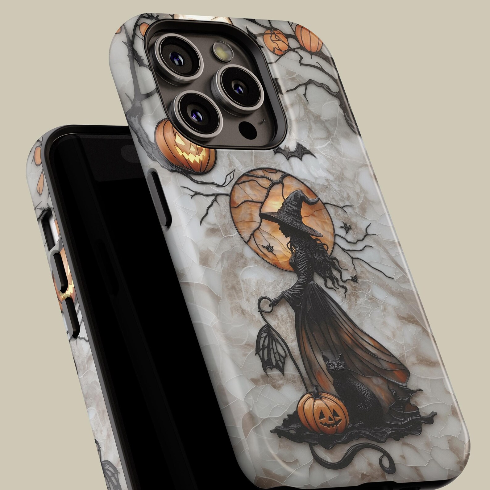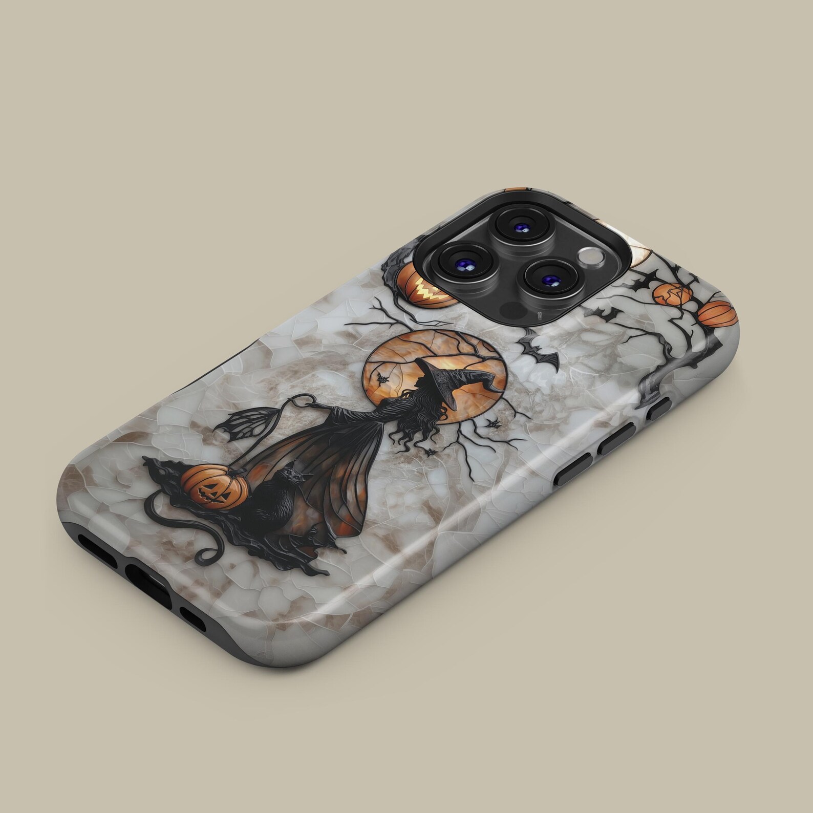 Embrace the spirit of Halloween with this captivating phone case featuring a whimsical witch design. Set against a soft, marbled background, this case showcases rich colors of orange and black, giving it a playful yet elegant vibe. Made from durable materials, it offers excellent protection while maintaining a glossy finish that enhances the artwork. This stylish accessory is perfect for those who appreciate seasonal aesthetics and want to keep their phone safe.