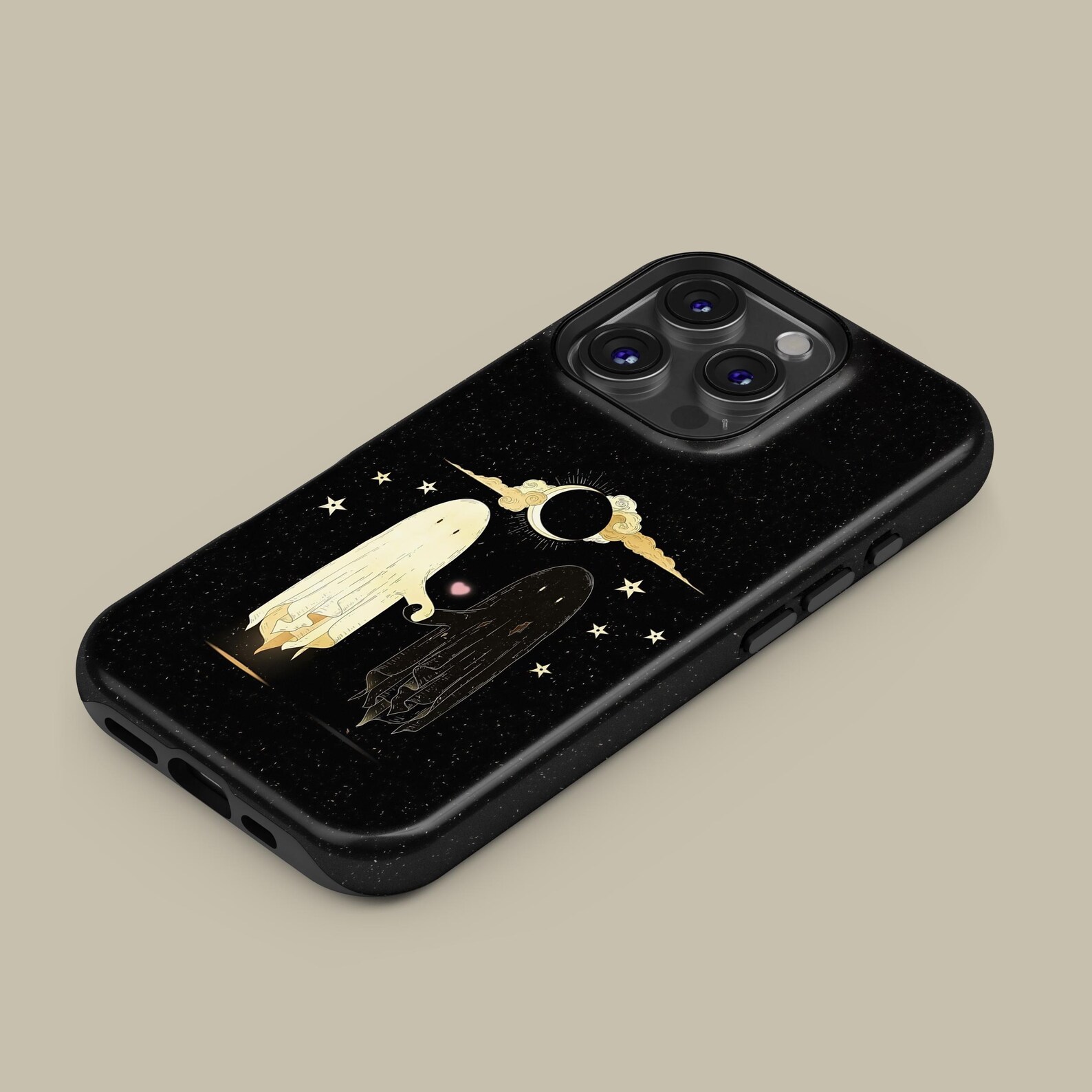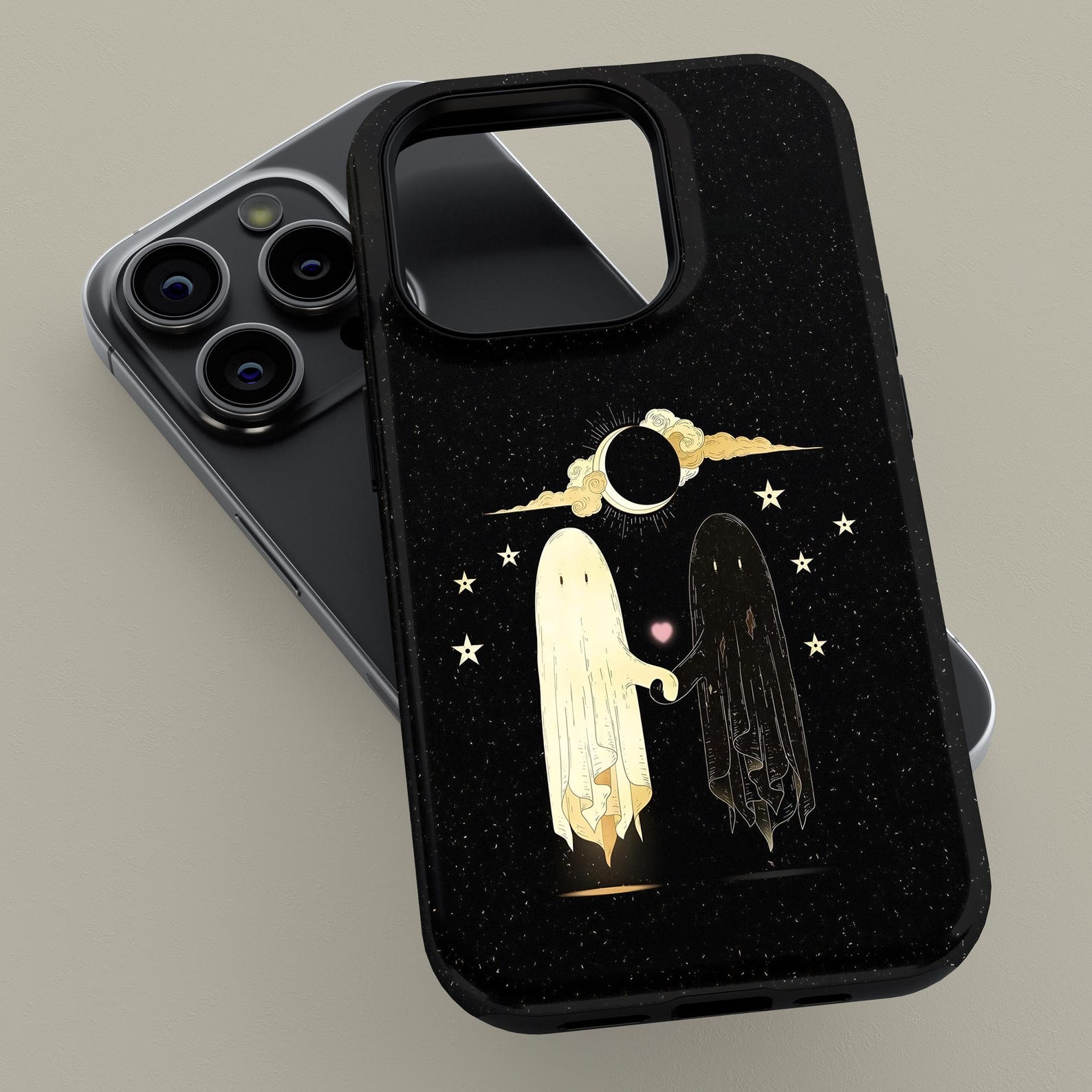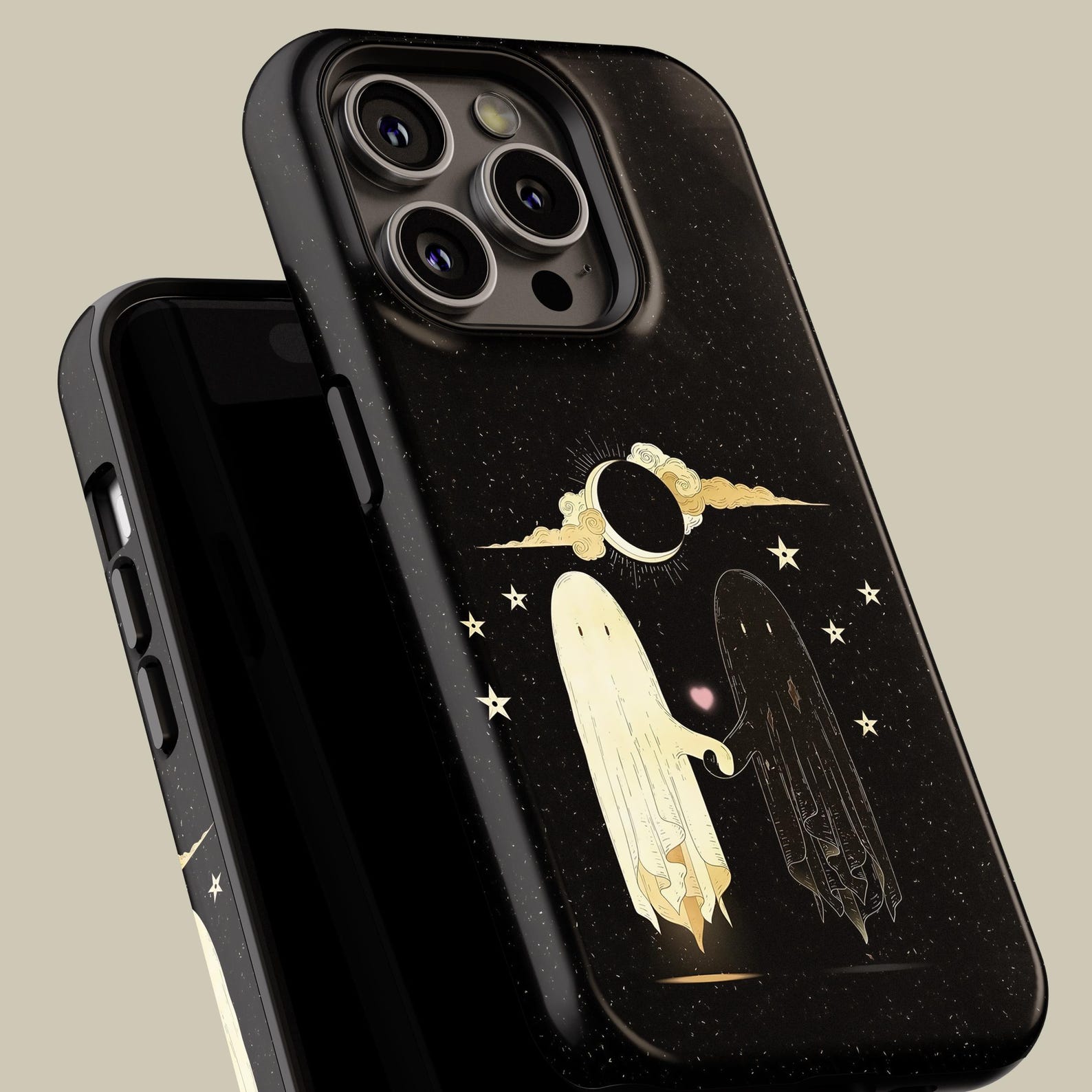 Embrace the playful spirit with this ethereal ghost-themed phone case. Featuring a striking design of two friendly ghosts in gold, set against a sleek black background, this case captures an enchanting mood. Crafted from durable materials with a matte finish, it offers reliable shockproof protection for your device. The whimsical stars and clouds add a dreamy touch, making this case perfect for those who appreciate modern and quirky aesthetics.