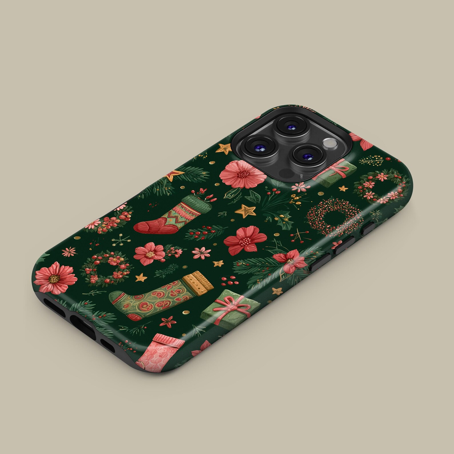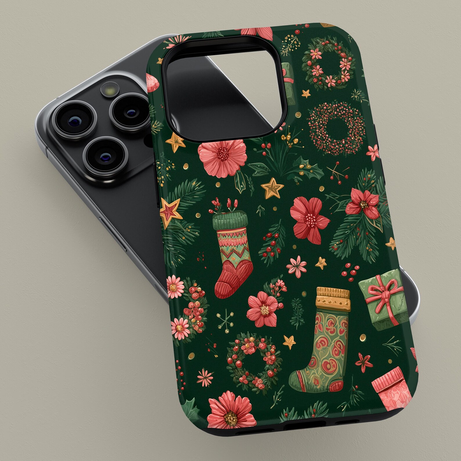 Embrace the holiday spirit with this festive phone case featuring charming stockings, blooming flowers, and holiday decorations on a rich green background. The vibrant colors exude warmth and joy, making it perfect for the season. Crafted from durable material, this case offers excellent protection while maintaining a glossy finish. Its playful design radiates a cheerful vibe, perfect for those who love to celebrate in style.
