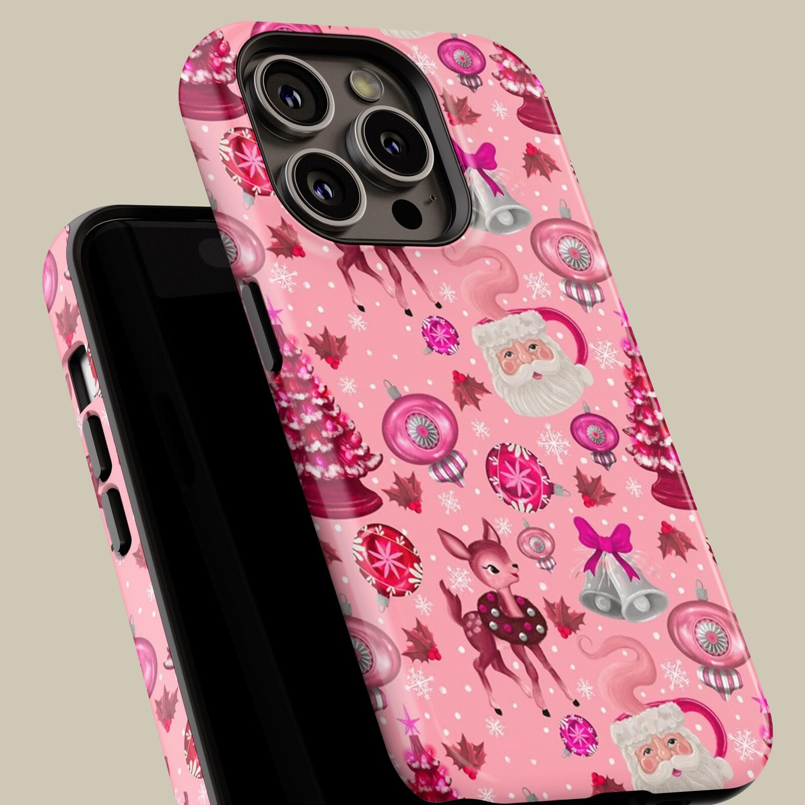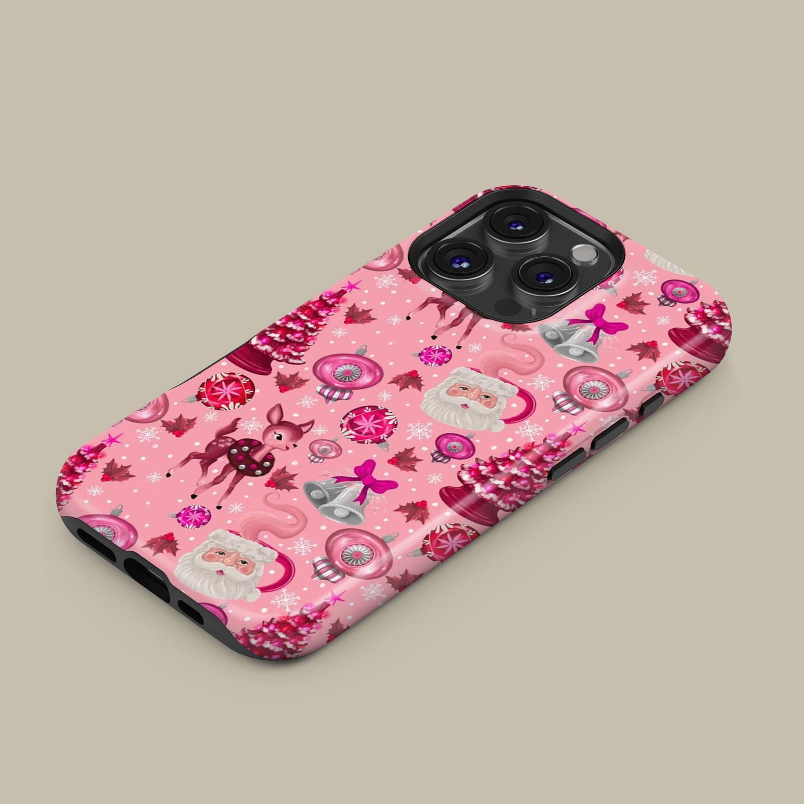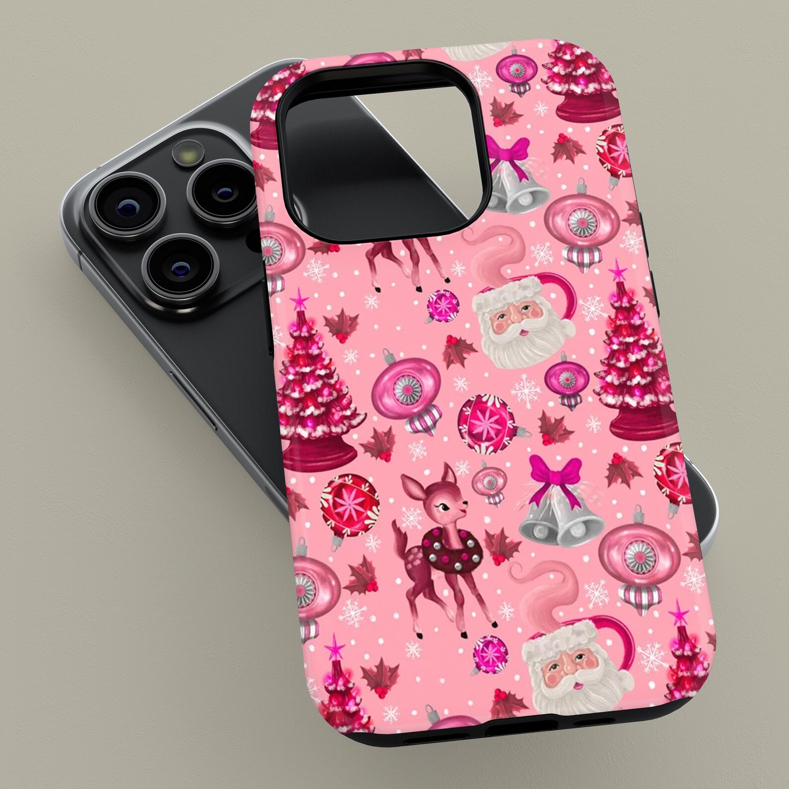 Embrace the holiday spirit with this playful phone case featuring a delightful pink background adorned with whimsical Christmas motifs. It showcases charming elements like Santa, reindeer, and evergreen trees, all designed in vibrant colors that evoke cheer and nostalgia. Made from durable material, this case provides excellent protection while ensuring a comfortable grip. Its glossy finish adds a touch of modern flair, making this case not just protective but also a stylish accessory for any festive occasion.