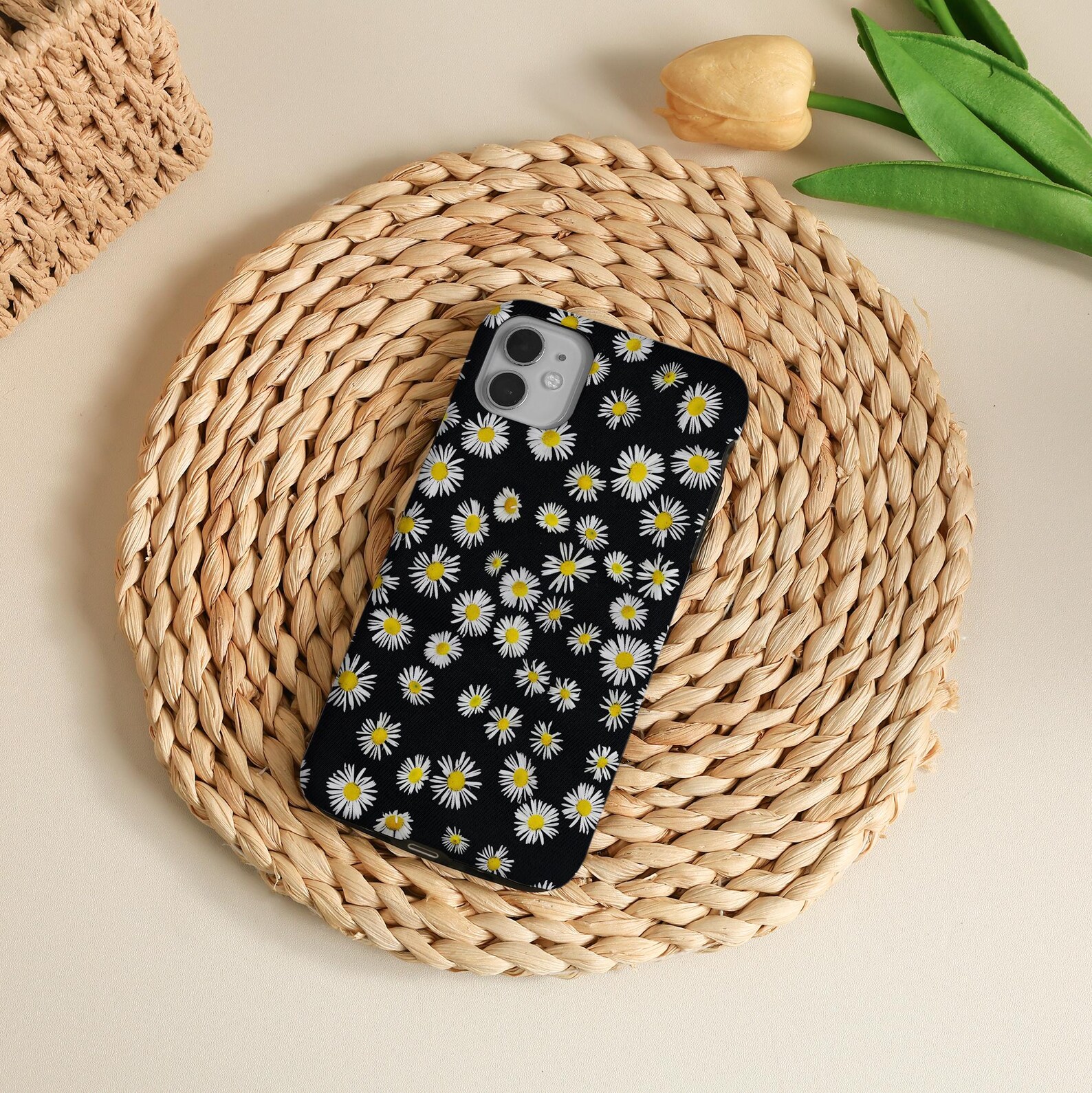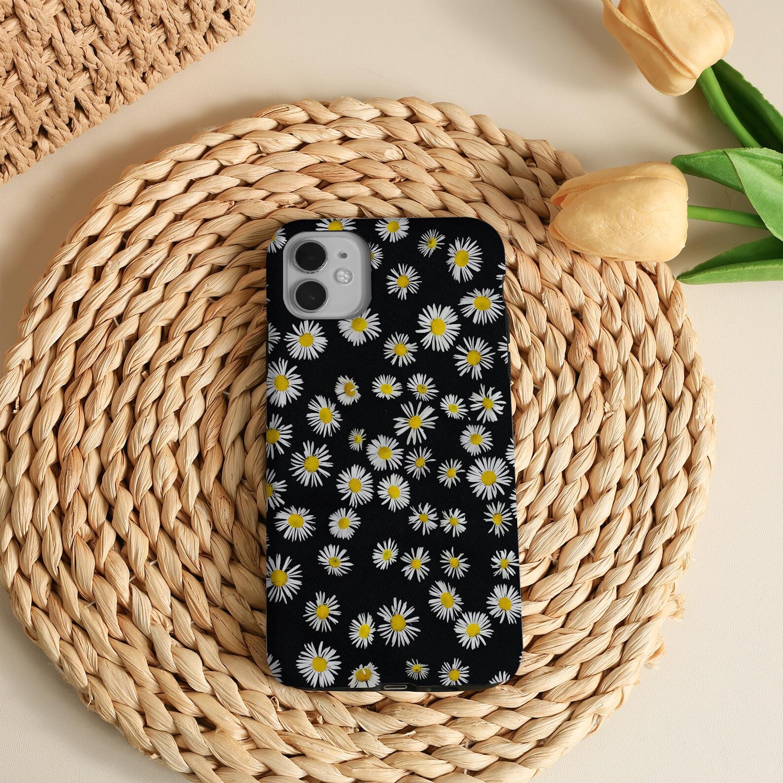 This charming phone case showcases a delightful floral design featuring vibrant white daisies set against a sleek black background. The combination of cheerful blooms and dark tones creates a stylish contrast that is both modern and playful. Made from durable materials, this case offers shockproof protection while ensuring a matte finish that feels great in your hands. Perfect for those who love to add a touch of nature-inspired elegance to their everyday carry.