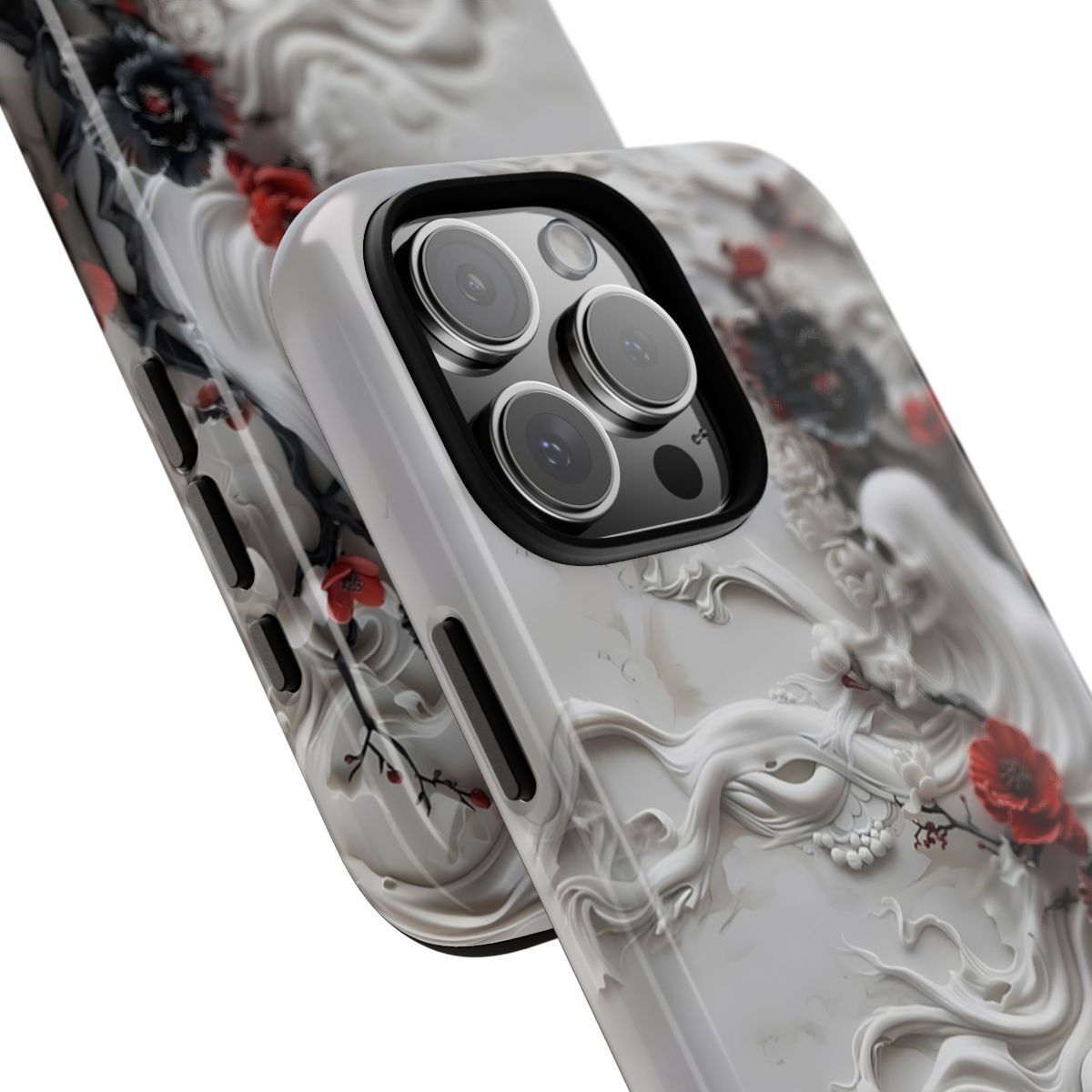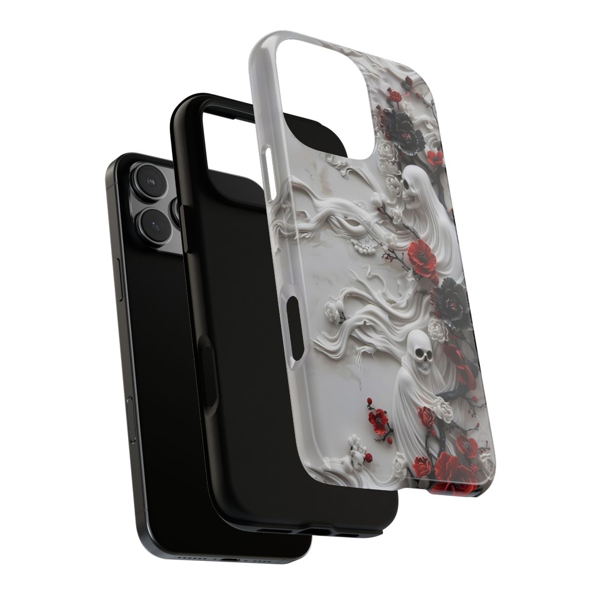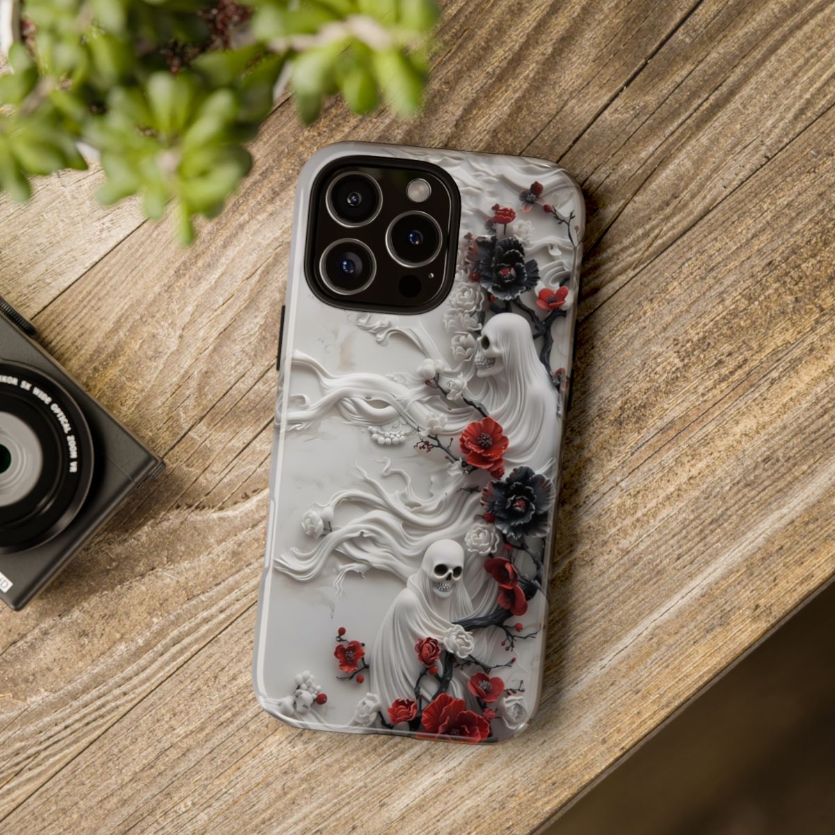 Embrace the spirit of Halloween with our Hauntingly Beautiful Skull Phone Case, featuring a striking design that combines ethereal ghosts and vibrant red and black floral elements. This unique phone case not only provides robust protection for your device but also showcases an intricate 3D-like pattern, making it a perfect accessory for those who revel in the spooky charm of the season. Ideal for Halloween enthusiasts, this case is sure to turn heads while keeping your phone safe from everyday bumps and drops.
