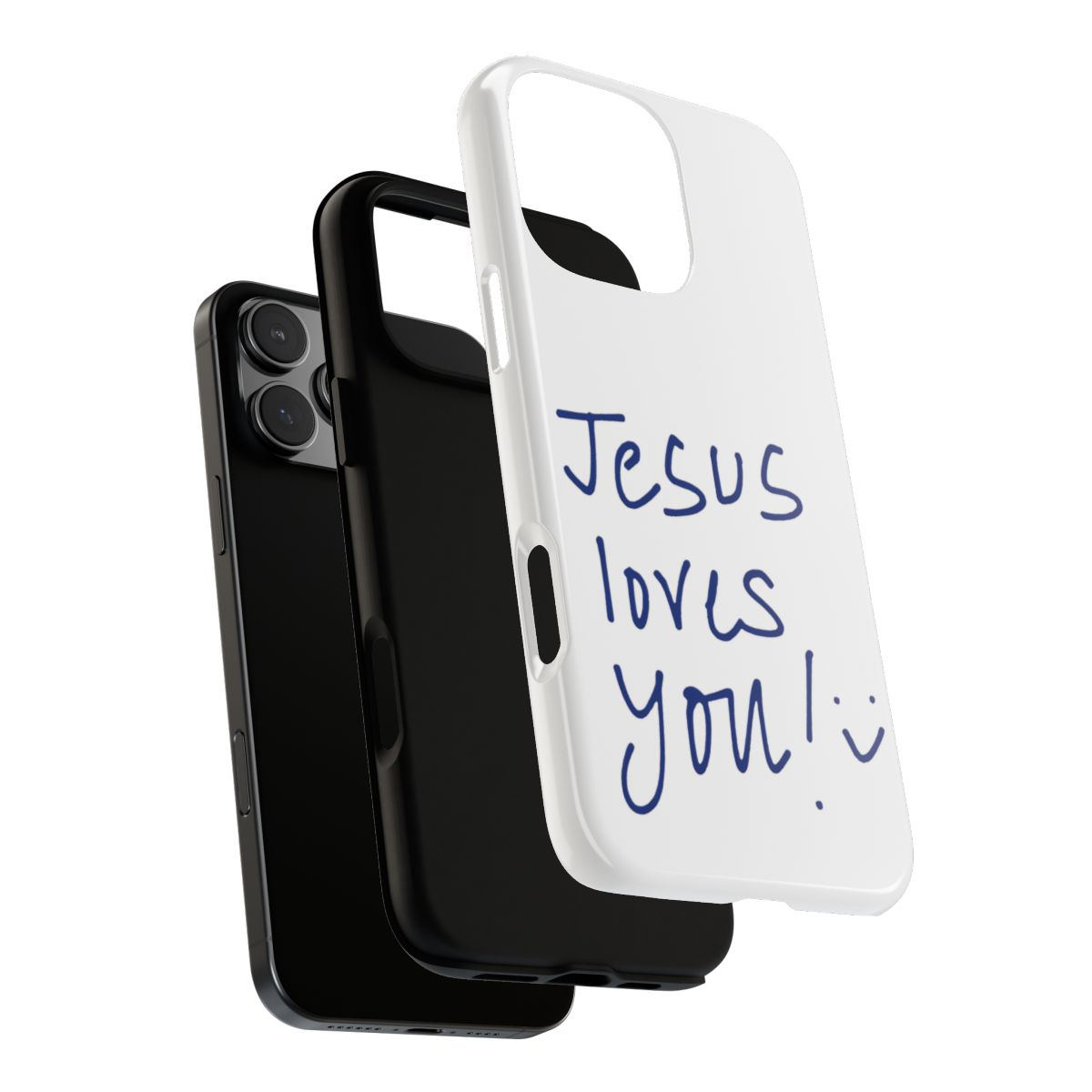 Spread positivity and love with our “Jesus Loves You!” phone case. This eye-catching design features a handwritten message that serves as a daily reminder of faith and kindness. Made from durable materials, this phone case offers excellent protection while adding a personal touch to your device. Perfect for anyone looking to express their faith or gift to loved ones, this case is a great conversation starter and a stylish accessory that shines with hope and positivity.