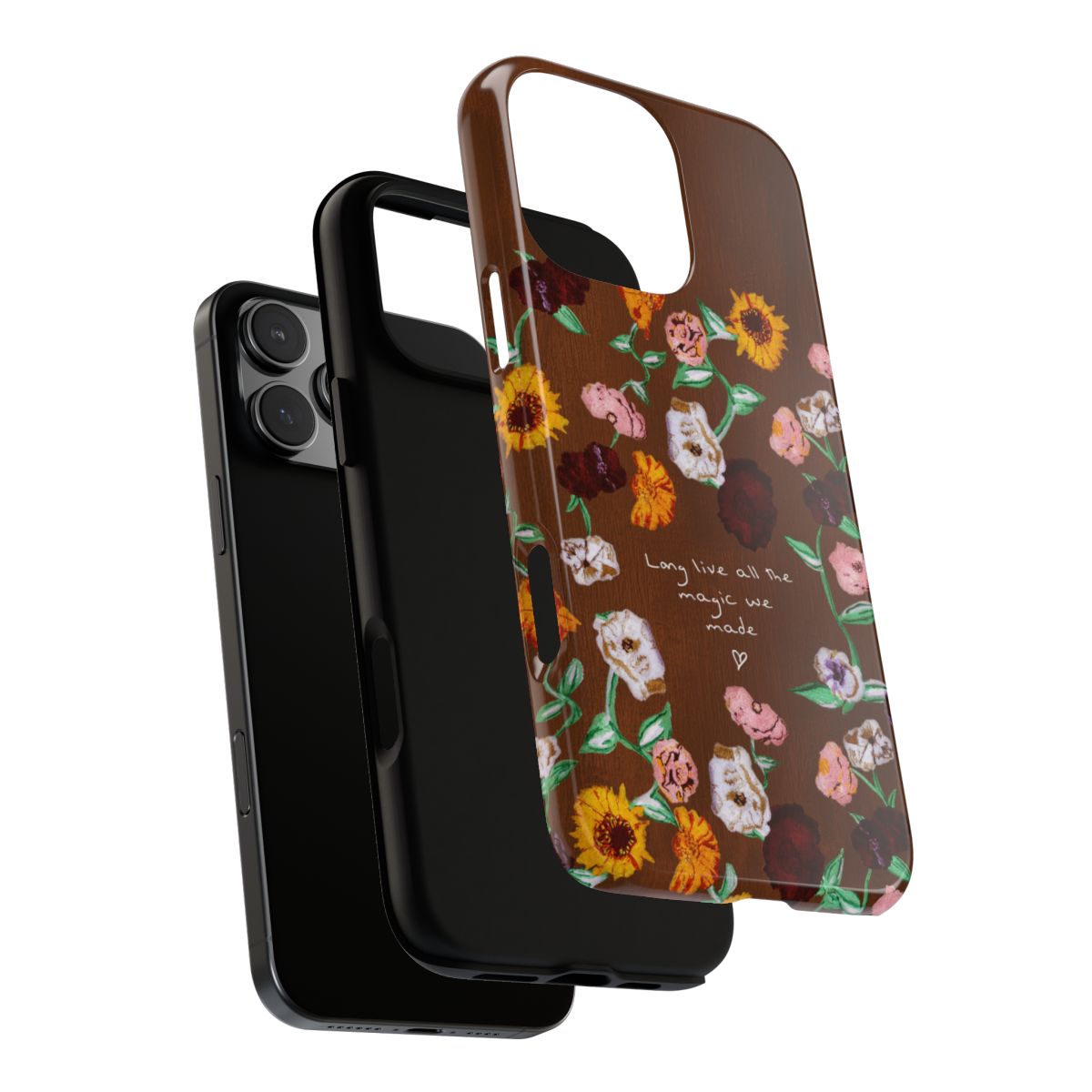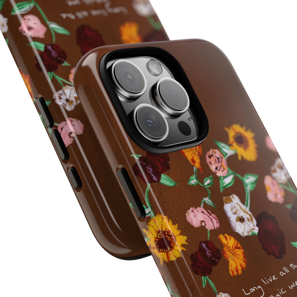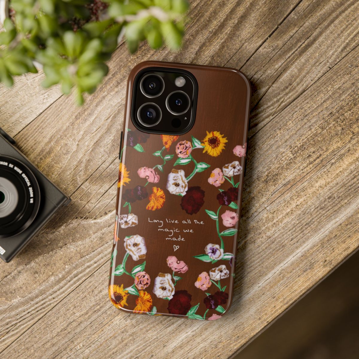 Introducing our Floral Magic Phone Case, a perfect blend of beauty and inspiration. Adorned with a picturesque array of vibrant flowers, this case brings a splash of color to your everyday life. Featuring the heartfelt quote “Long live all the magic we made,” this unique design not only protects your phone but also serves as a daily reminder of cherished memories and creativity. Crafted from durable materials, it offers excellent protection against drops and scratches while ensuring easy access to all ports. Ideal for floral lovers and those who appreciate a touch of elegance and positivity in their accessories.
