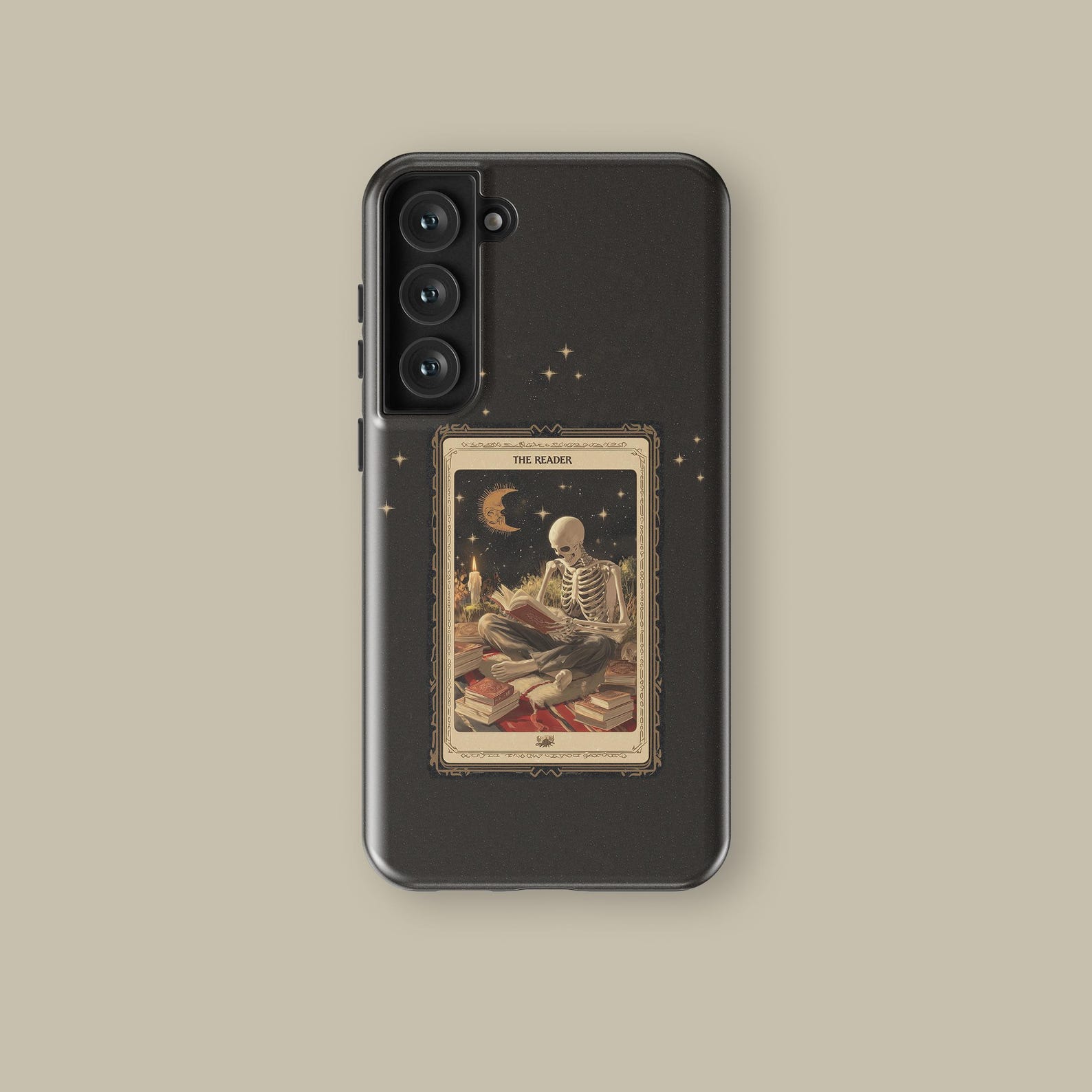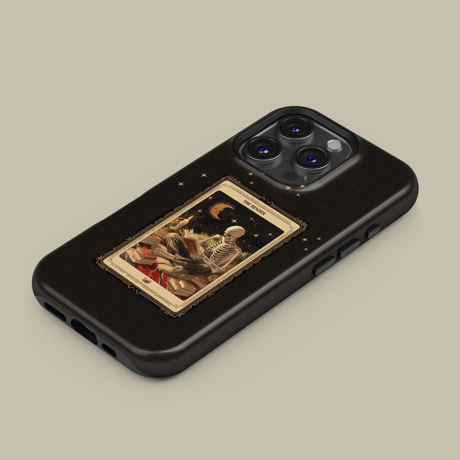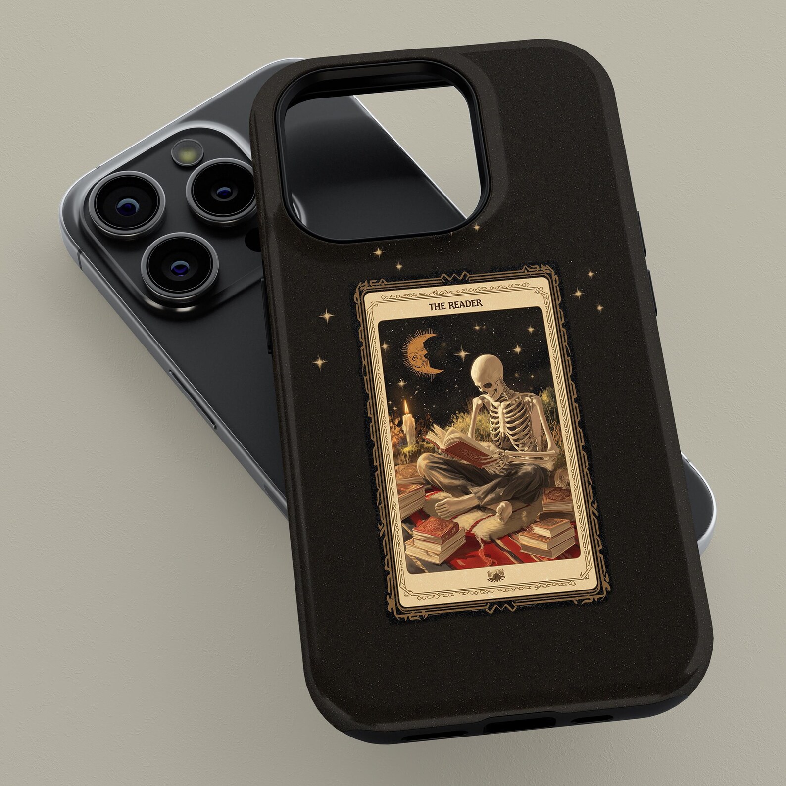 This unique phone case features a captivating skeleton design set against a dark backdrop. The artwork portrays a serene scene of a skeleton reading among stacks of books, beautifully framed with celestial elements. Crafted from durable, shockproof material, it offers both protection and style. Perfect for those who appreciate a blend of gothic and literary themes, this case adds an artistic touch to your device while ensuring it remains safe.