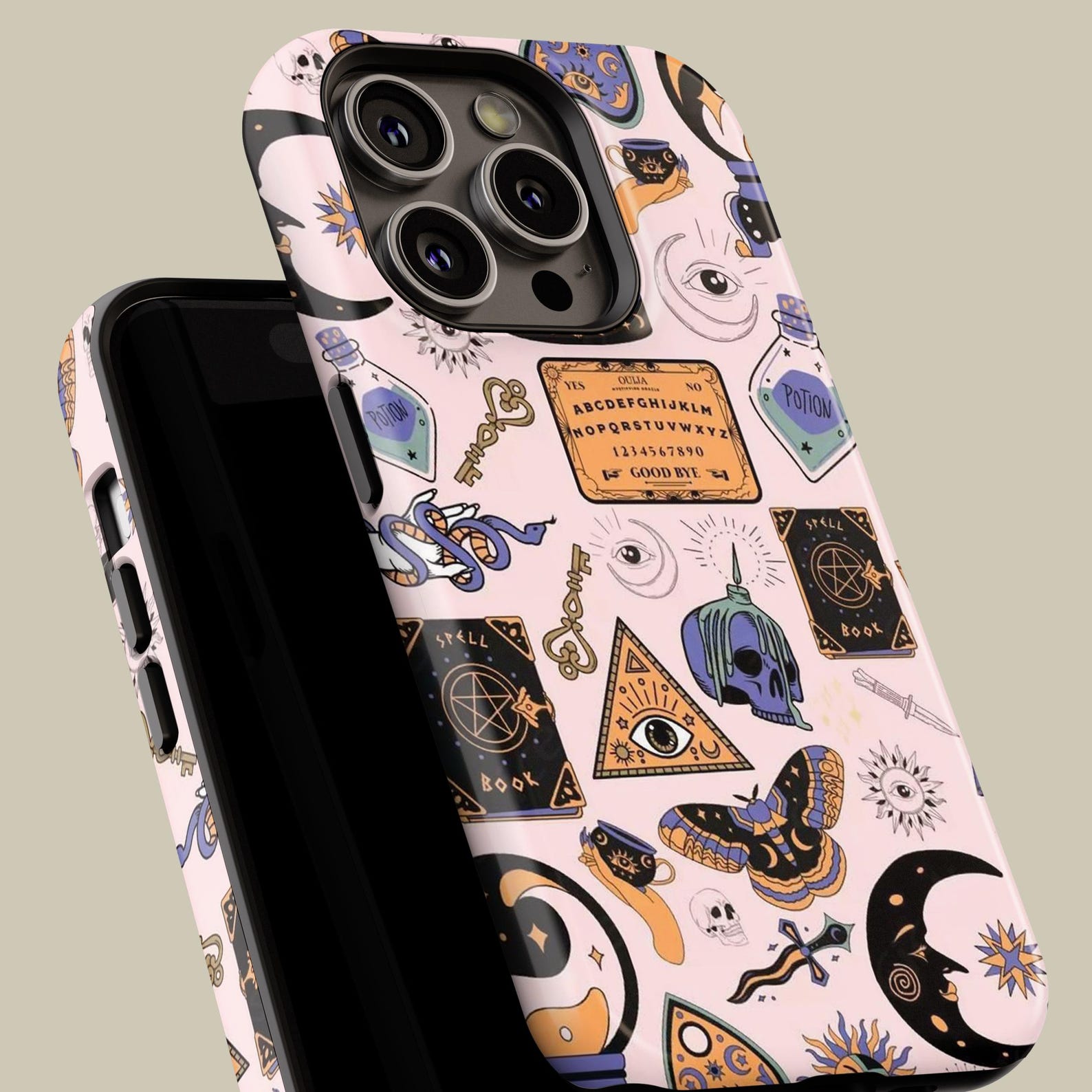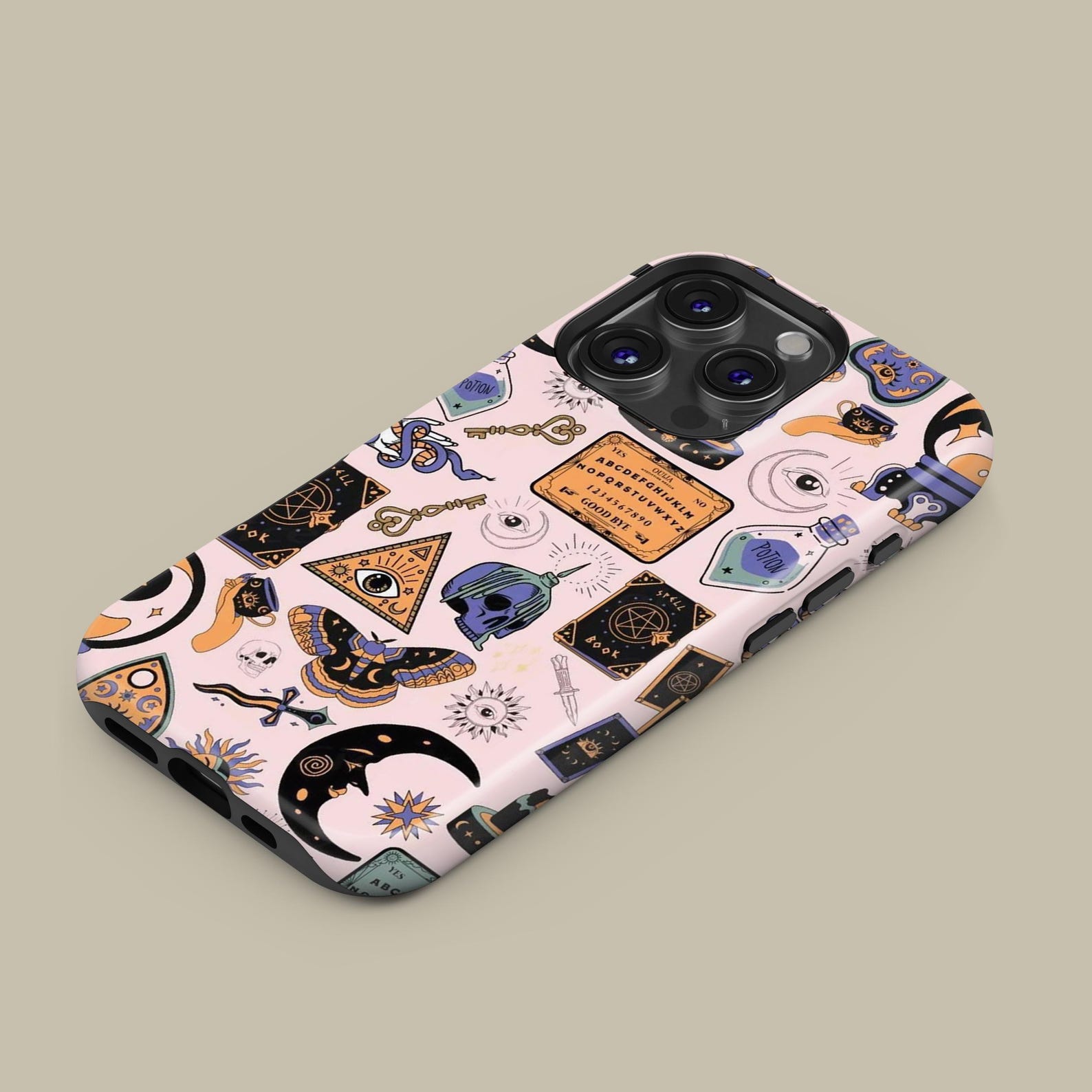 Embrace a touch of enchantment with this mystical phone case featuring a captivating occult-themed design. The playful combination of pastel pink and striking black elements creates a whimsical vibe, perfect for anyone drawn to the mysterious. Made from durable materials, this case offers excellent shockproof protection while maintaining a sleek finish. Its unique visuals, including stars, potions, and mysterious symbols, make it a standout accessory for those with a modern and adventurous style.