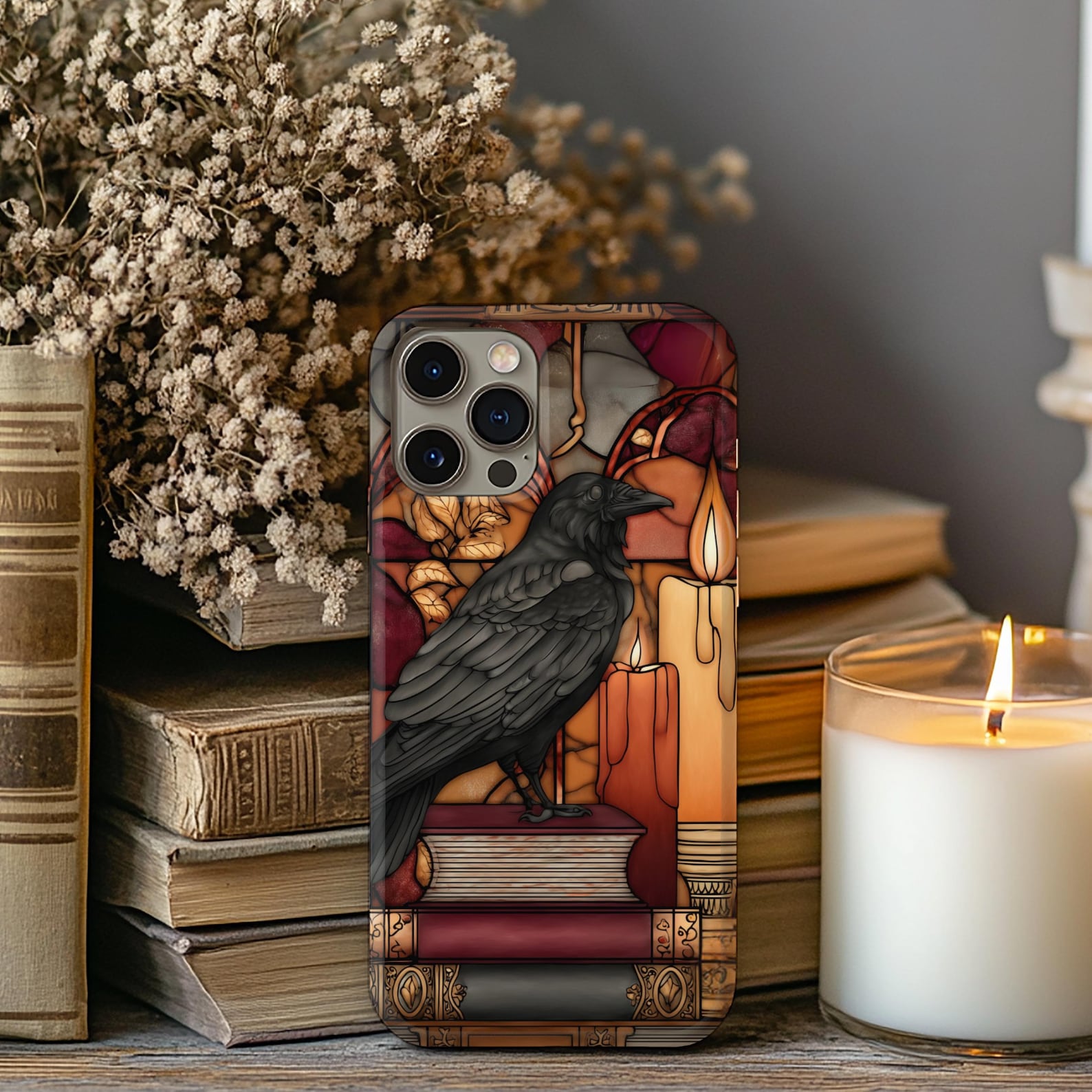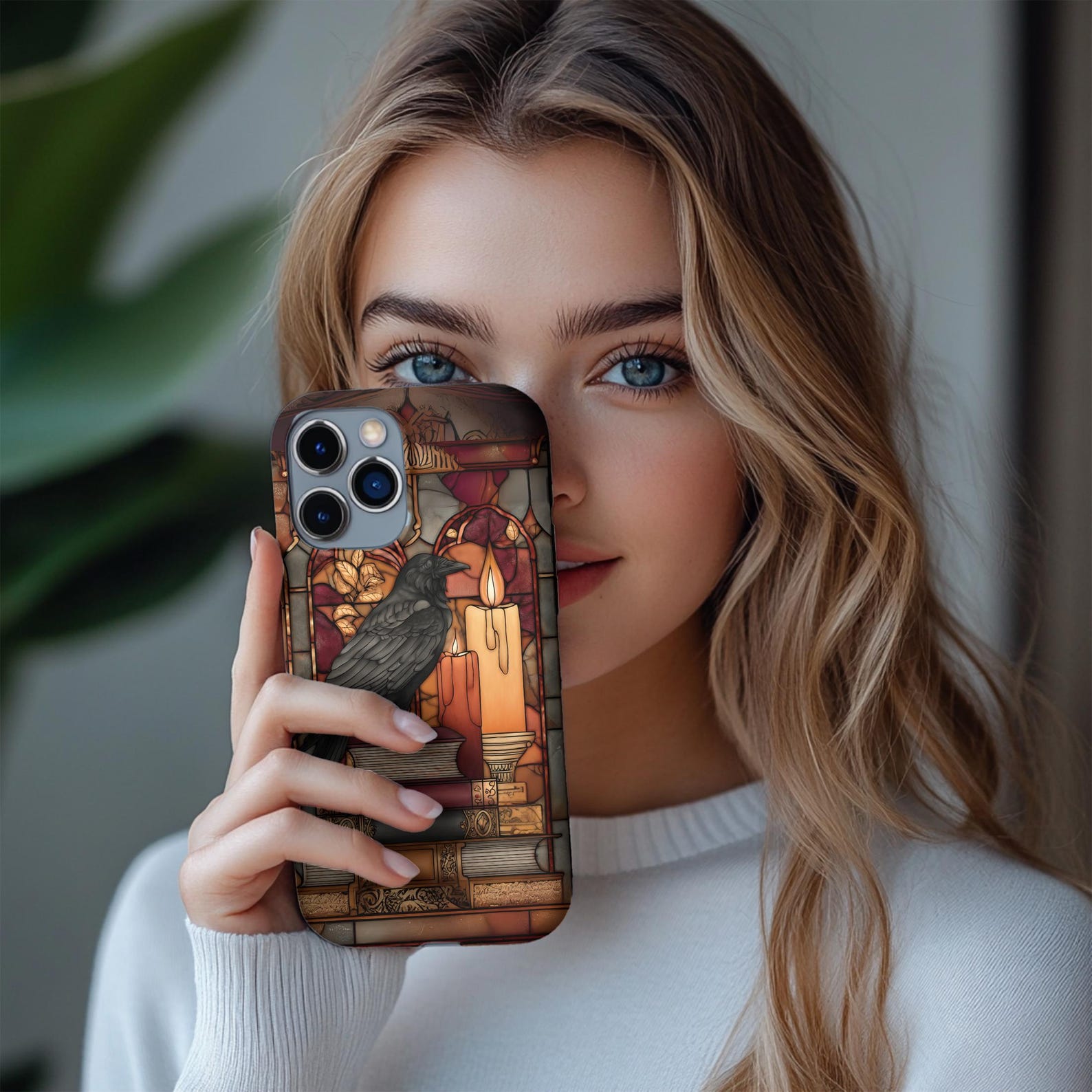 This artistic phone case features a striking raven perched next to illuminated candles, creating a captivating and enchanted vibe. The warm tones of amber and deep reds blend seamlessly with intricate details, giving it an elegant and whimsical touch. Crafted from durable materials, this case not only showcases a beautiful design but also offers robust protection against everyday wear and tear. Its glossy finish enhances the artistic elements, making it a perfect accessory for those who appreciate unique artistry.
