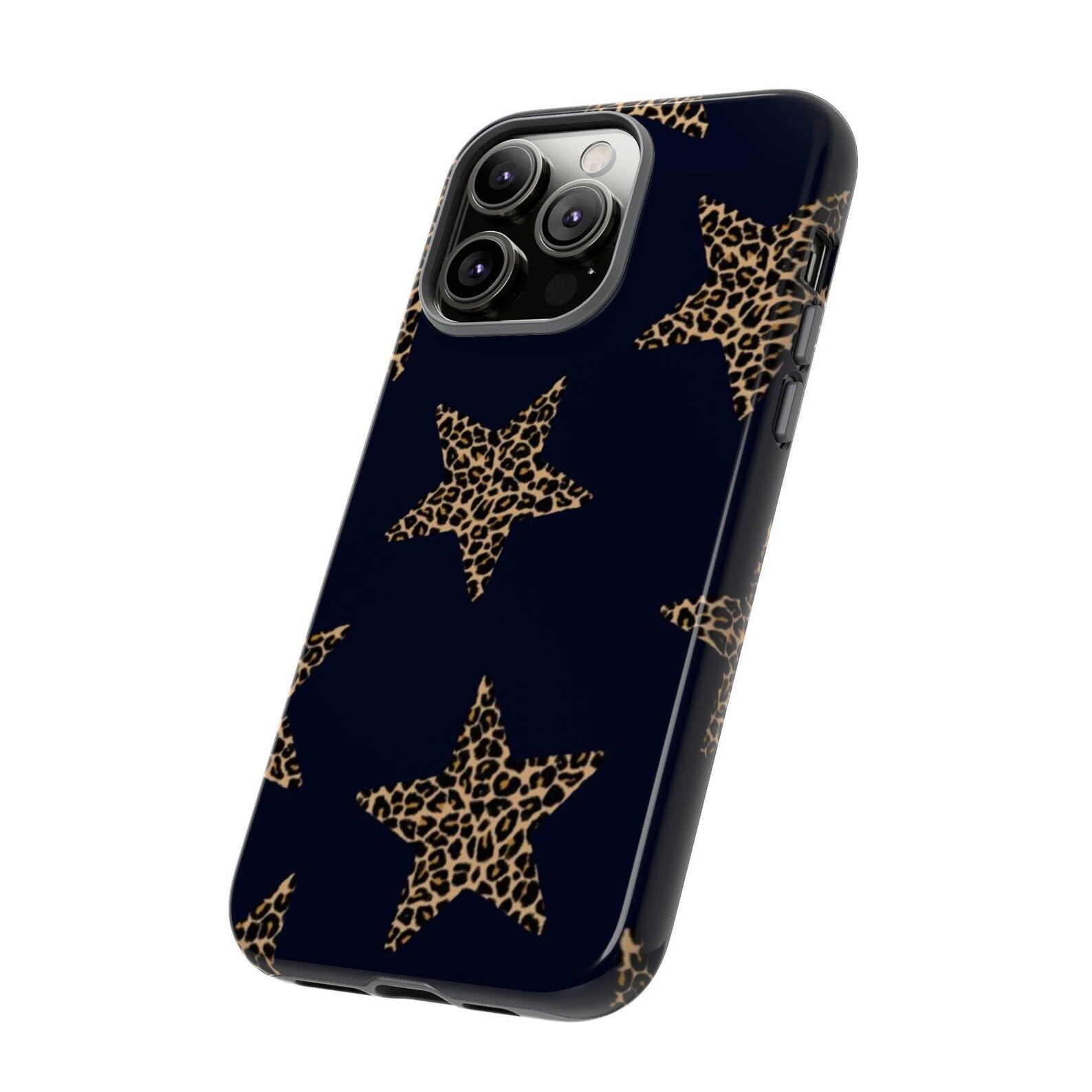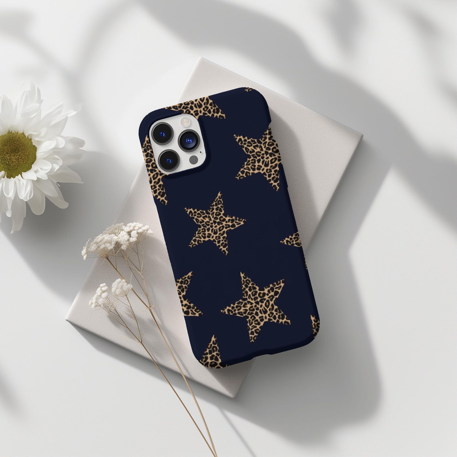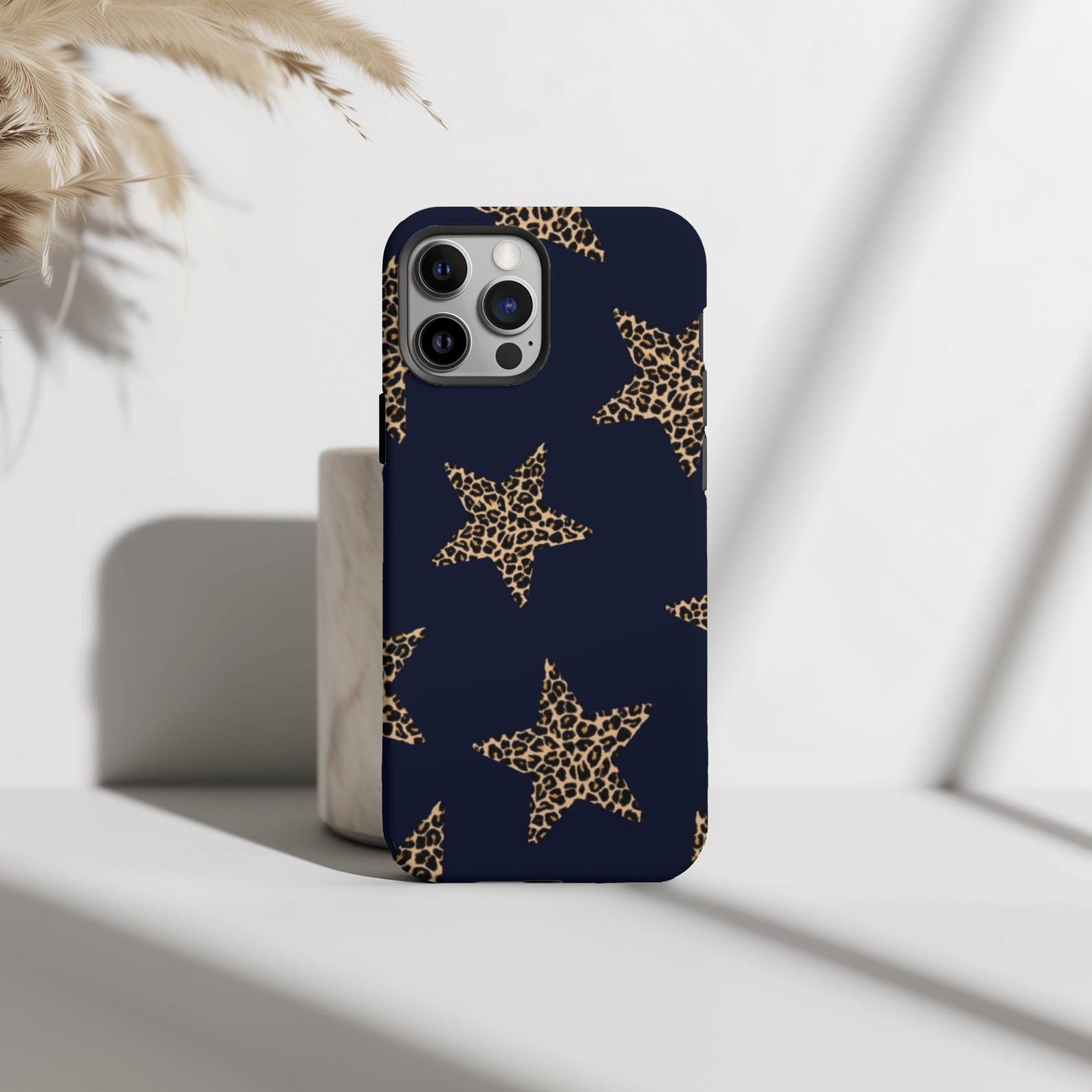 Showcasing a playful design, this phone case features a striking navy background adorned with bold leopard-print stars. The combination of animal print and star motifs creates a fun and trendy aesthetic, perfect for those who love to stand out. Made from durable materials, it ensures robust protection against everyday wear and tear while maintaining a sleek finish. Elevate your style with this unique case that brings a modern vibe to your device.