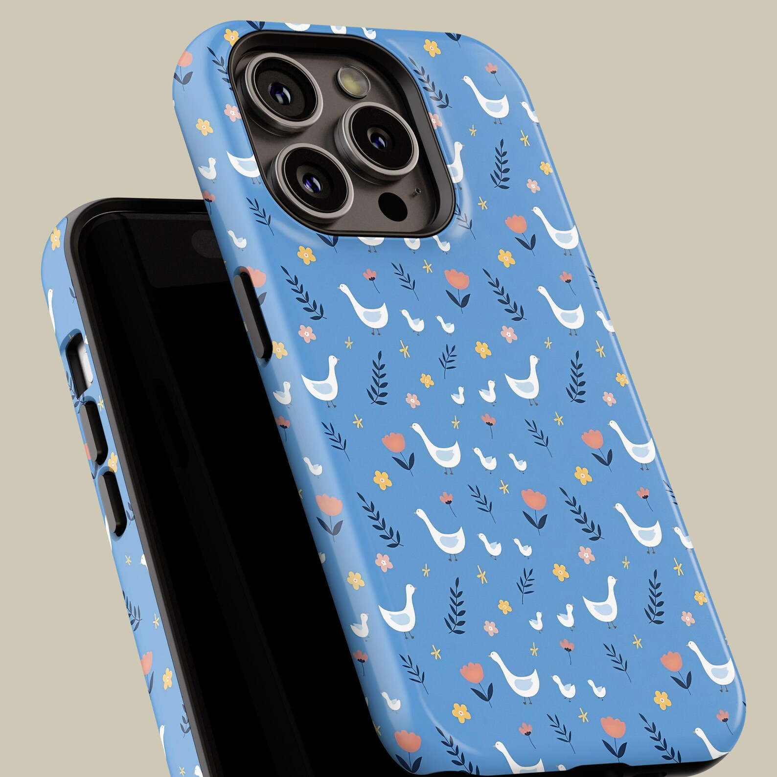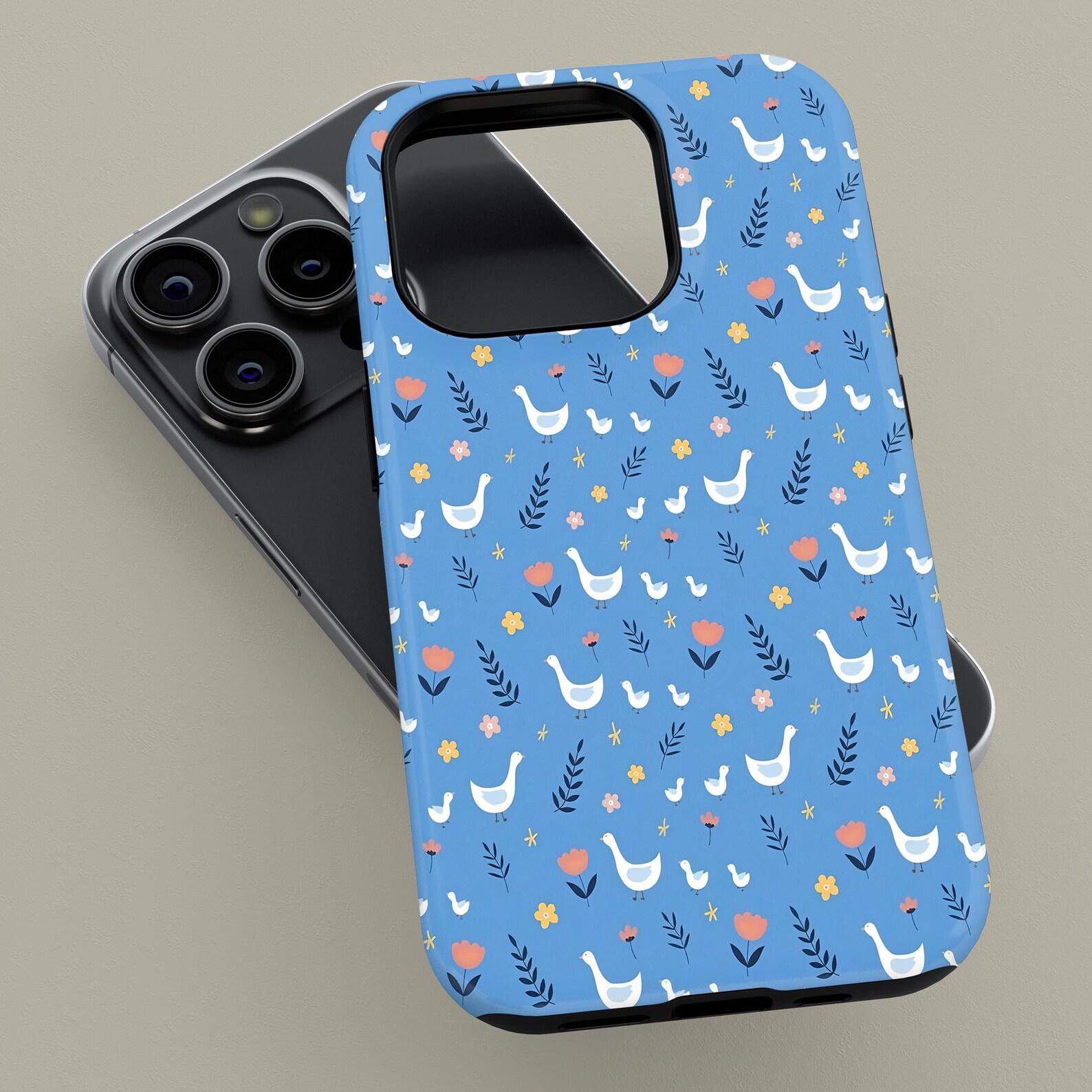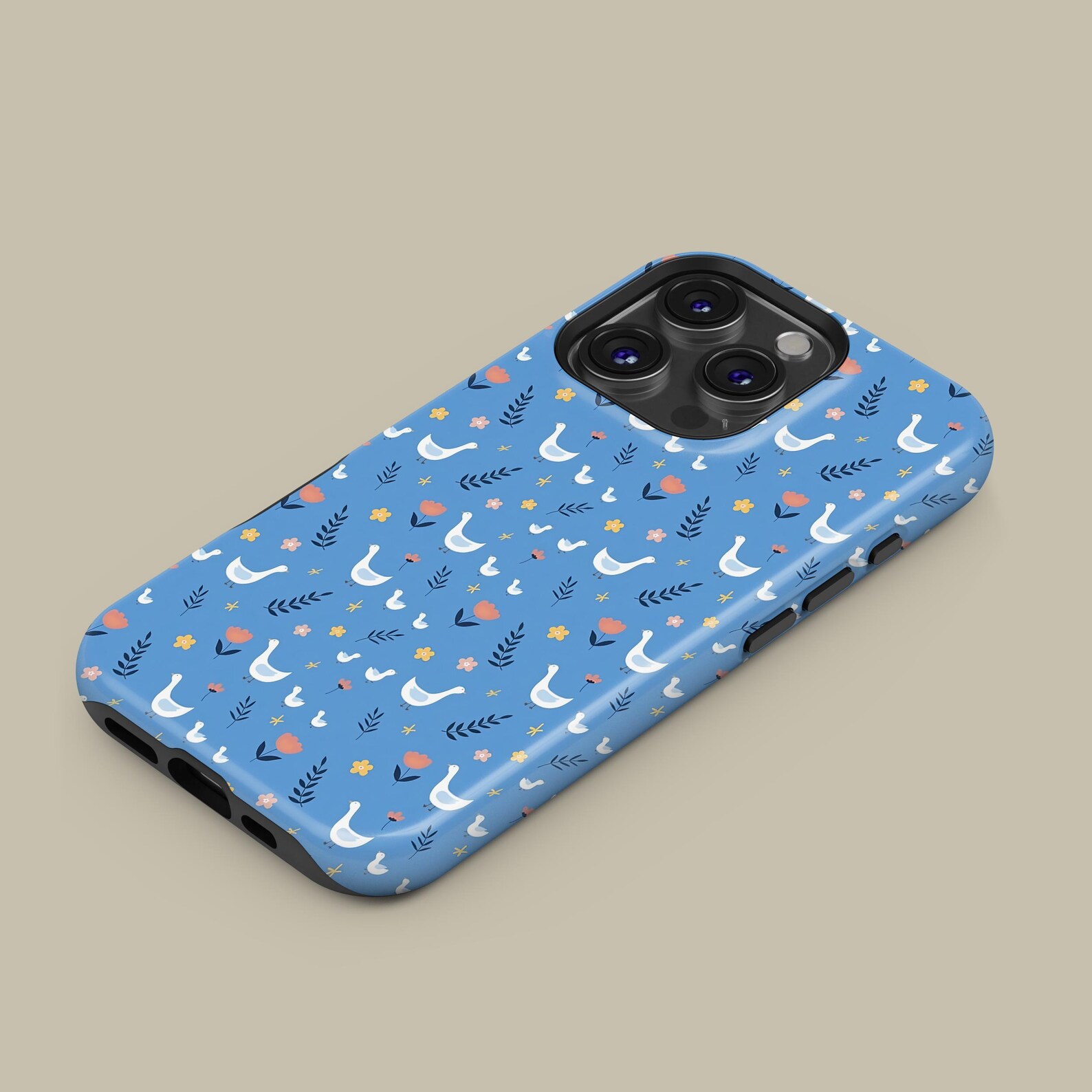 This charming phone case features a delightful pattern of playful birds and vibrant flowers, creating a cheerful vibe. The soft blue background beautifully contrasts with the colorful accents, making it a perfect blend of whimsy and style. Made from durable materials, it offers a shockproof texture with a glossy finish, ensuring your device stays protected while looking fabulous. Ideal for those who appreciate a modern yet playful aesthetic.