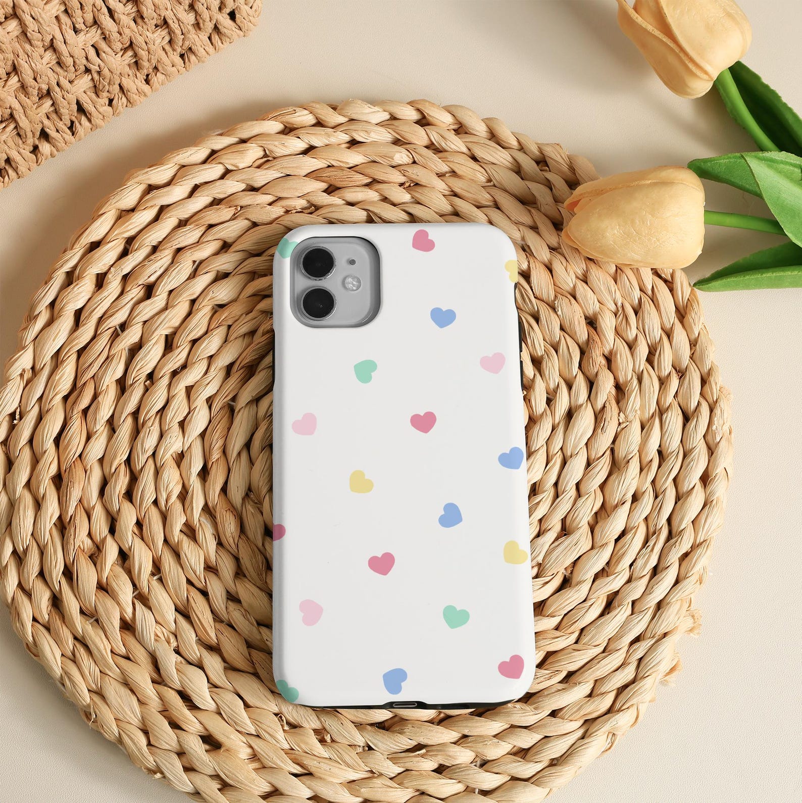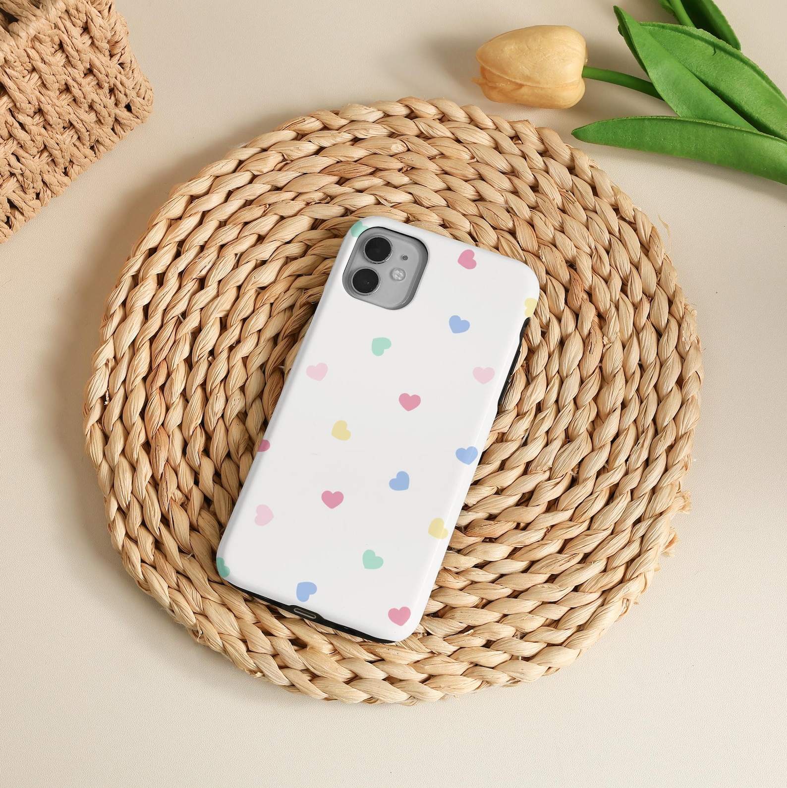Brighten your day with this playful phone case featuring a myriad of colorful hearts scattered across a crisp white background. The cheerful design adds a touch of joy while providing a stylish protection layer. Made from durable and shockproof material, it offers both functionality and flair. The glossy finish enhances the vibrant colors, making it a perfect accessory for anyone looking to express their fun side.