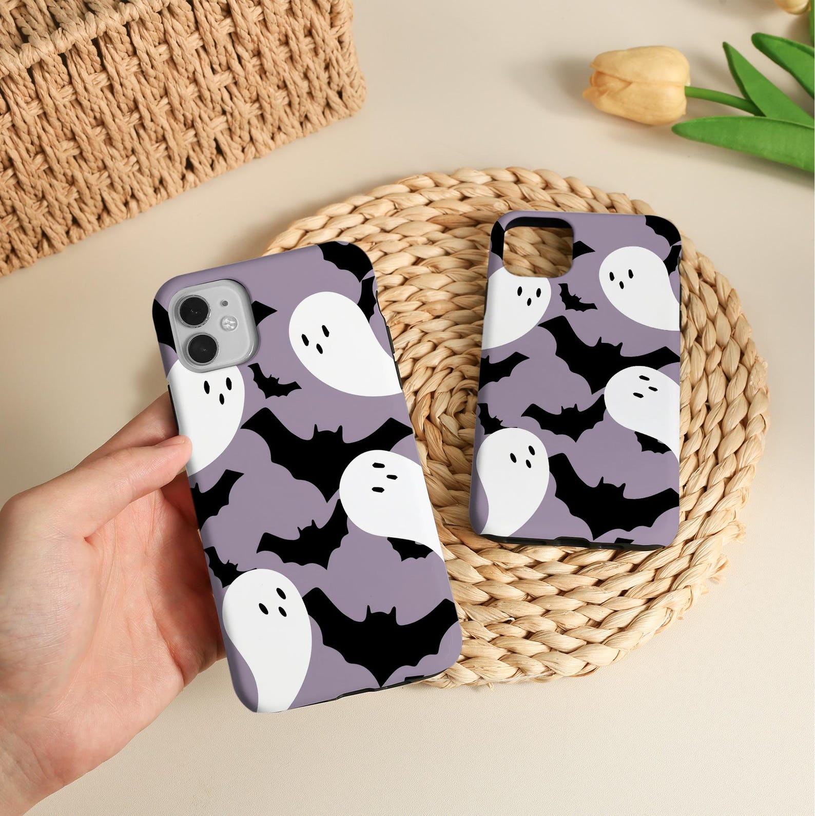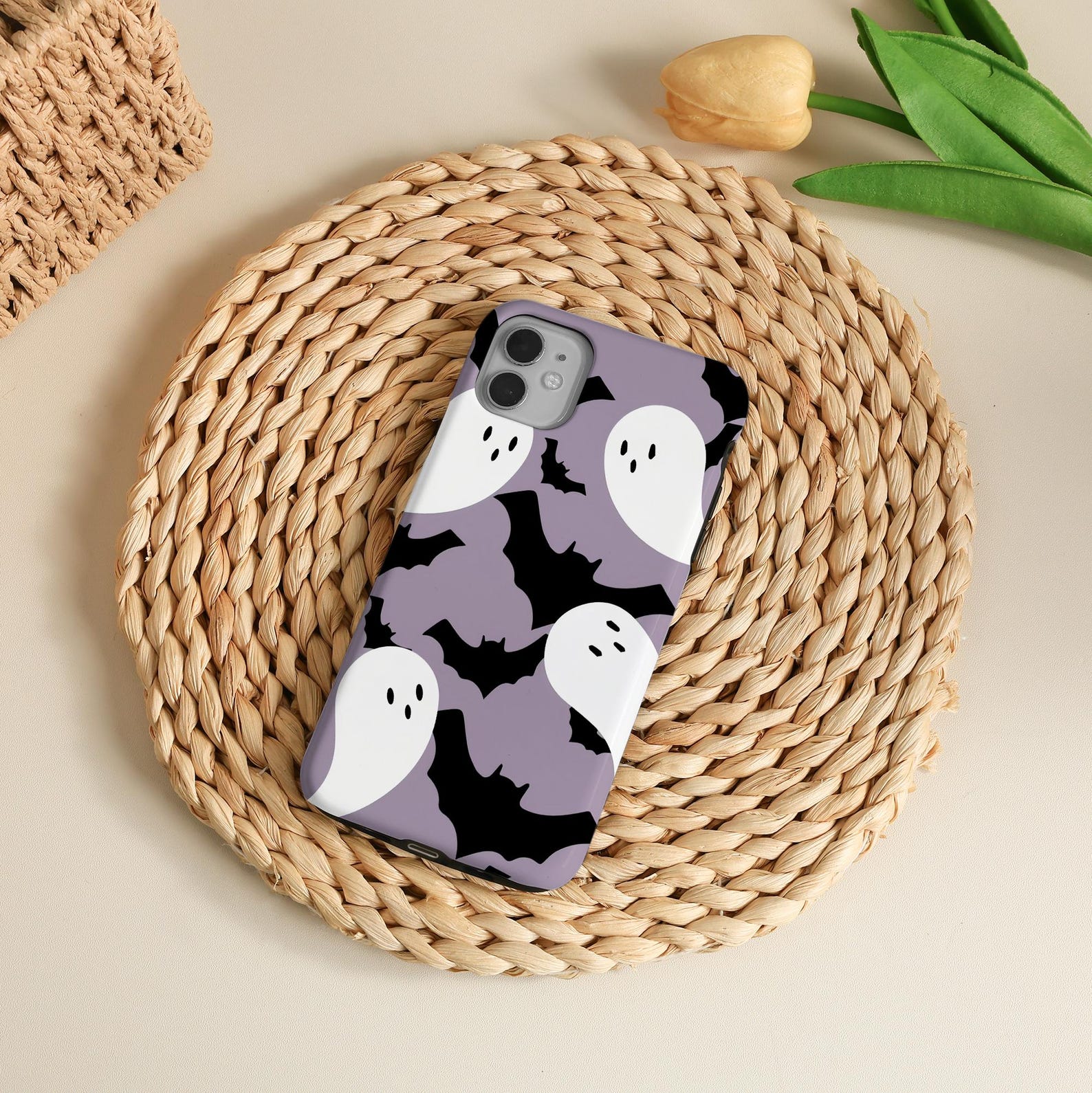 Embrace the fun and whimsical design of this playful phone case featuring adorable ghosts and bats. The soothing lavender background contrasts with bold black and white elements, creating a charming, Halloween-inspired aesthetic. Made from durable, shockproof material, this case ensures your phone stays protected while showcasing a unique style. Perfect for adding a touch of seasonal spirit to your everyday look, it’s both stylish and functional.