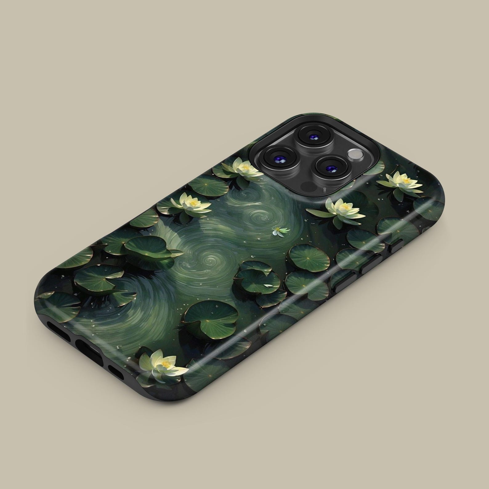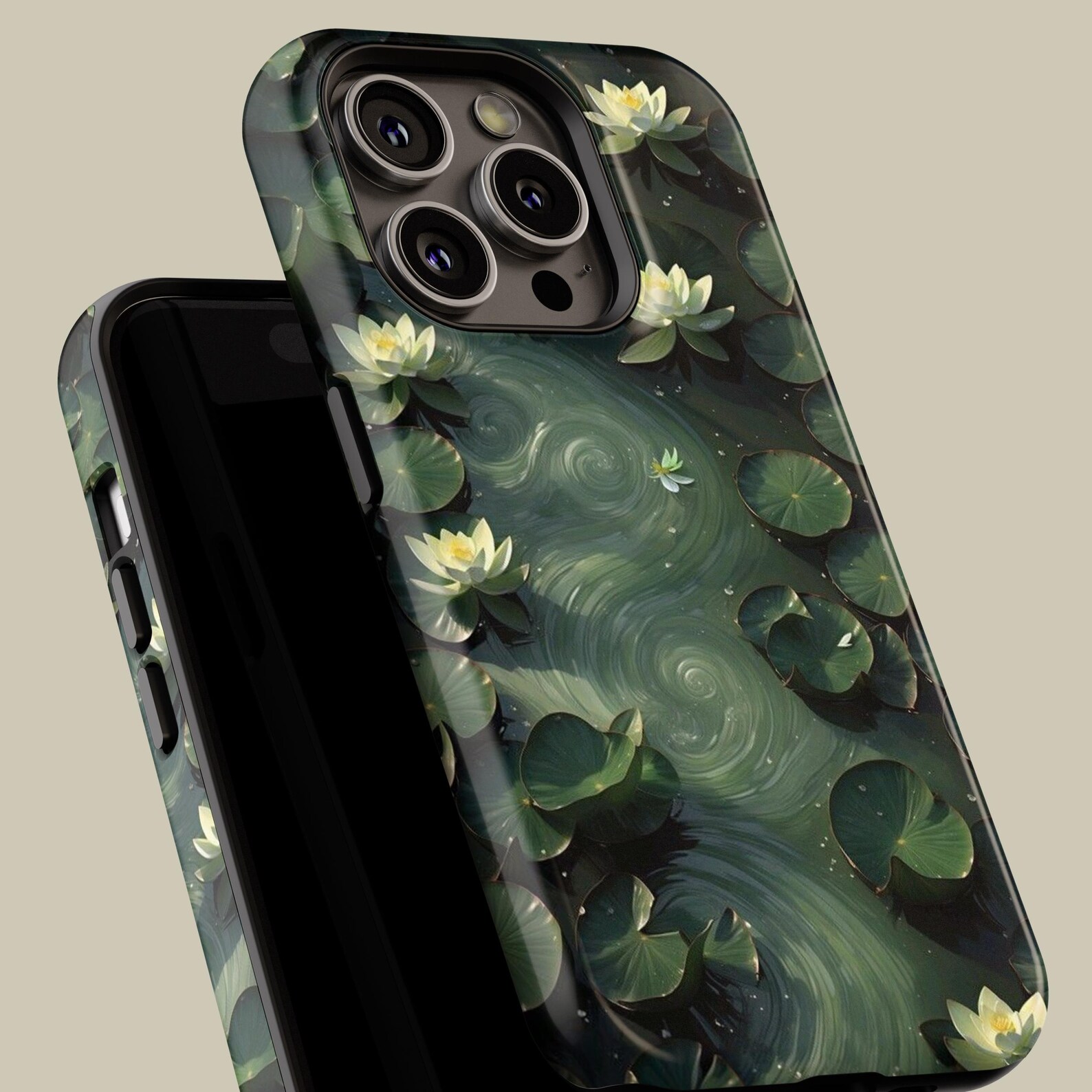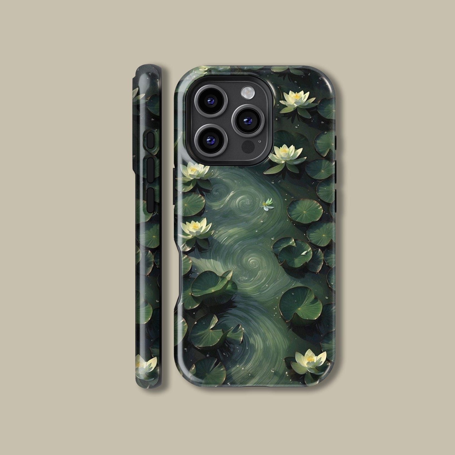 Embrace the tranquility of nature with this stunning phone case, featuring an artistic water lily design. The rich green hues and soft floral accents create a calming vibe, perfect for nature lovers. Crafted from durable materials, this case offers a shockproof shield against drops while maintaining a sleek, glossy finish. The overall impression is peaceful and stylish, making it a perfect accessory for everyday use.