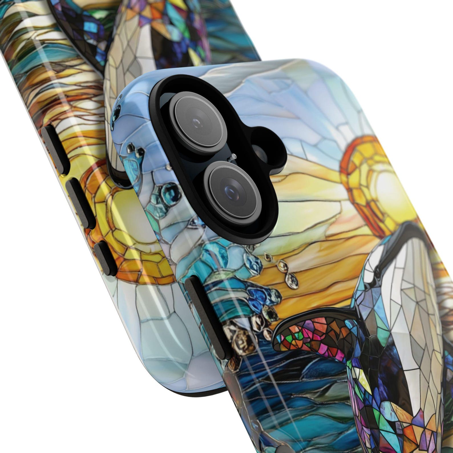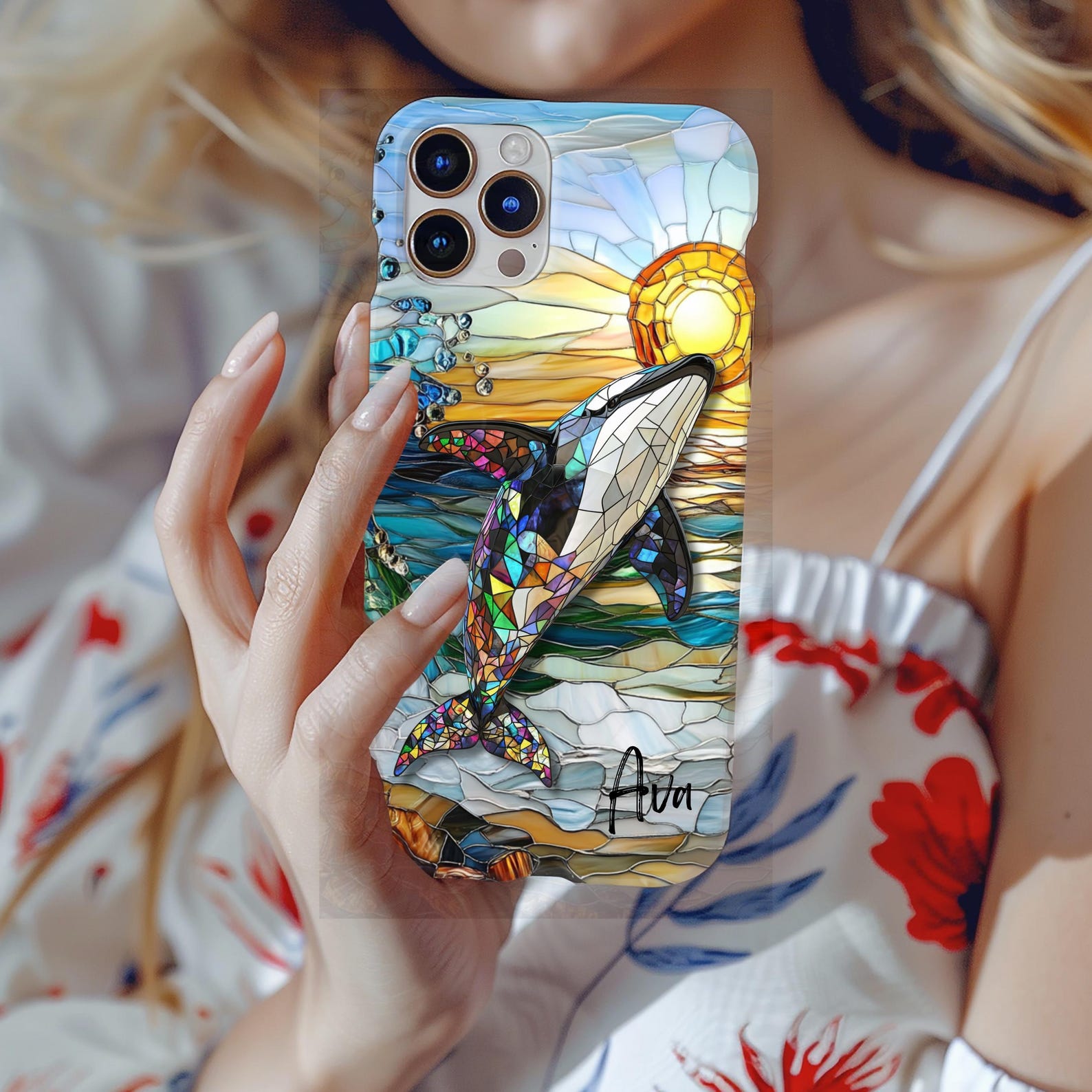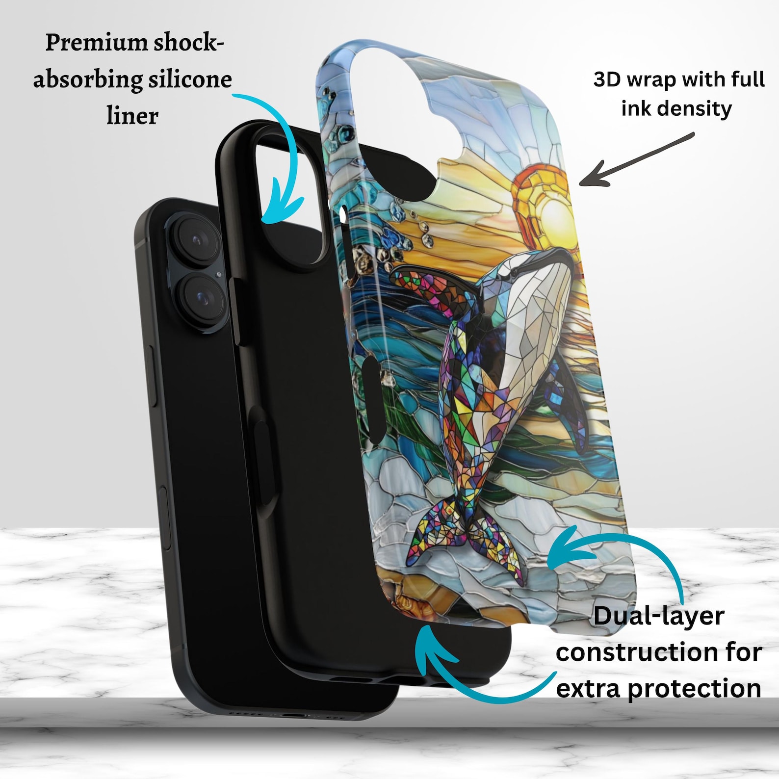 This vibrant phone case features a stunning mosaic design of a whale leaping through colorful waves under a radiant sun. The rich blues and vibrant tones create an artistic and playful atmosphere, perfect for ocean lovers. Made from durable materials, this shockproof case offers excellent protection while showcasing an eye-catching visual appeal. Its glossy finish enhances the vibrant colors, making it a stylish accessory for any phone.