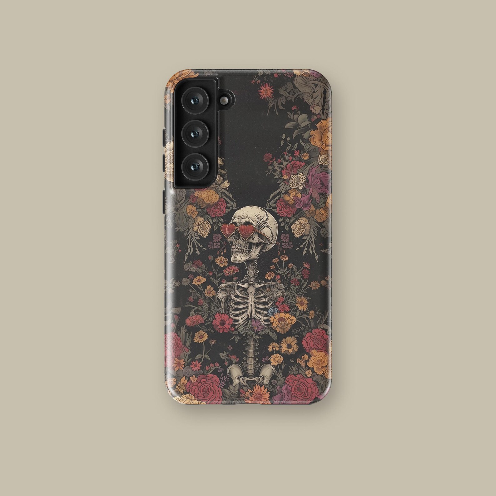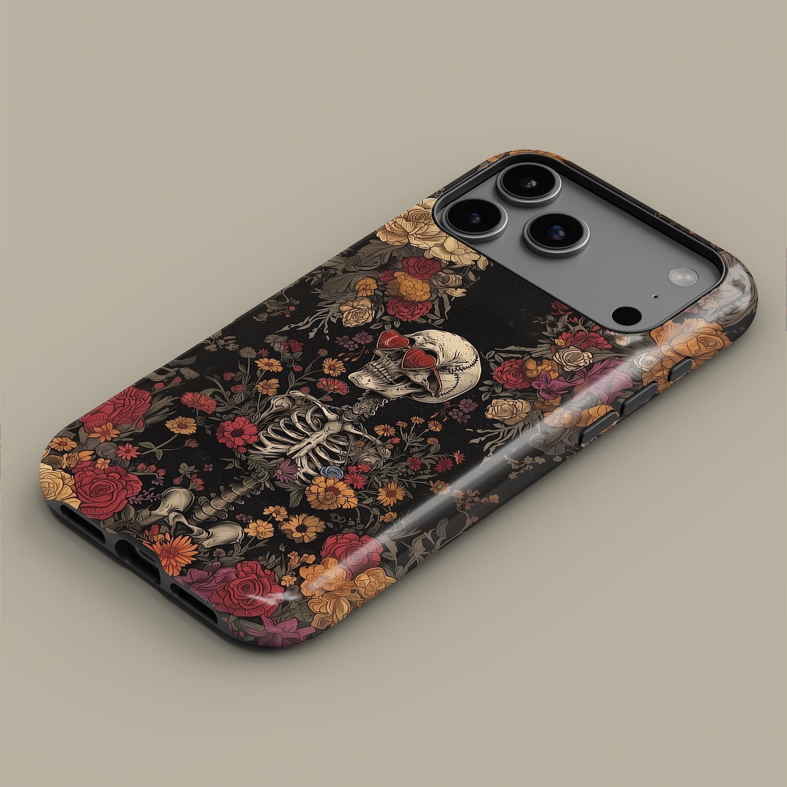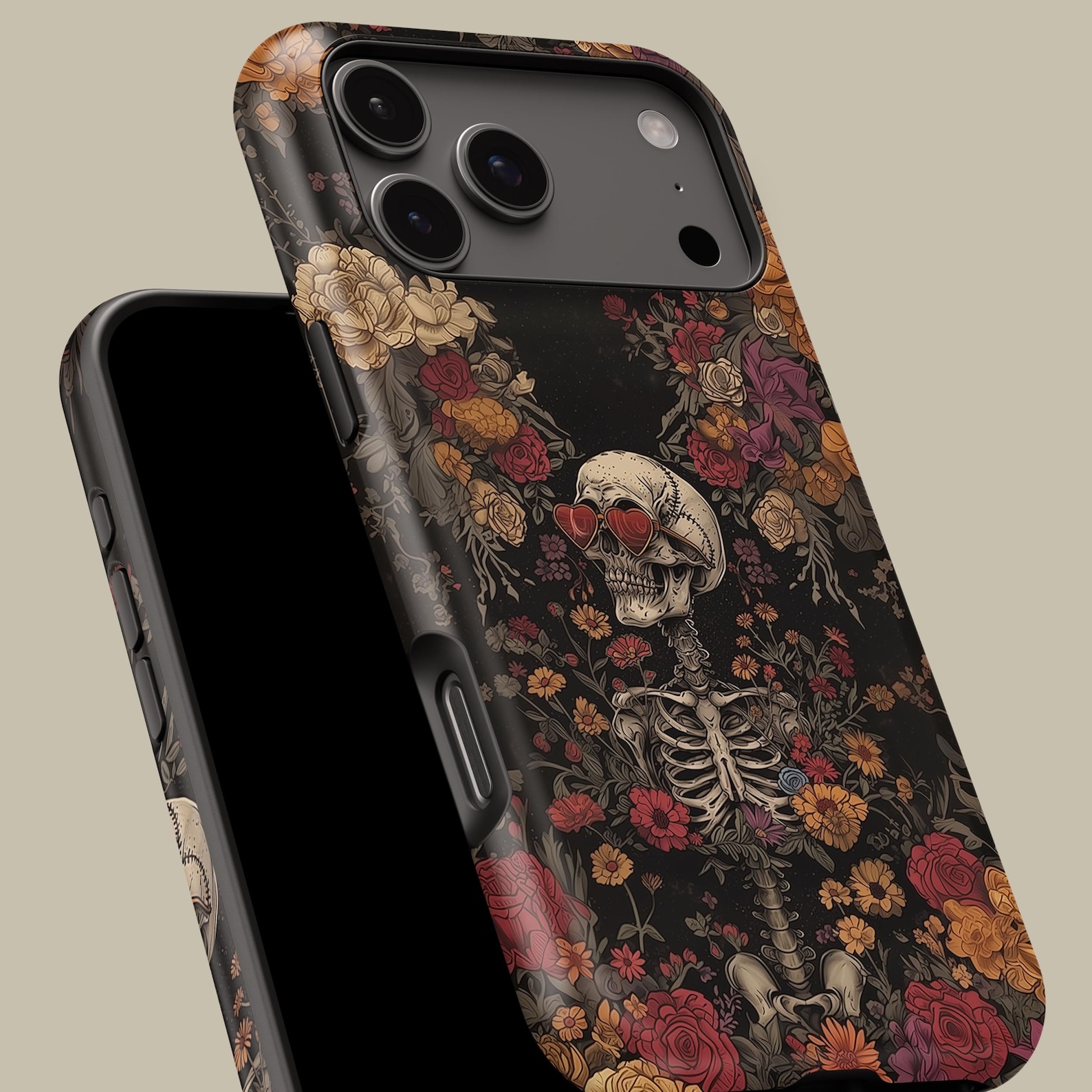 Embrace the unique blend of playful and edgy with this enchanting design featuring a skeleton adorned with shades, surrounded by vibrant floral patterns. The contrasting colors of dark backgrounds and rich floral hues create a captivating aesthetic that stands out. Made from durable materials, this case provides reliable protection while maintaining a glossy finish that enhances the intricate artwork. Perfect for those who appreciate a stylish yet bold accessory to showcase their personality.