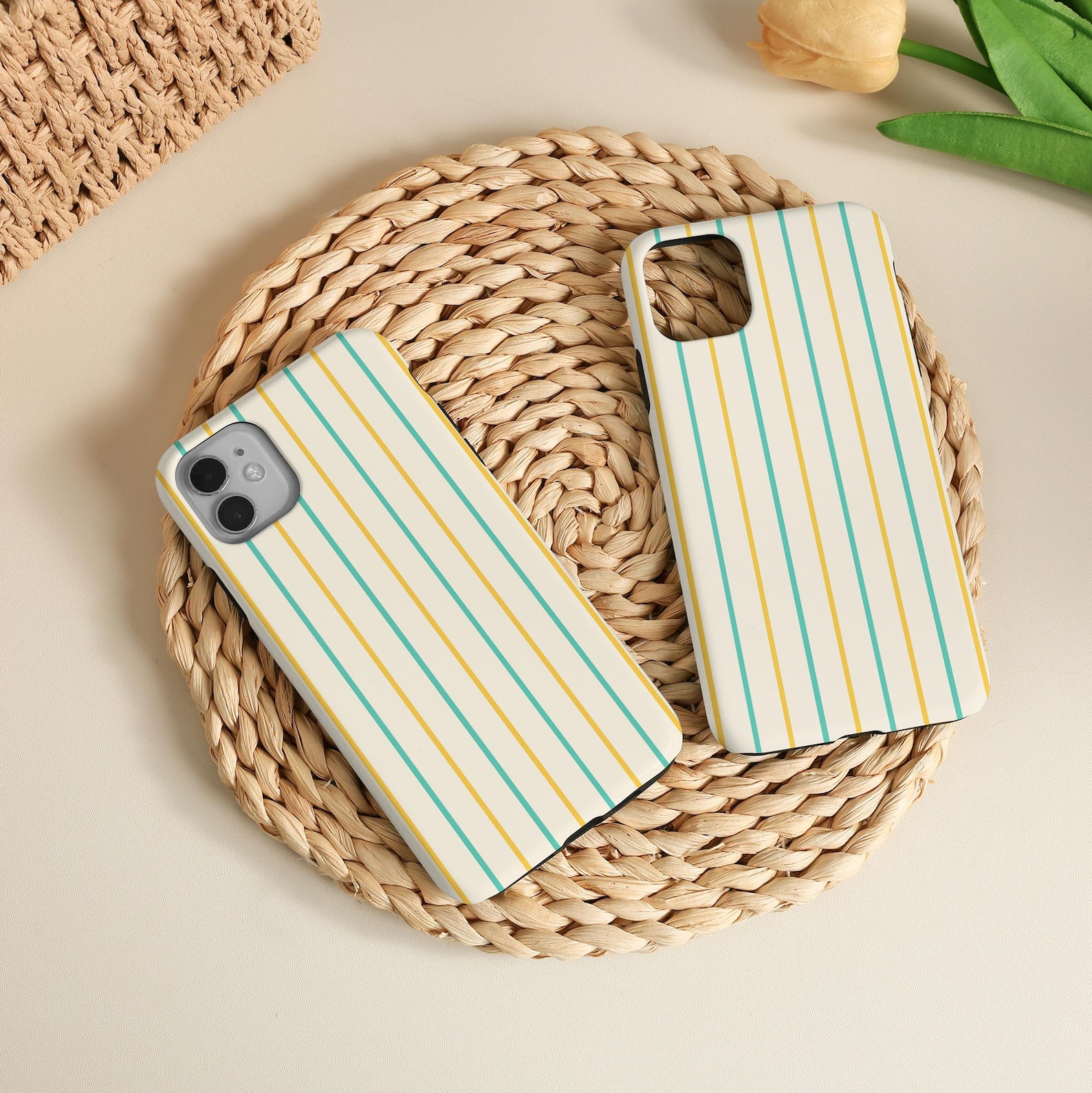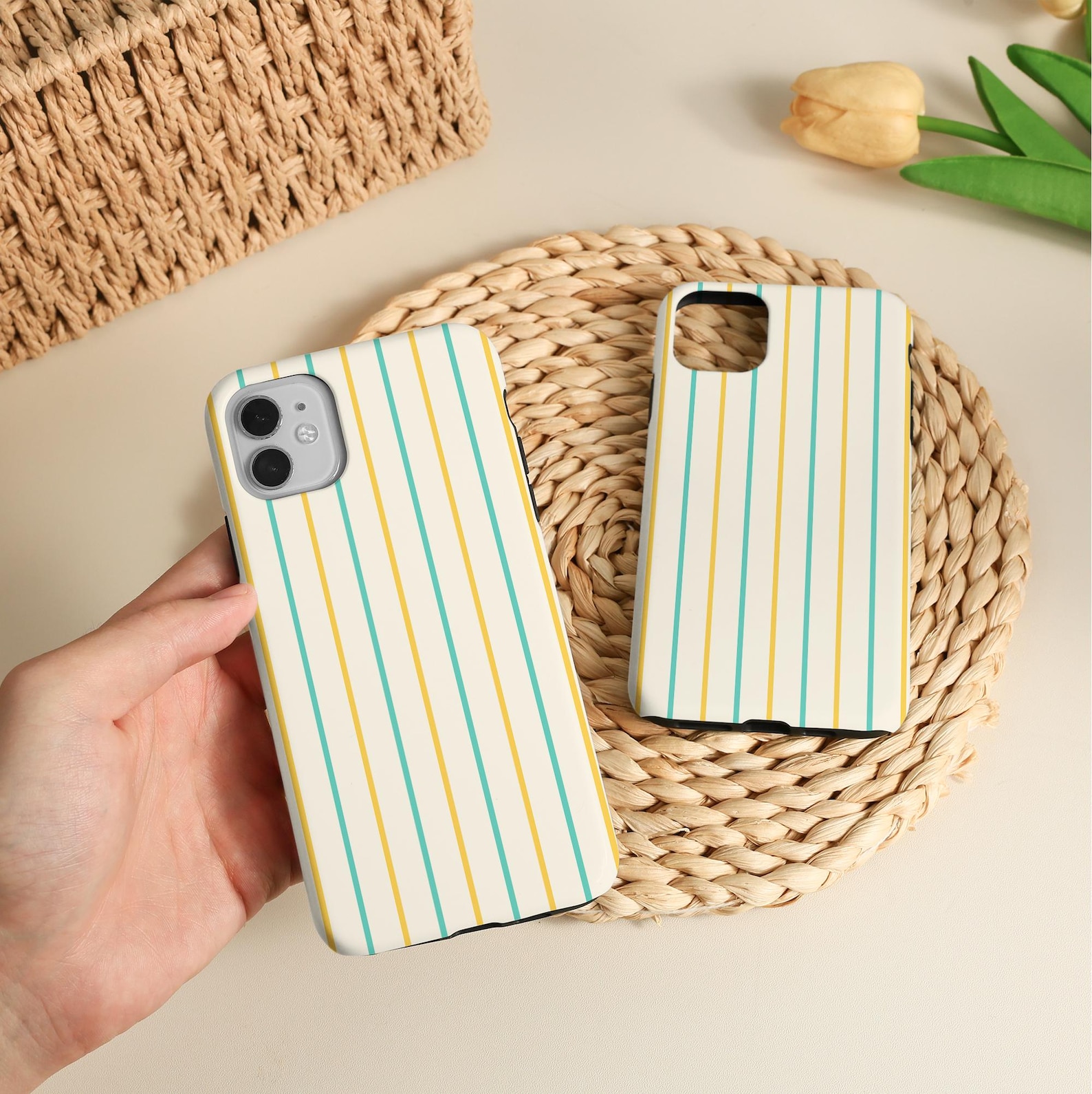 This stylish phone case features a modern striped design, combining soft yellow, green, and white colors. Made from durable material, it provides excellent protection while maintaining a sleek look. The matte texture adds a touch of sophistication, making it an ideal accessory for any fashion-forward individual. With its fresh and playful vibe, this case will enhance your everyday carry while keeping your device safe.