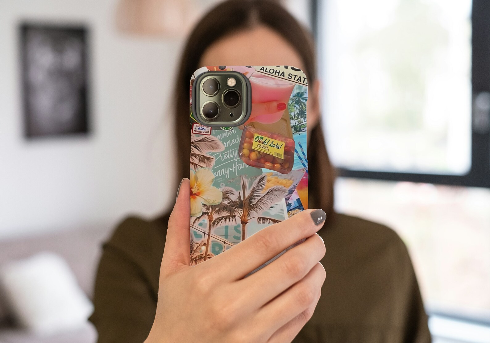 Immerse yourself in a vibrant fusion of tropical elements with this stunning phone case. Featuring a lively collage of palm trees, hibiscus flowers, and refreshing cocktails, the design exudes a playful and carefree spirit. The glossy finish not only highlights the bright colors but also provides a durable, shockproof layer for your device. Perfect for anyone looking to add a touch of summer to their everyday life, this case combines both style and protection in one eye-catching accessory.