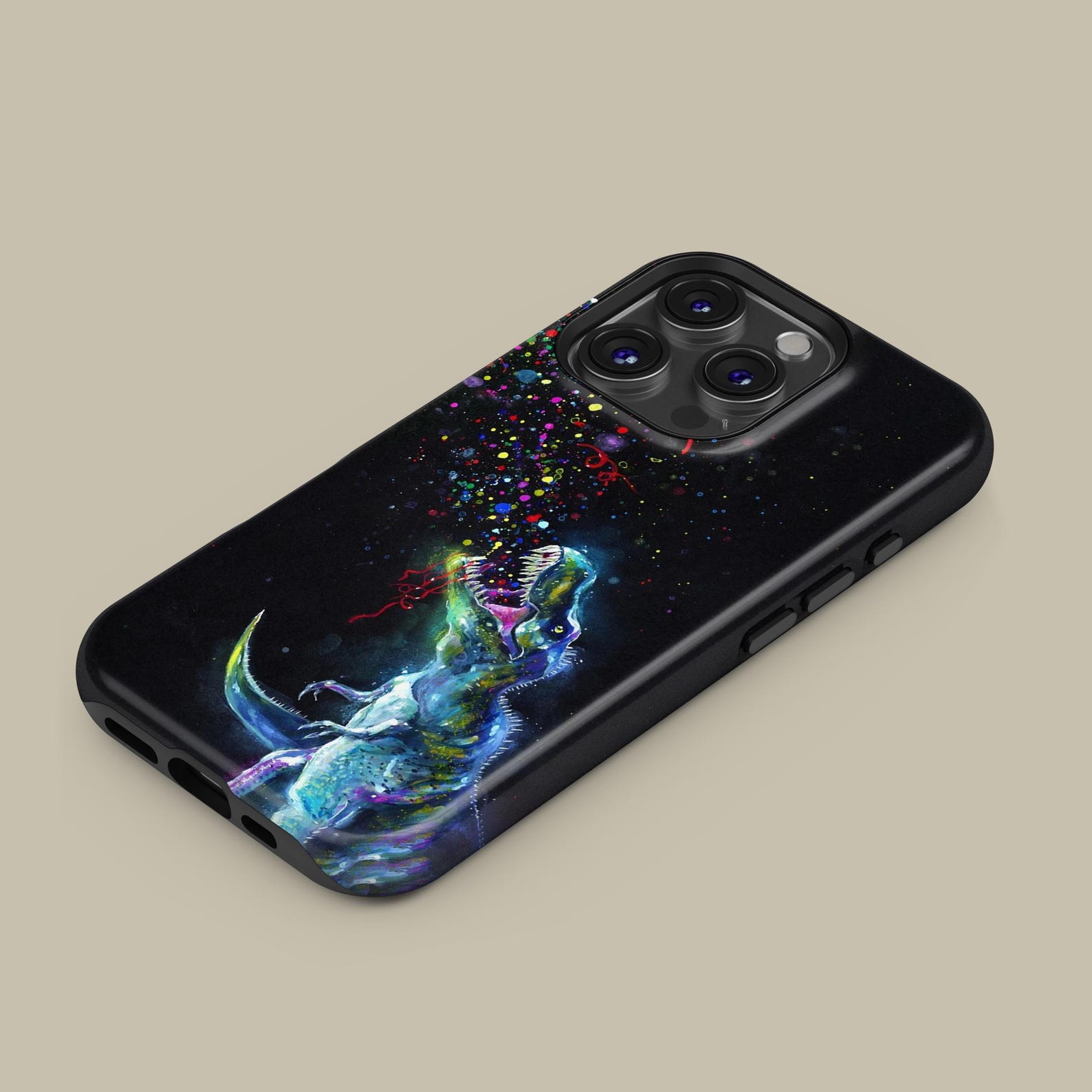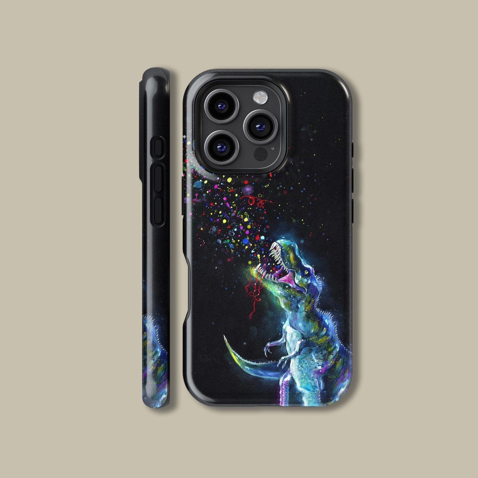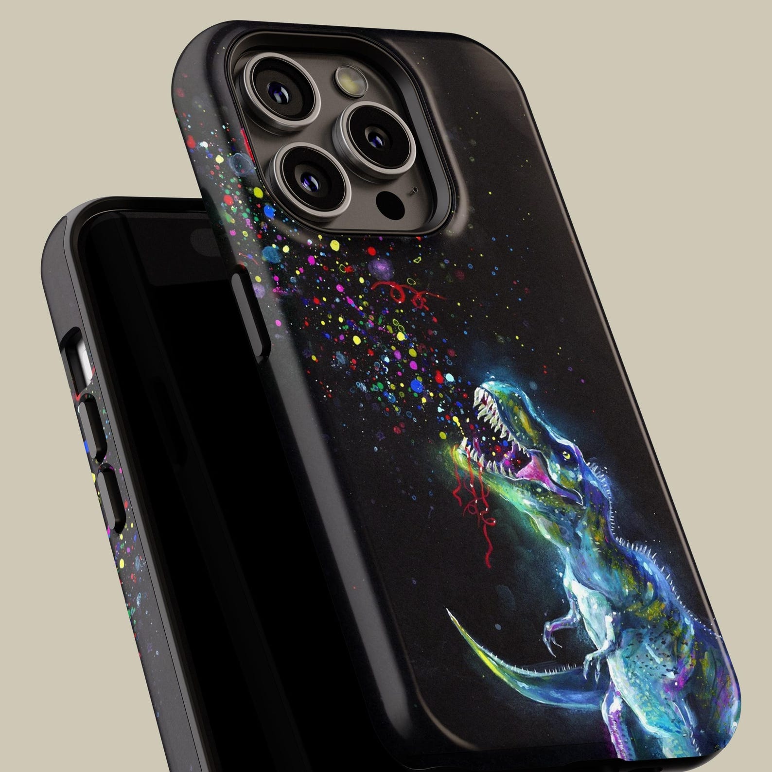 This playful tough phone case features a stunning and vibrant dinosaur design that bursts with color. Set against a sleek black background, the artwork showcases a cheerful dinosaur unleashing a shower of confetti in a whimsical celebration. The material is durable and offers a matte finish, providing both protection and style. This case is perfect for adding a fun and modern touch to your accessories while ensuring your phone stays safe.