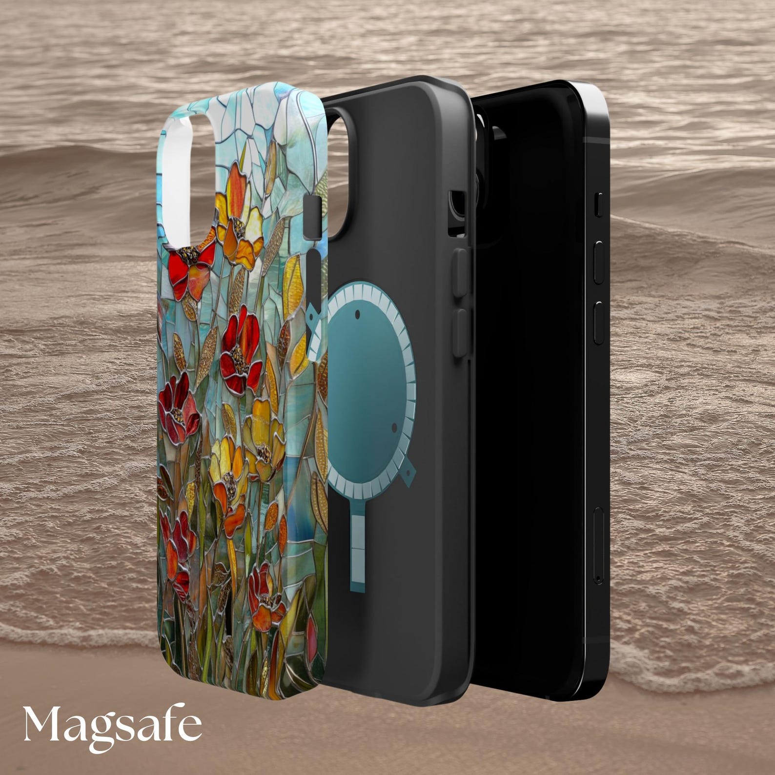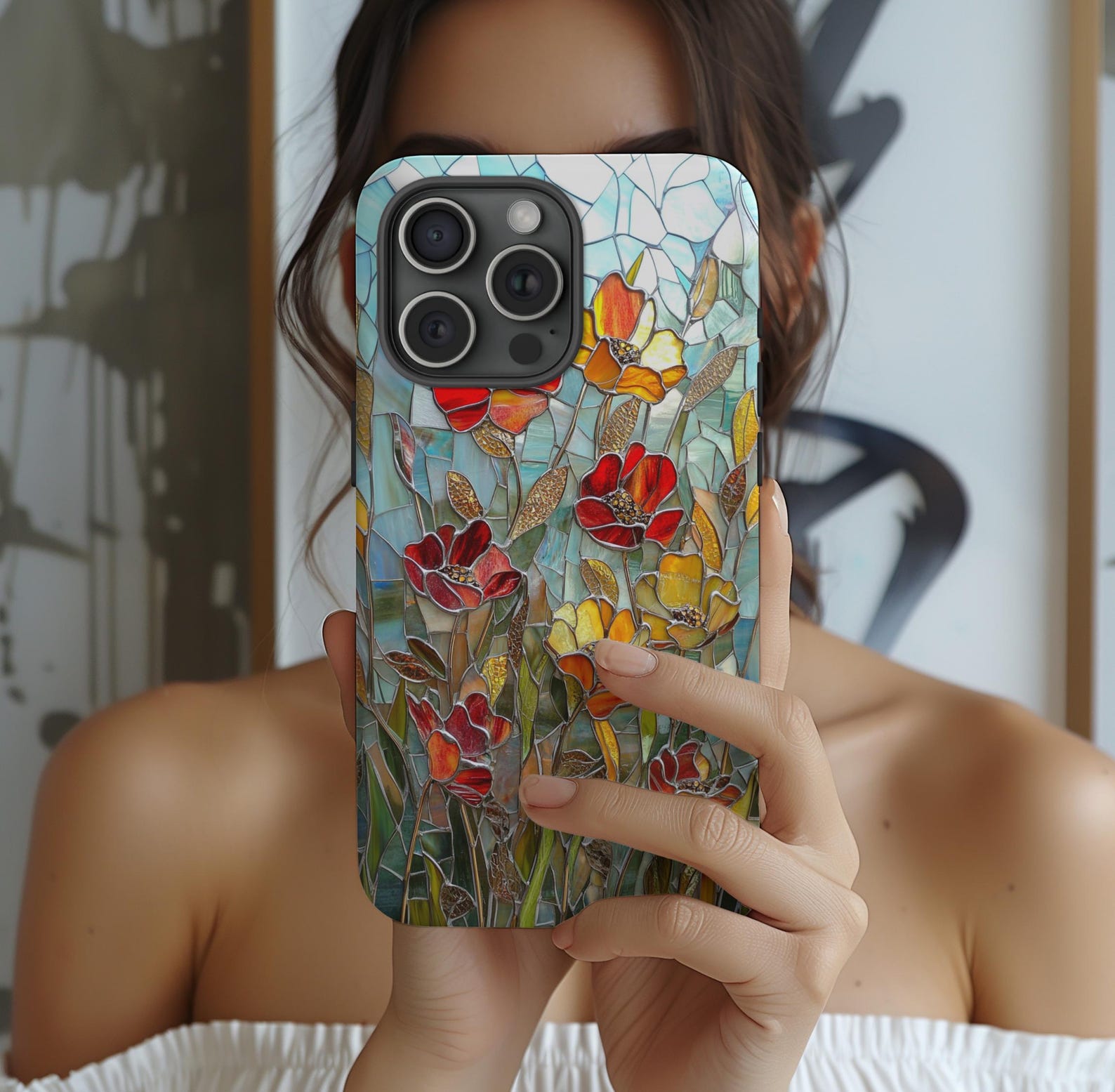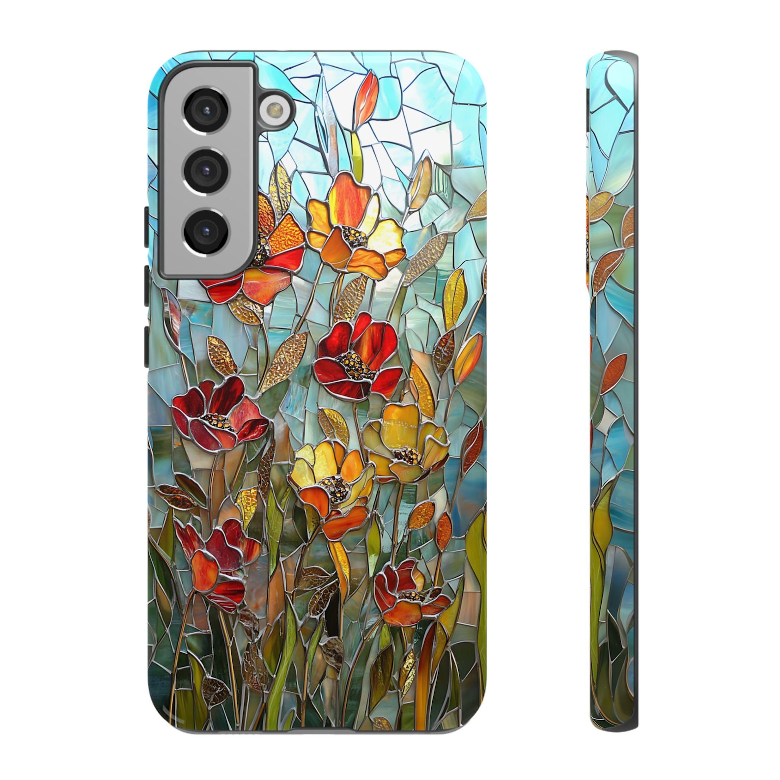 This phone case features a stunning floral mosaic design that brings a burst of color to your everyday essentials. The vibrant red, yellow, and orange flowers contrast beautifully against a soft, turquoise background, creating an eye-catching masterpiece. Made from durable materials, this case offers reliable protection while showcasing a glossy, textured finish. Perfect for those who appreciate artistic expression and want their phone to stand out in style.
