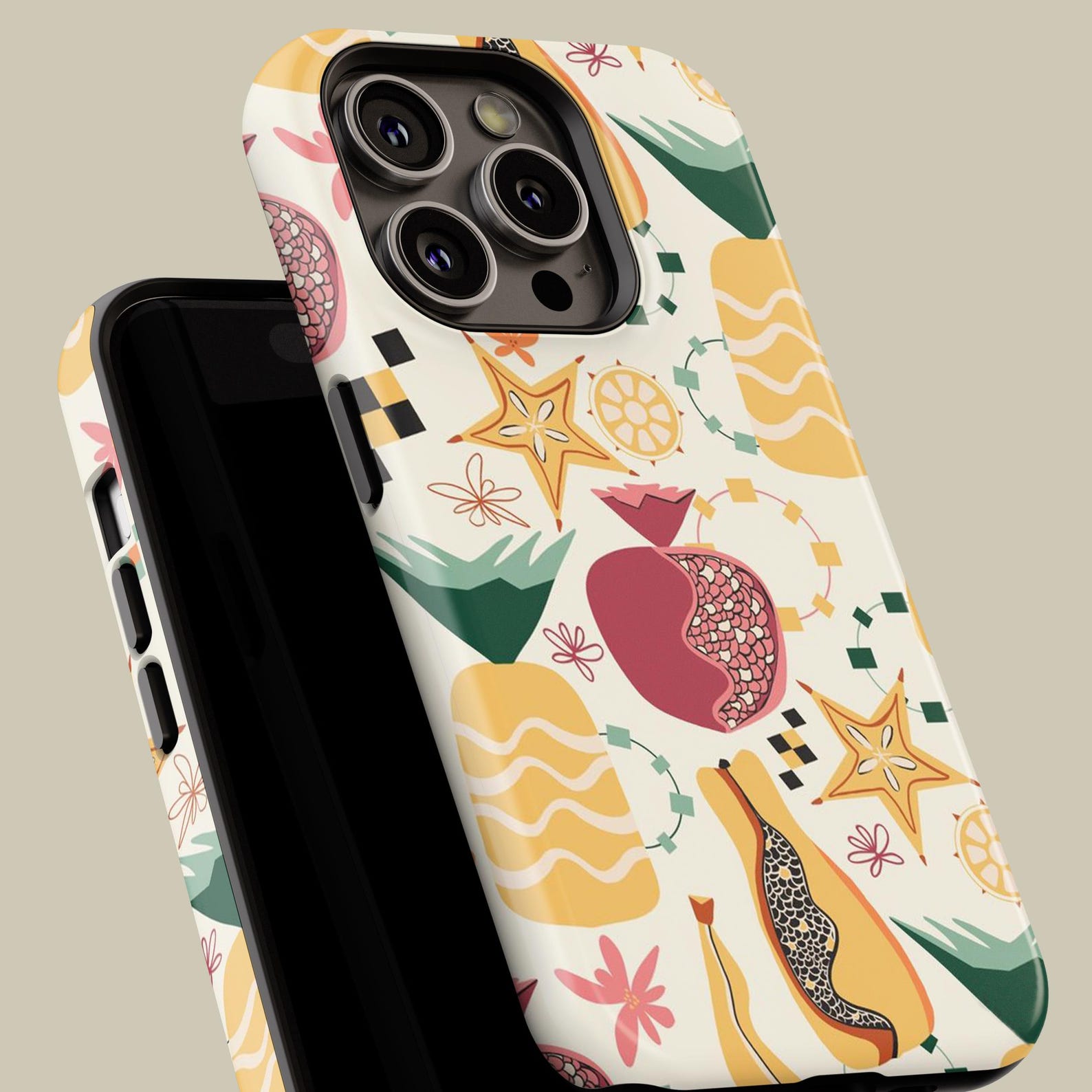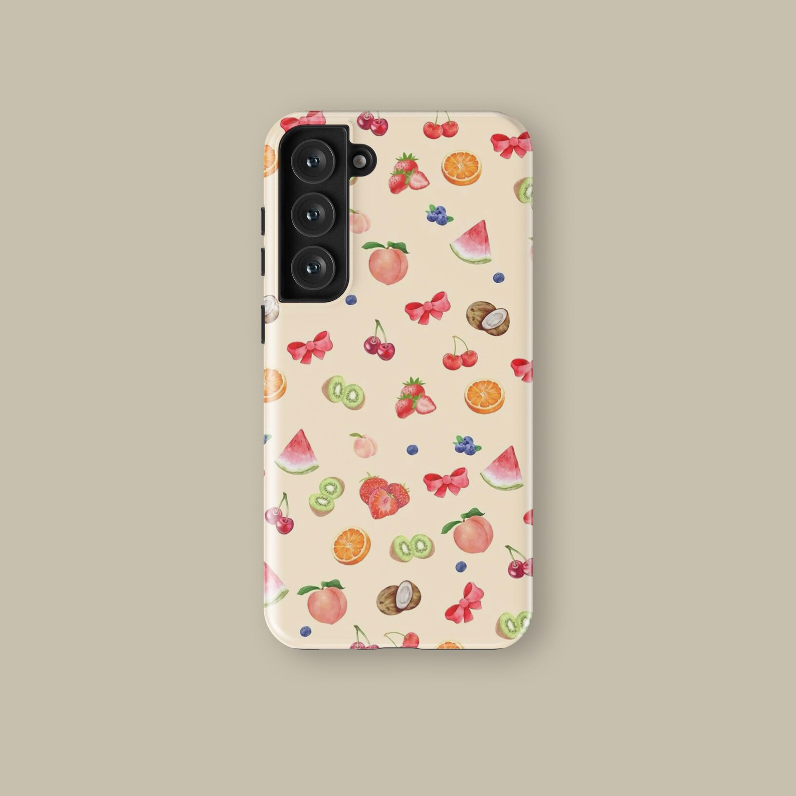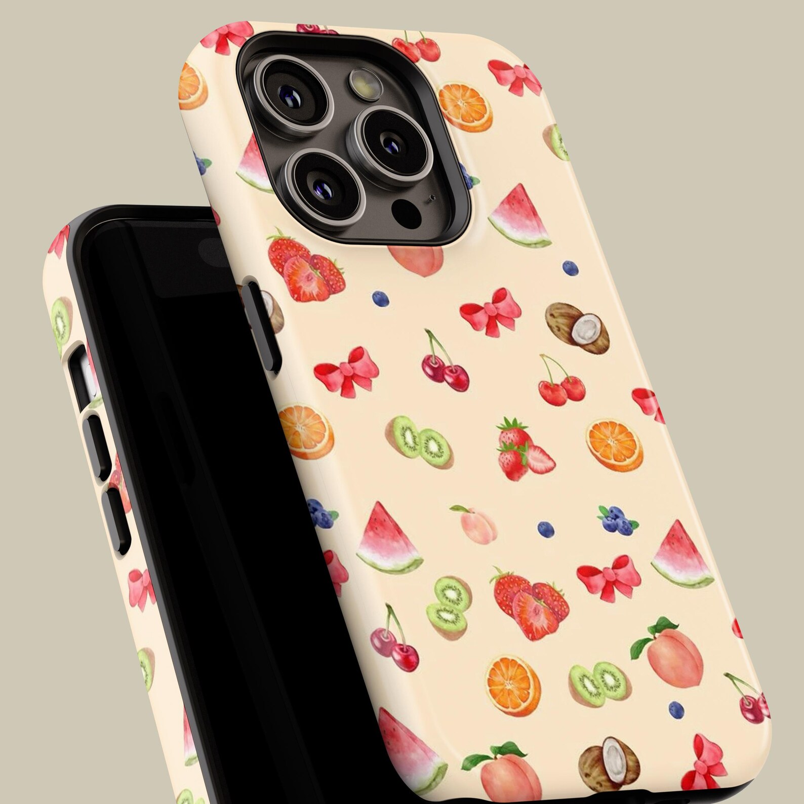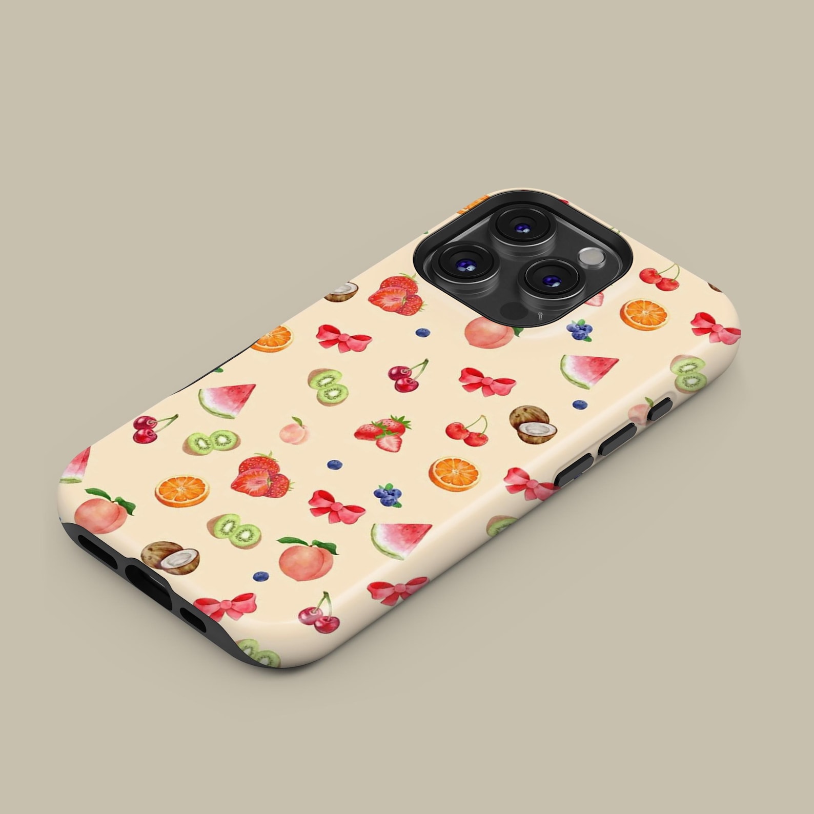 This playful phone case features a delightful array of colorful fruits, including strawberries, cherries, and citrus, set against a soft peach background. The design embodies a cheerful and fresh aesthetic, perfect for those who love to add a splash of fun to their accessories. Crafted from durable materials, this case offers excellent protection with a smooth, matte finish that feels great in your hand. Its lively vibe makes it ideal for anyone looking to express their personality while keeping their phone safe.