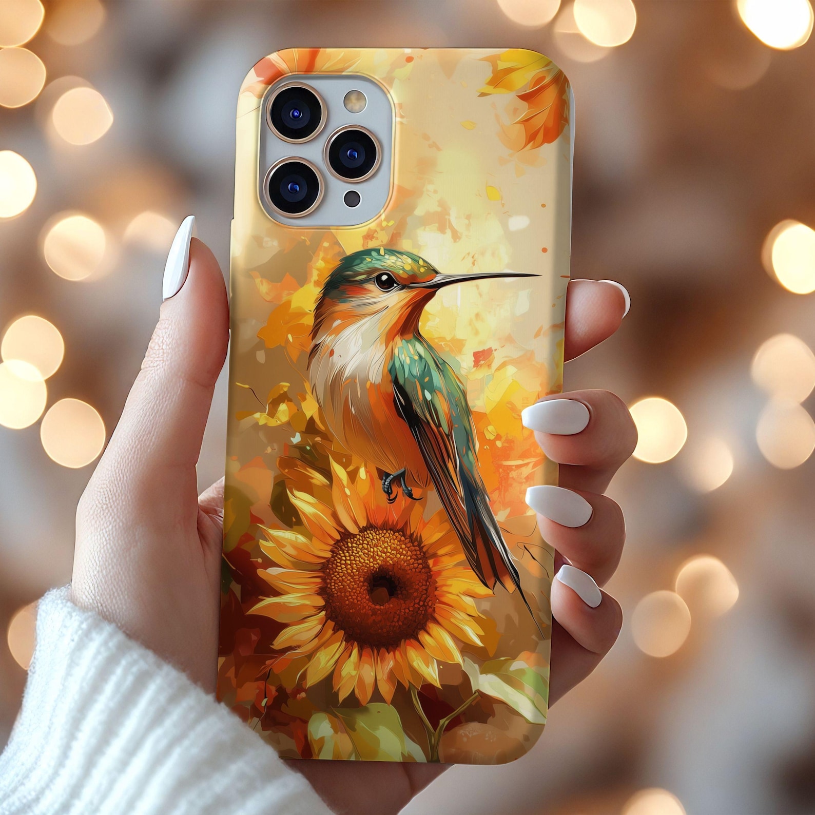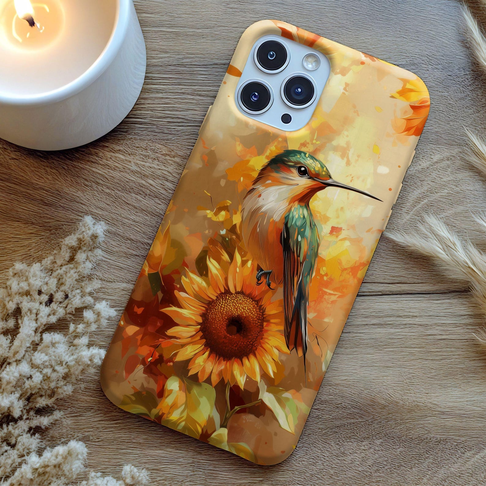 This stunning phone case features a vibrant design highlighting a beautiful hummingbird perched on a sunflower. The warm color palette includes rich yellows and soft greens, creating a cheerful and nature-inspired aesthetic. Crafted from durable materials, this case provides excellent shock resistance while maintaining a sleek, glossy finish. Ideal for nature lovers, it adds a playful yet stylish touch to any phone, making it a perfect accessory for your everyday adventures.