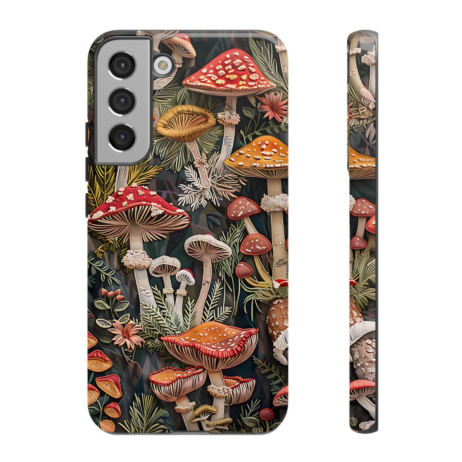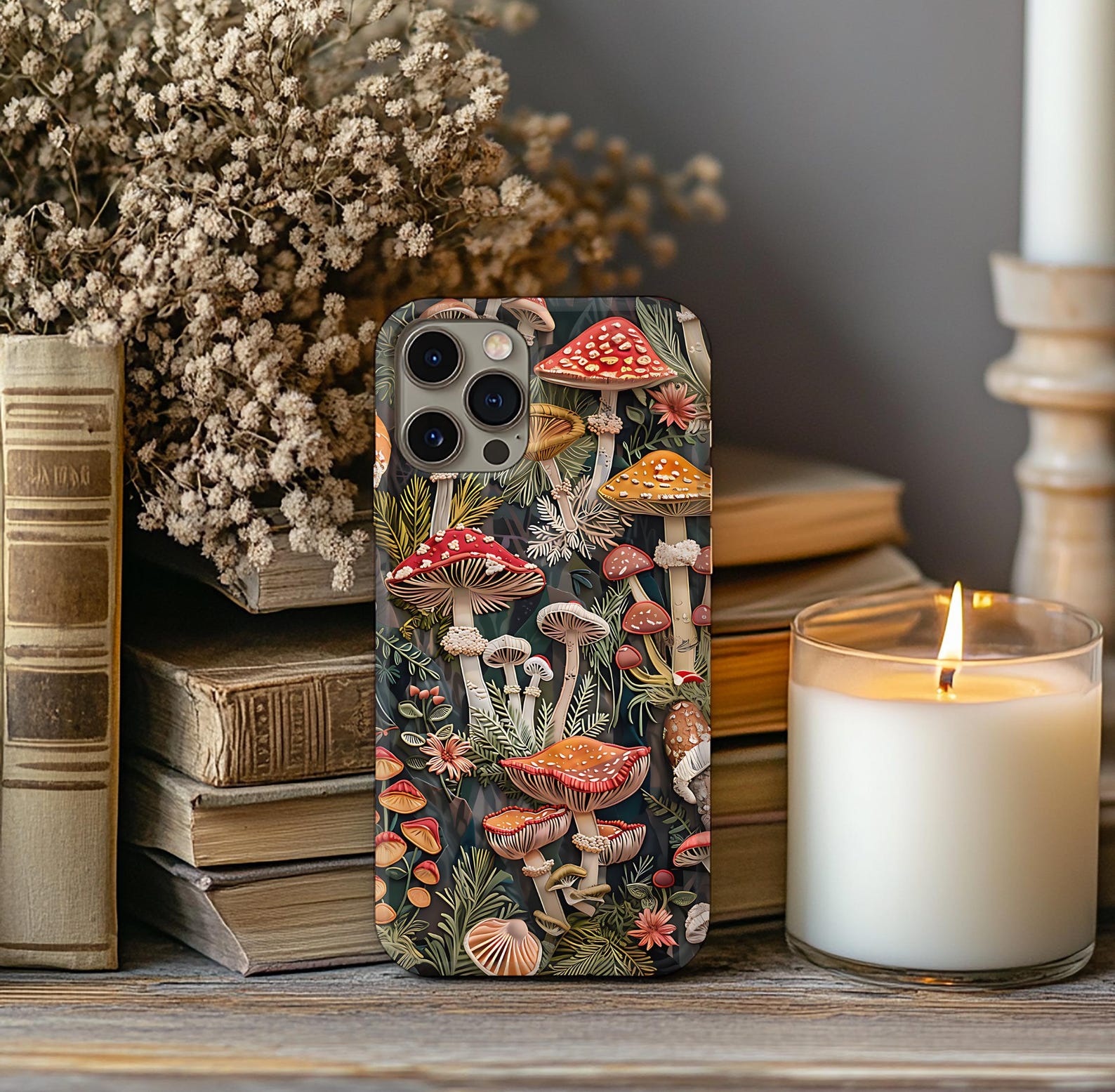 This phone case features a stunning and whimsical design of colorful mushrooms intertwined with lush greenery. The rich, earthy tones create a playful yet sophisticated vibe, perfect for nature lovers. Made from durable materials, it offers excellent protection while maintaining a glossy finish that highlights the intricate details. Elevate your style with this unique accessory that combines artistic flair and robust functionality.