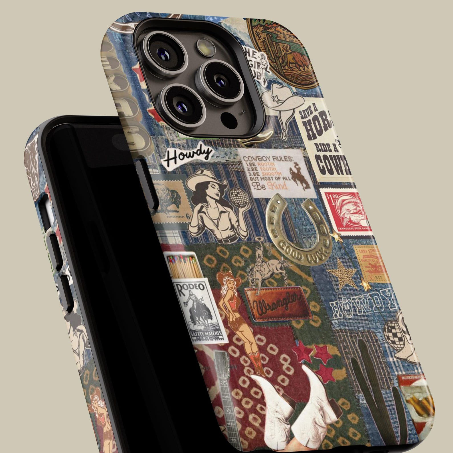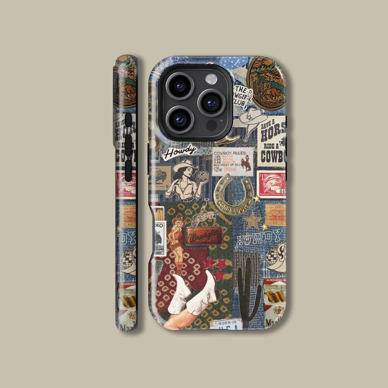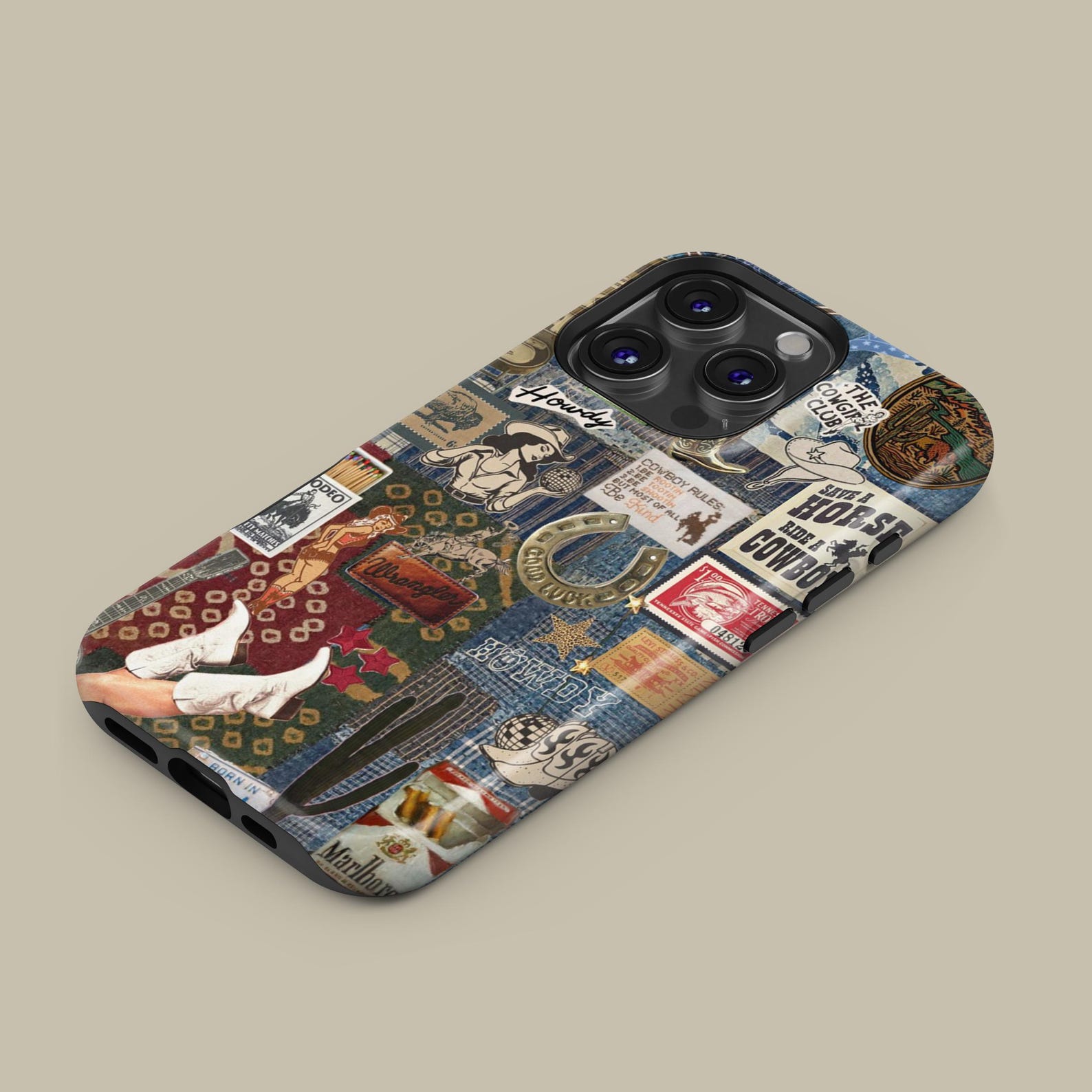 Embrace a rustic charm with this vintage cowboy art collage phone case. Featuring vibrant illustrations of rodeo themes, horseshoes, and classic western motifs, it captures the spirit of the Wild West. Made from durable material, this case offers a glossy finish that not only looks stylish but also protects your device from daily wear and tear. The eclectic design gives it a unique, adventurous vibe, perfect for those who love country aesthetics.