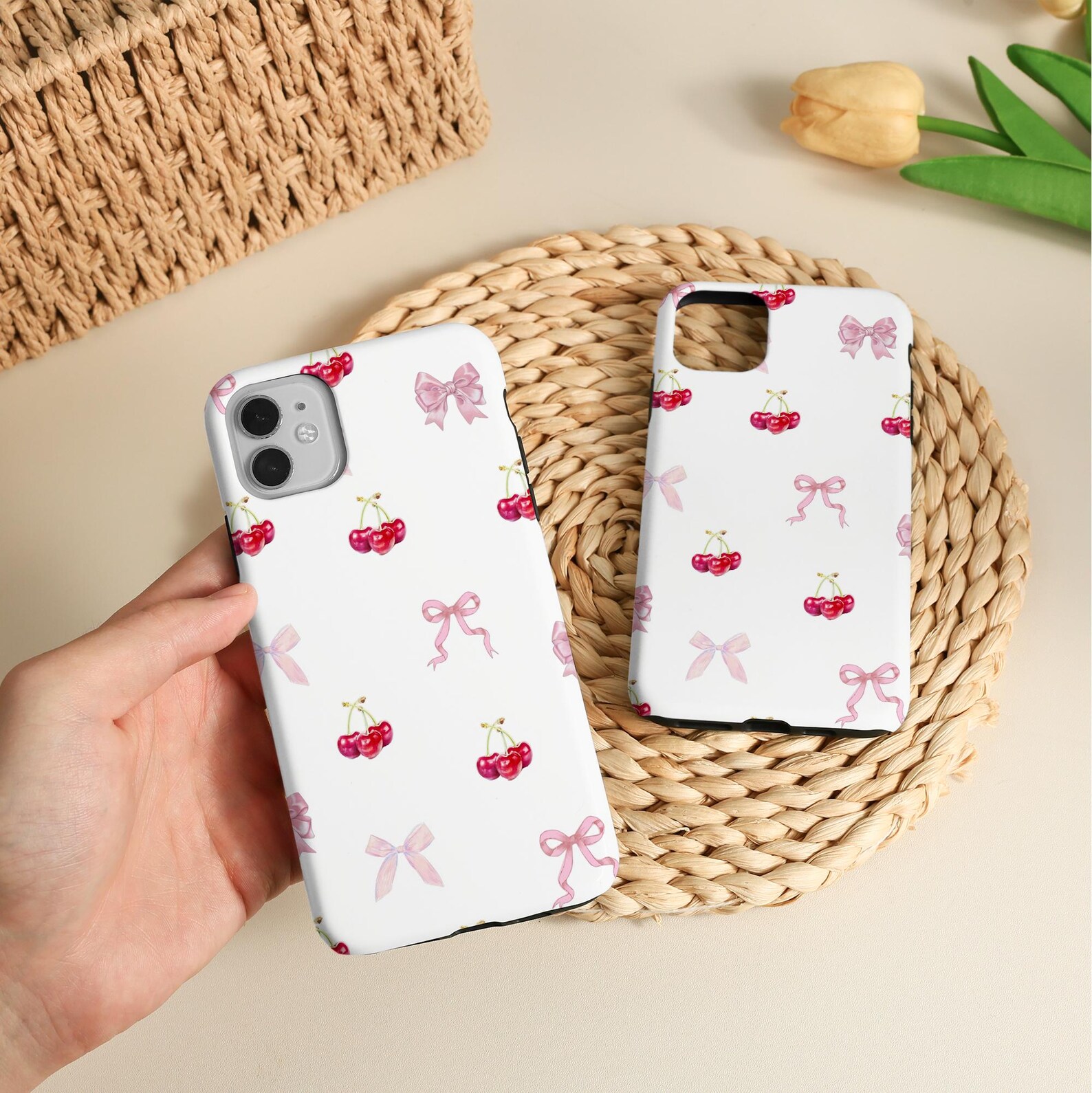 Embrace a playful elegance with this charming phone case featuring a delightful pattern of cherries and pink bows. The soft pastel colors bring a vibrant yet sweet touch, making it perfect for those who appreciate a fun and stylish aesthetic. Made from durable, shockproof material, this case not only protects your device but also adds personality to your everyday look. With a glossy finish, it offers a modern vibe that complements any outfit beautifully.